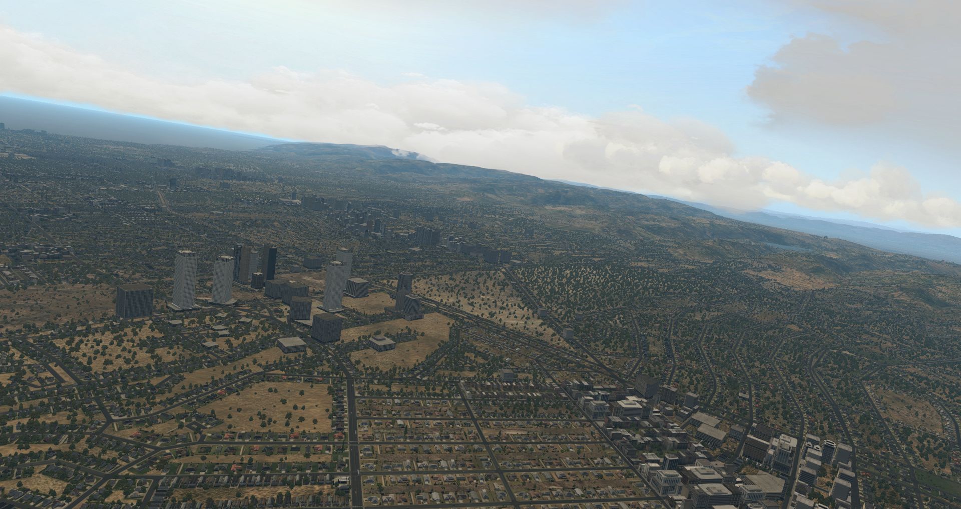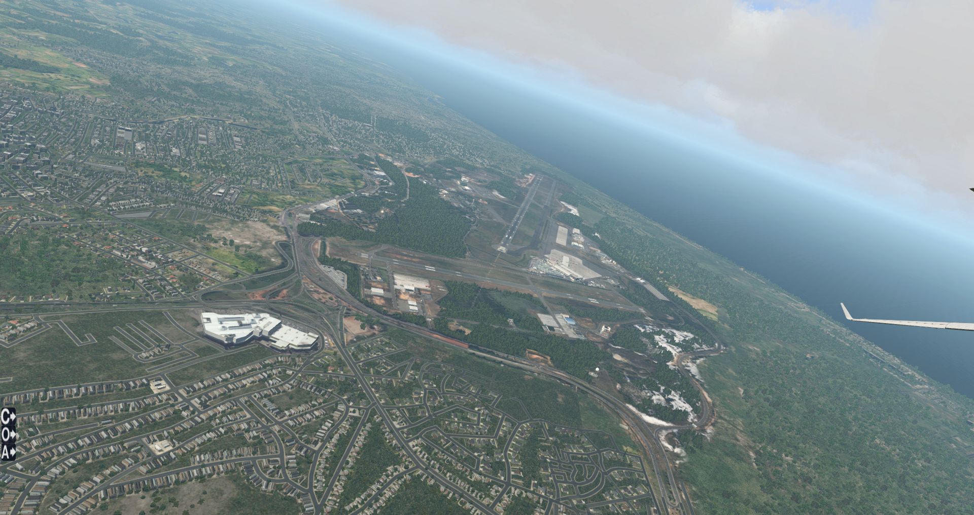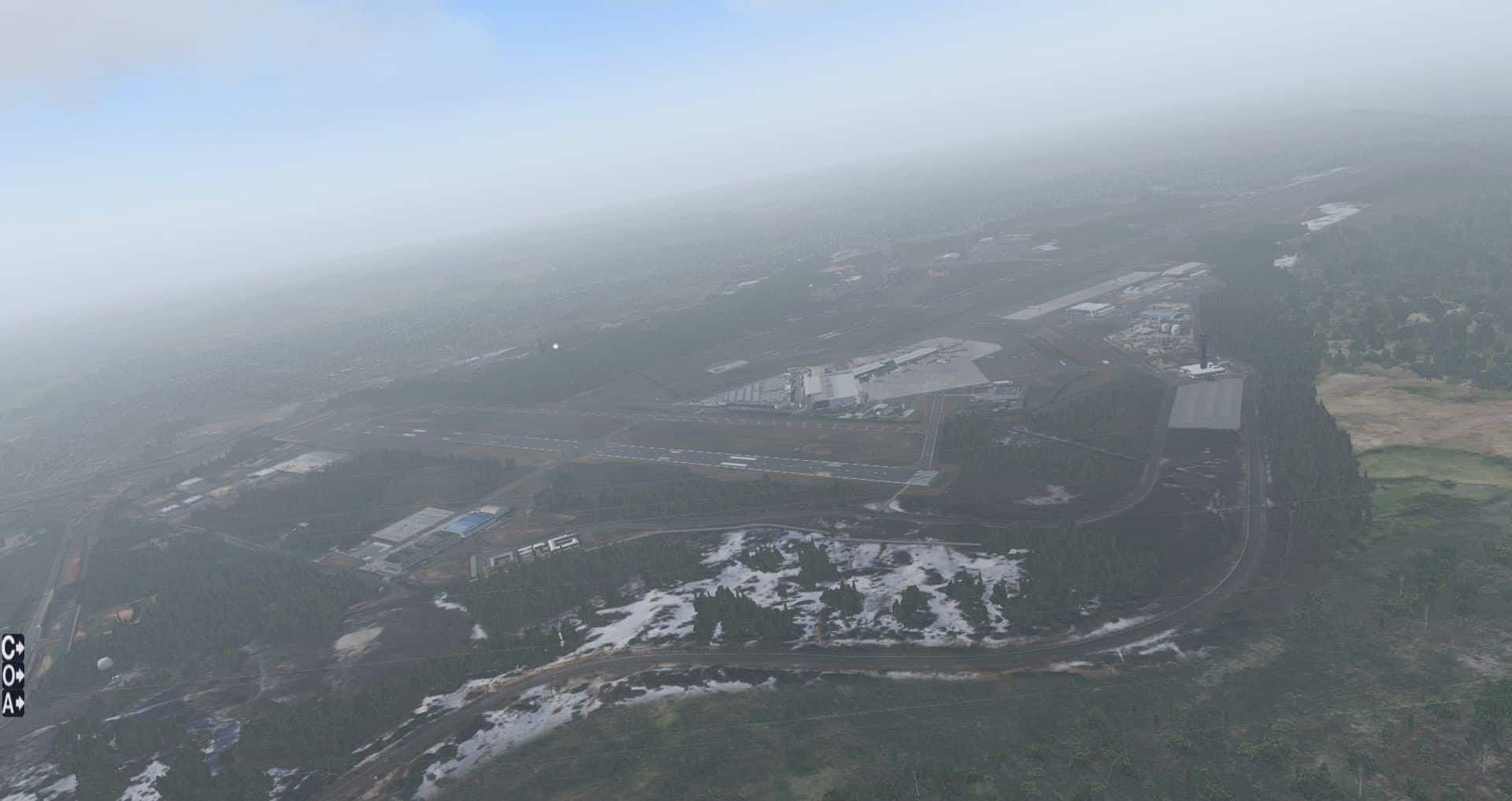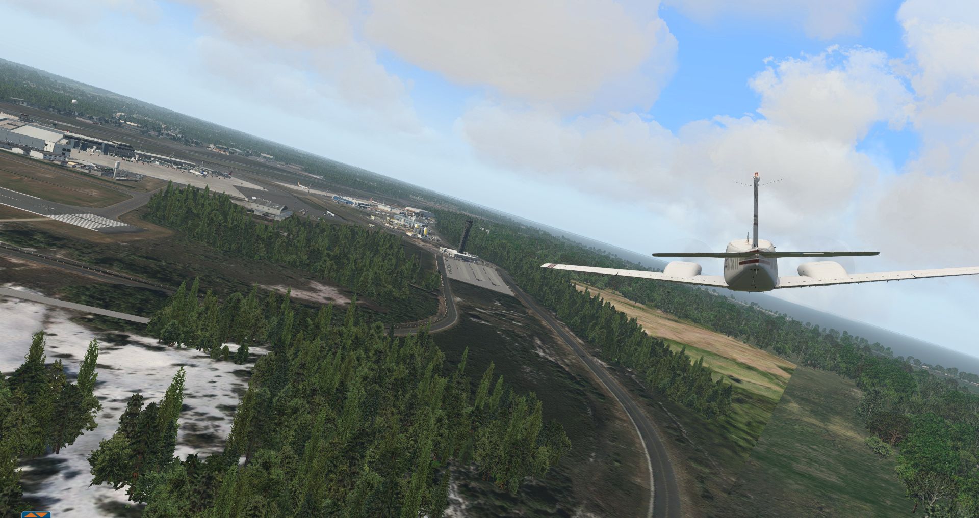 Direkt außerhalb der Bodentextur übernimmt das AutoGen die Kontrolle. Wenn wir uns dem Flughafen wieder nähern fällt auch der dezente Einfluss des Custom Mesh auf.