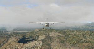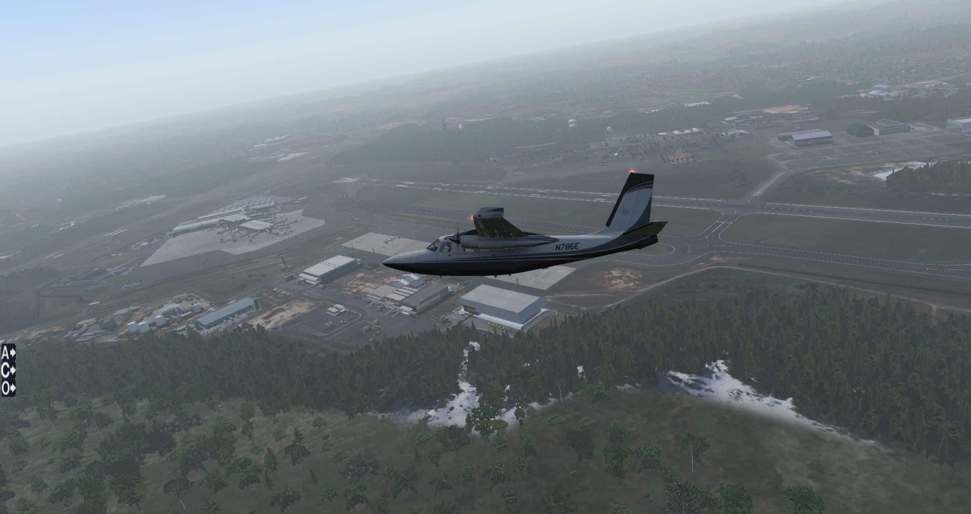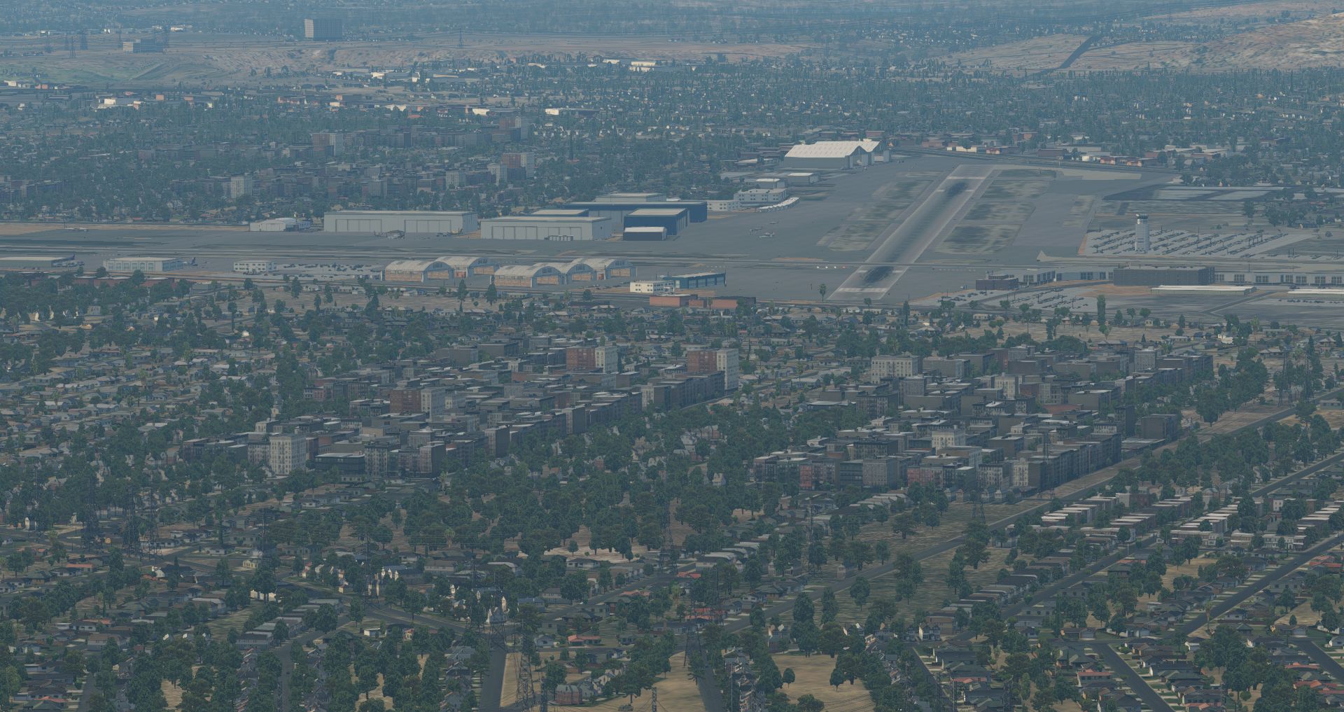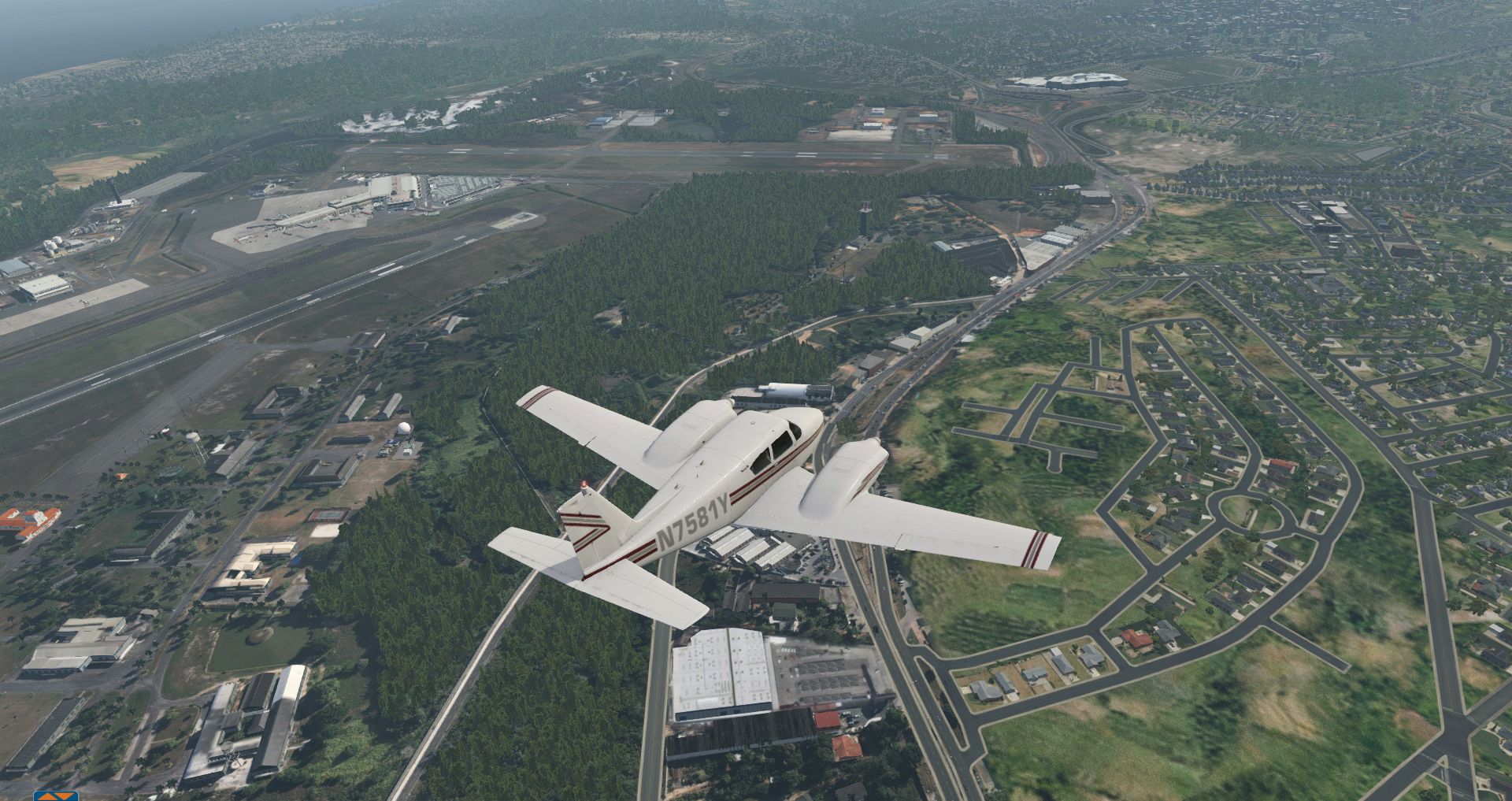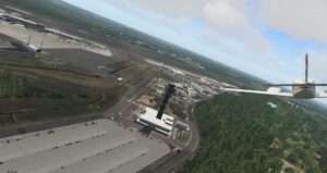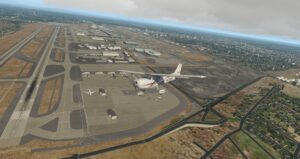 Direkt außerhalb der Bodentextur übernimmt das AutoGen die Kontrolle. Wenn wir uns dem Flughafen wieder nähern fällt auch der dezente Einfluss des Custom Mesh auf.