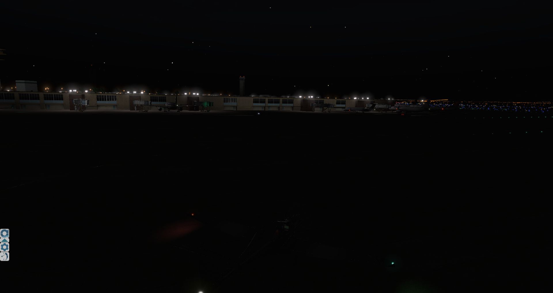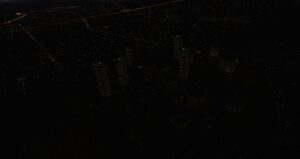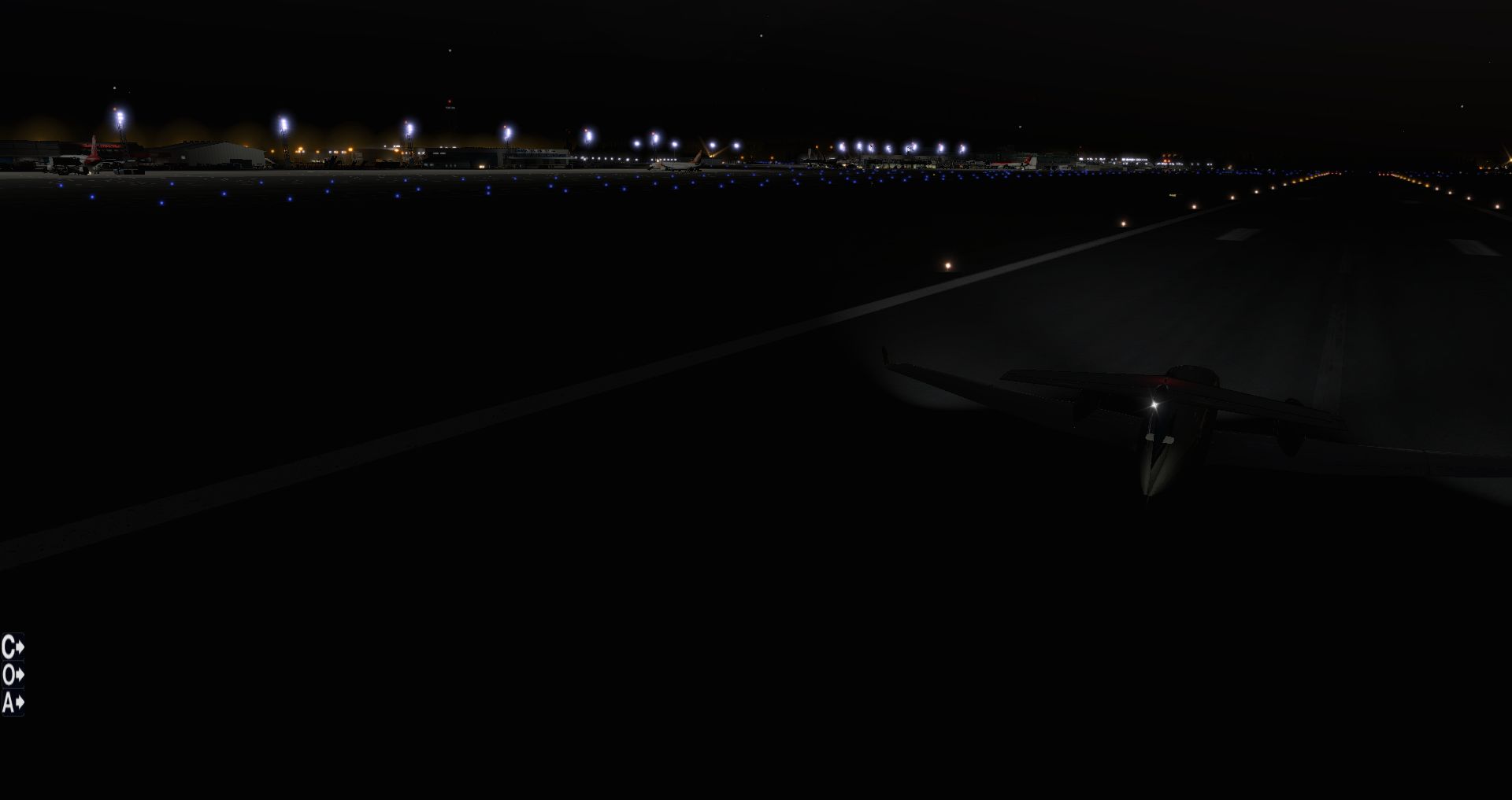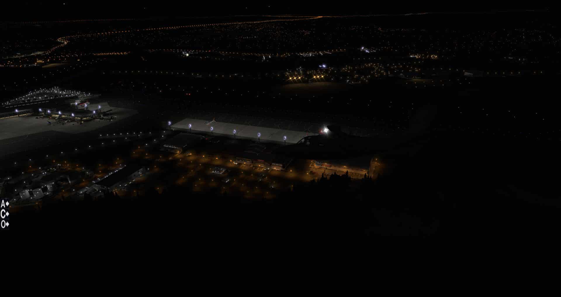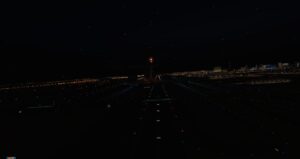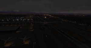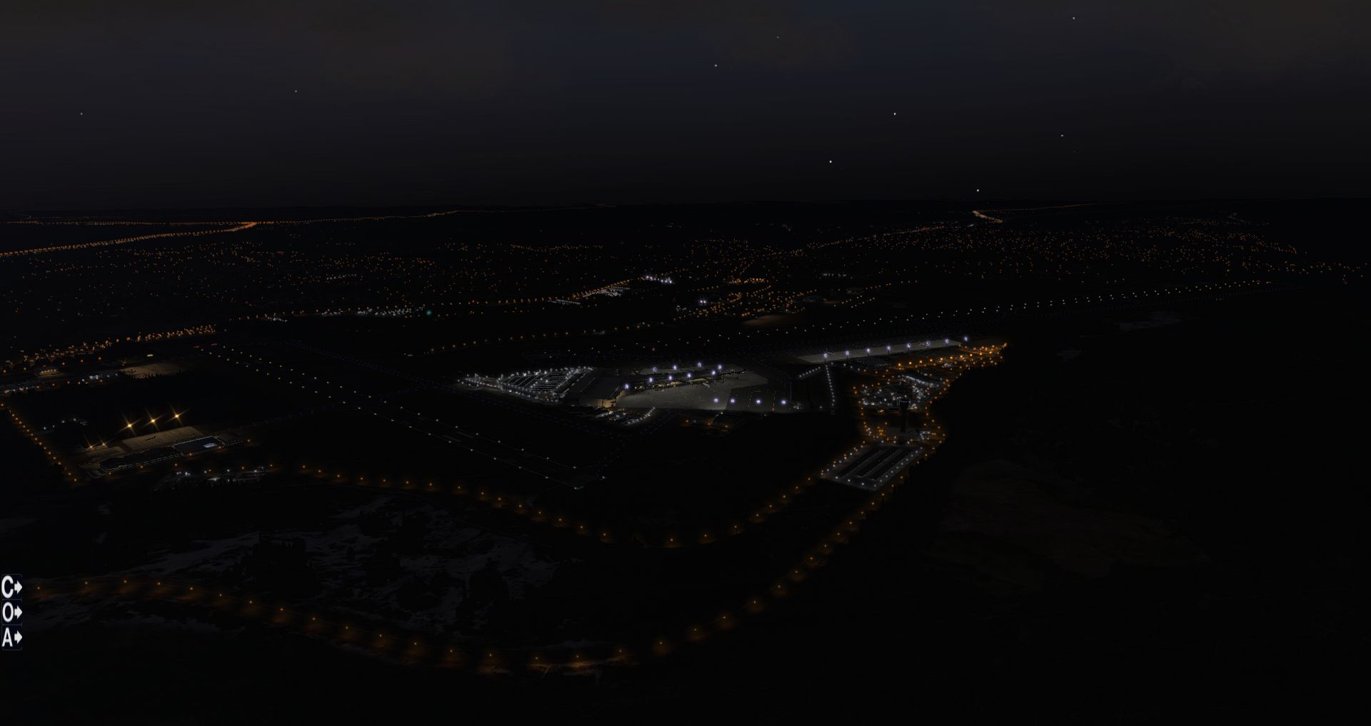Um den Straßenverlauf zu sehen muss man schon auf Nacht umschalten. Da sehen wir unten die Zu- und Abfahrtstraßen für den Flughafen selbst und vom zivilen Bereich eine Zufahrt in den militärischen Sektor. Es sind jedoch aus Sicht von X-Plane nur Bilder, keine Straßen für den Default Straßenverkehr.