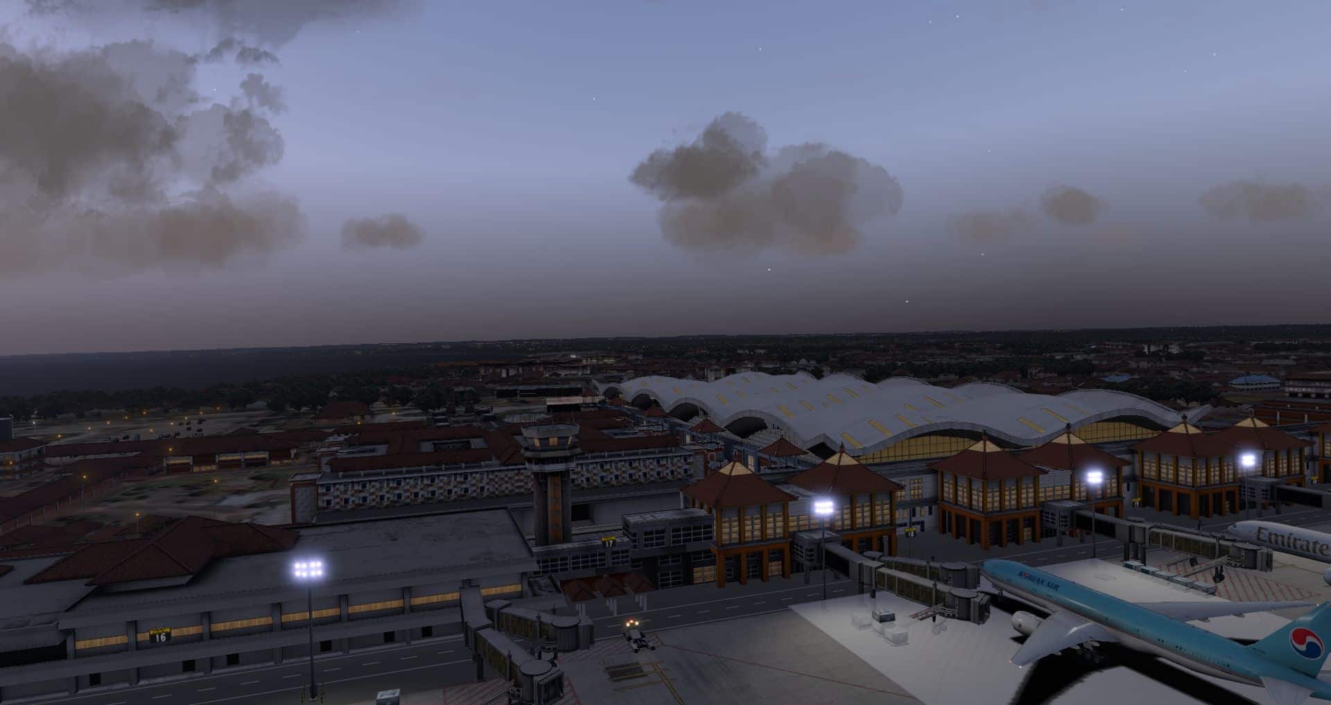 WADD müssen wir jedoch sowieso vom Meer oder zumindest der Lagune anfliegen. Die Nachtbeleuchtung des Flughafens ist ordentlich, aber keinesfalls mehr. Dafür machen die Texturen des Flughafens einen recht guten Eindruck.