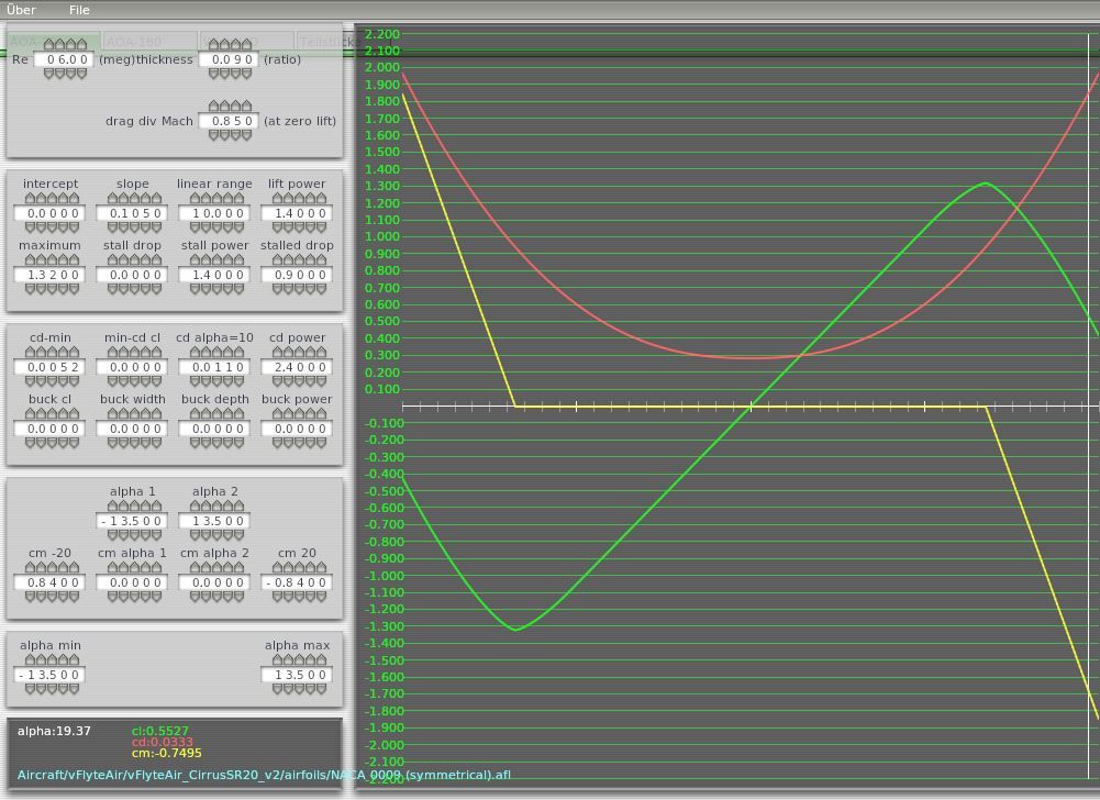 So brachte die Cirrus v2.0 sieben AFL-Dateien mit sich, von denen eine hier dargestellt ist. Jede AFL Datei enthält dabei die Daten eines bestimmten Tragflächenprofils, oder Propellers. Im PlaneMaker wird festgelegt, wie diese Tragflächen angelegt sind und wie groß ihre Flächen sind. Dabei können mehrere Profile gemeinsam eine Tragfläche bilden.