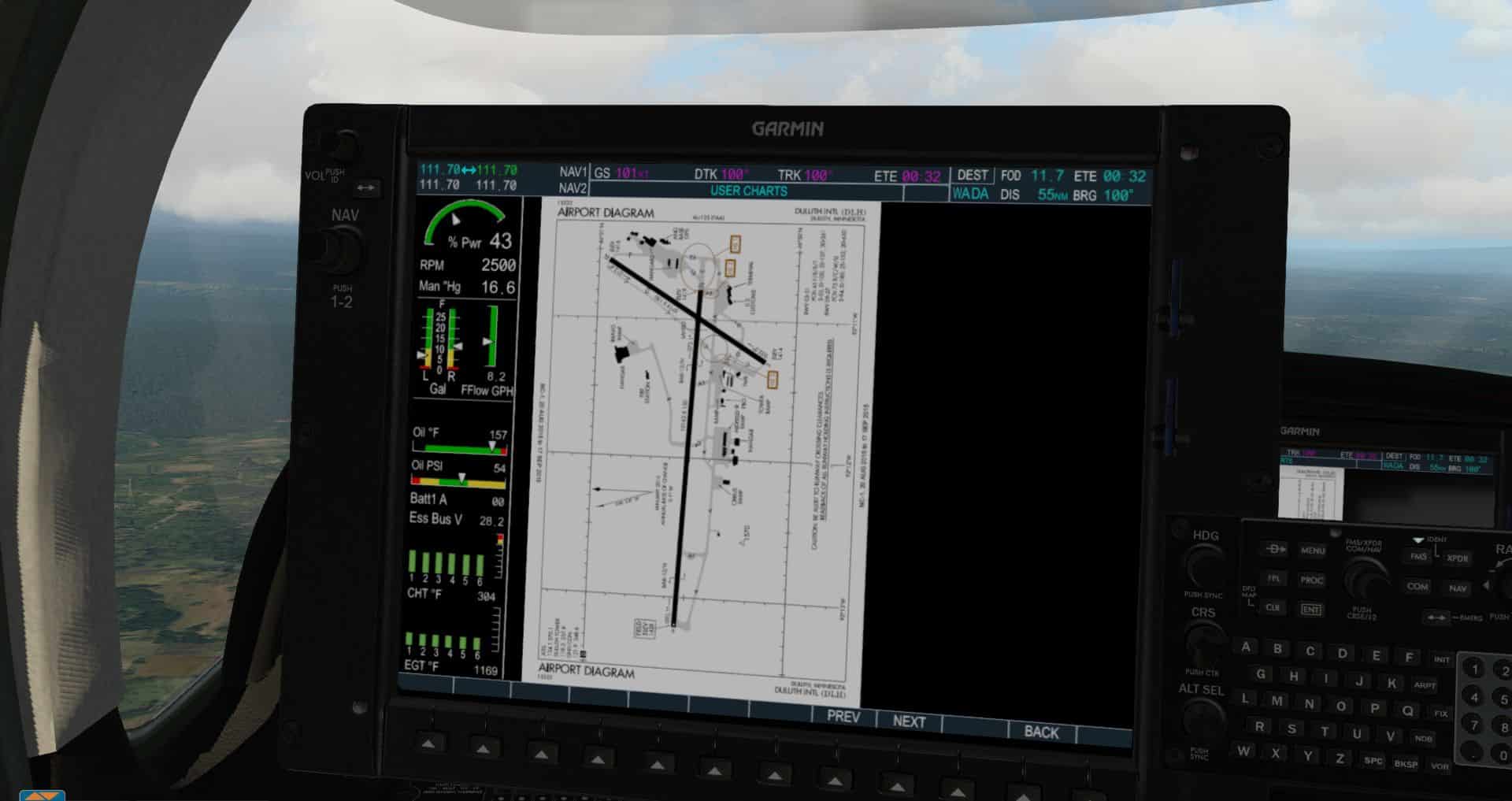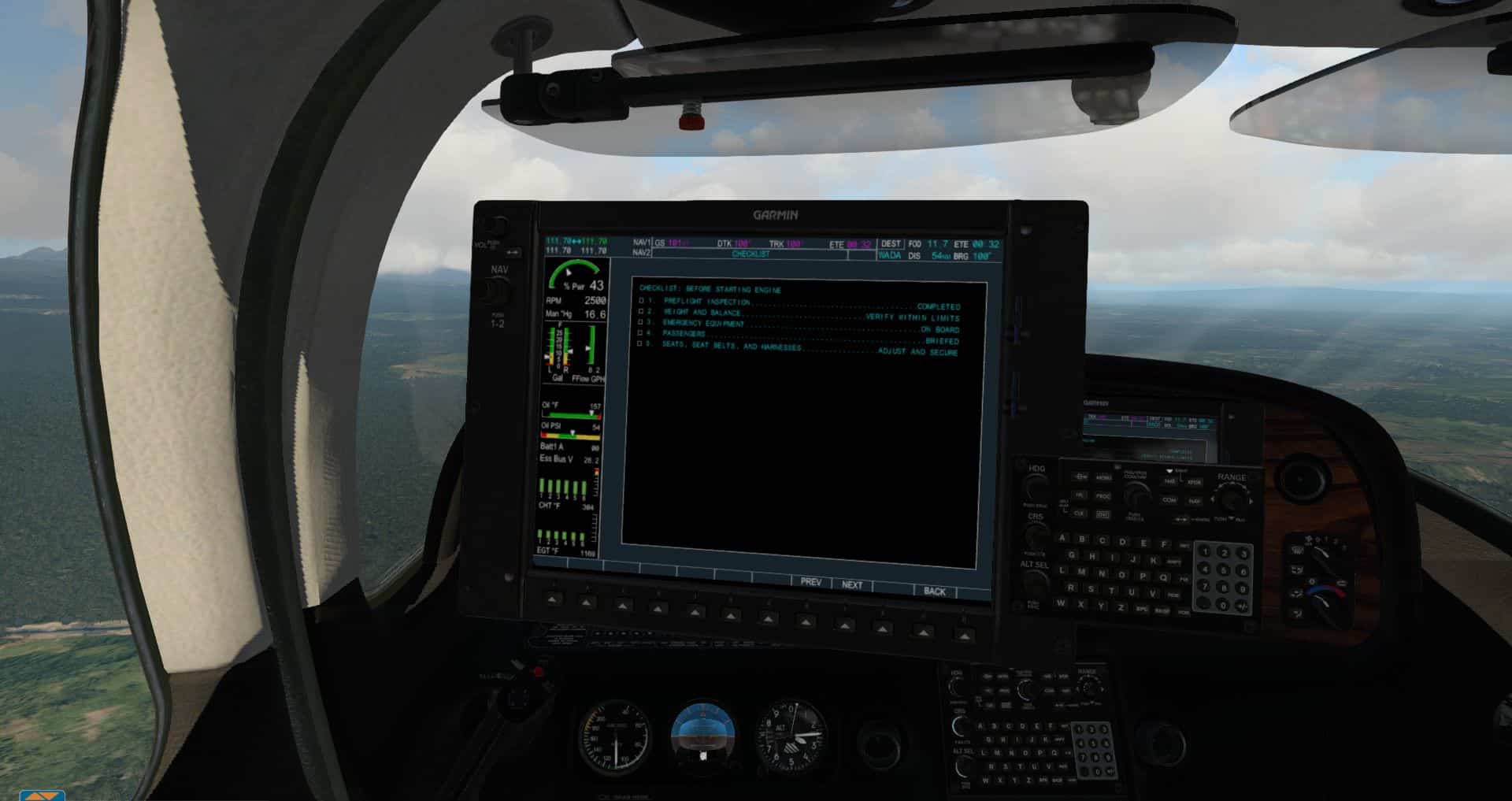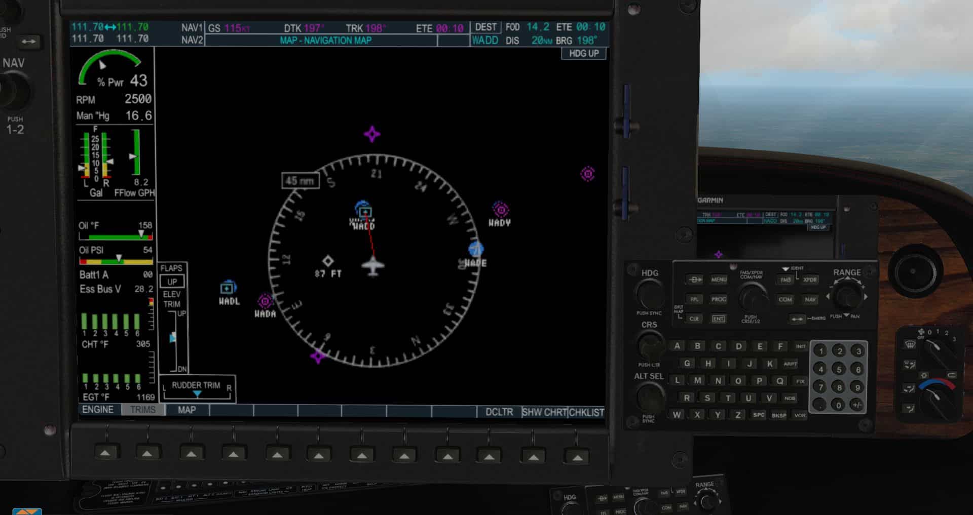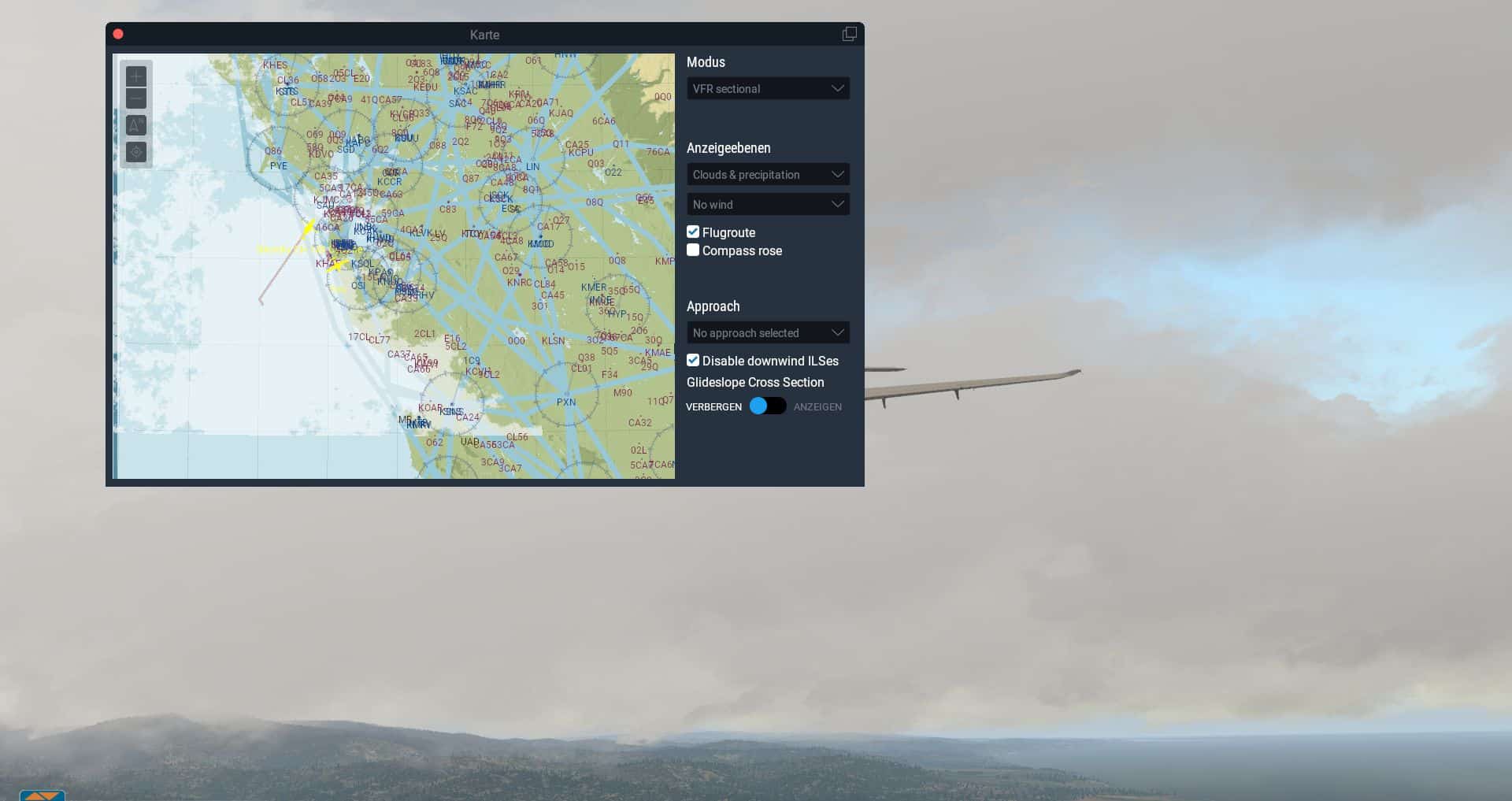 Auf dem Flug nach unten haben wir auch Zeit ein wenig durch die Optionen der Displays zu gehen. Unter anderem haben wir eine Kartenansicht, können Direktanflüge durchführen, haben Anflugkarten und Flughafendiagramme ( wenn wir vorher entsprechende PNGs vorbereitet haben), Triebwerksstatus und Checklisten. Was will man mehr?