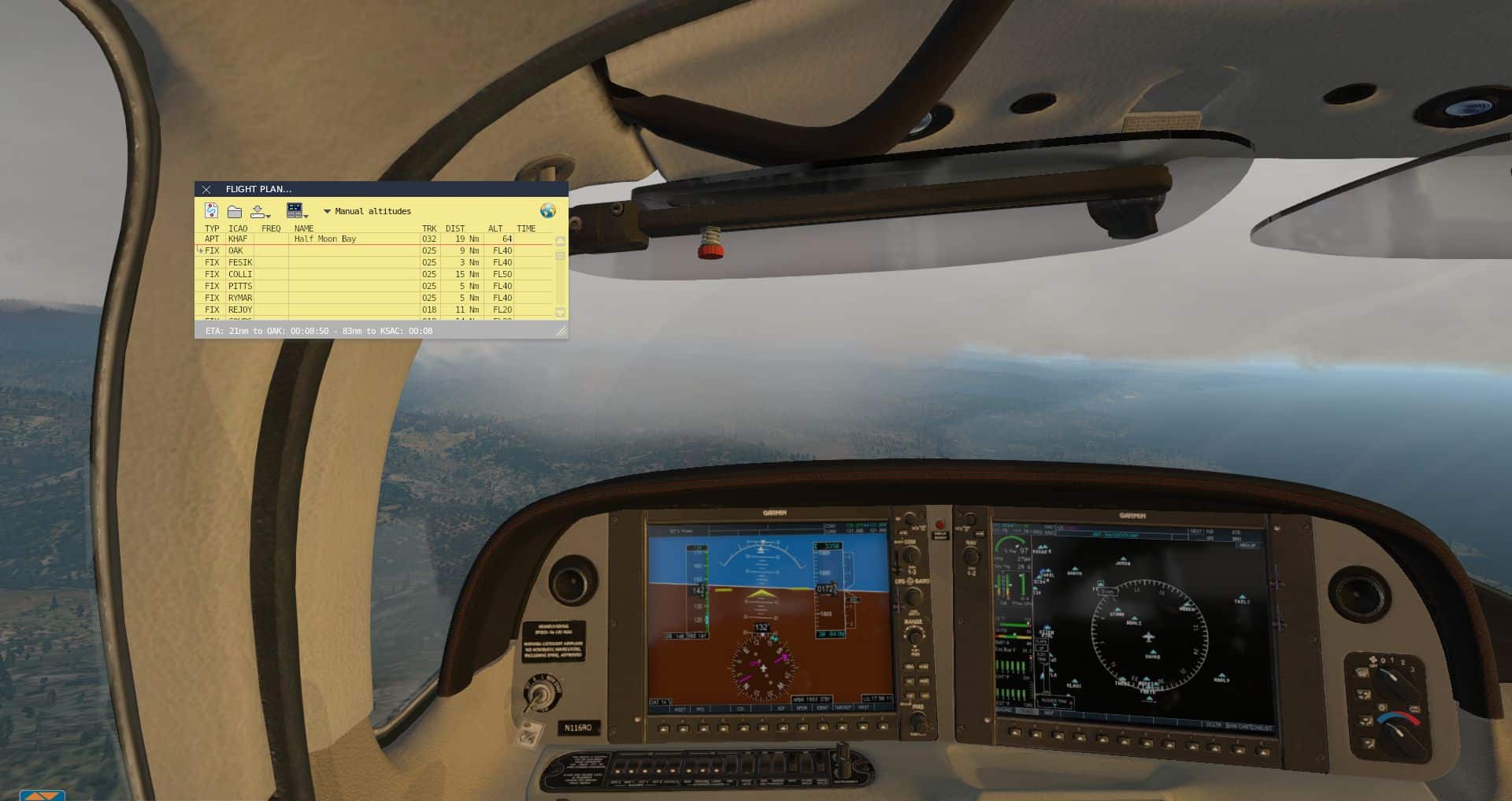 Wir starten also wieder in Half Moon Bay sehen dabei das Gras, Bodentexturen und die Fototapete mit ihrer Wahnsinnsauflösung von 0,3 bis 0,6 cm pro Pixel. Nach dem Start orientieren wir uns grob, lassen und von GoodWay einen Kurs planen der auch gleich im GPS der SR 20 angezeigt wird.