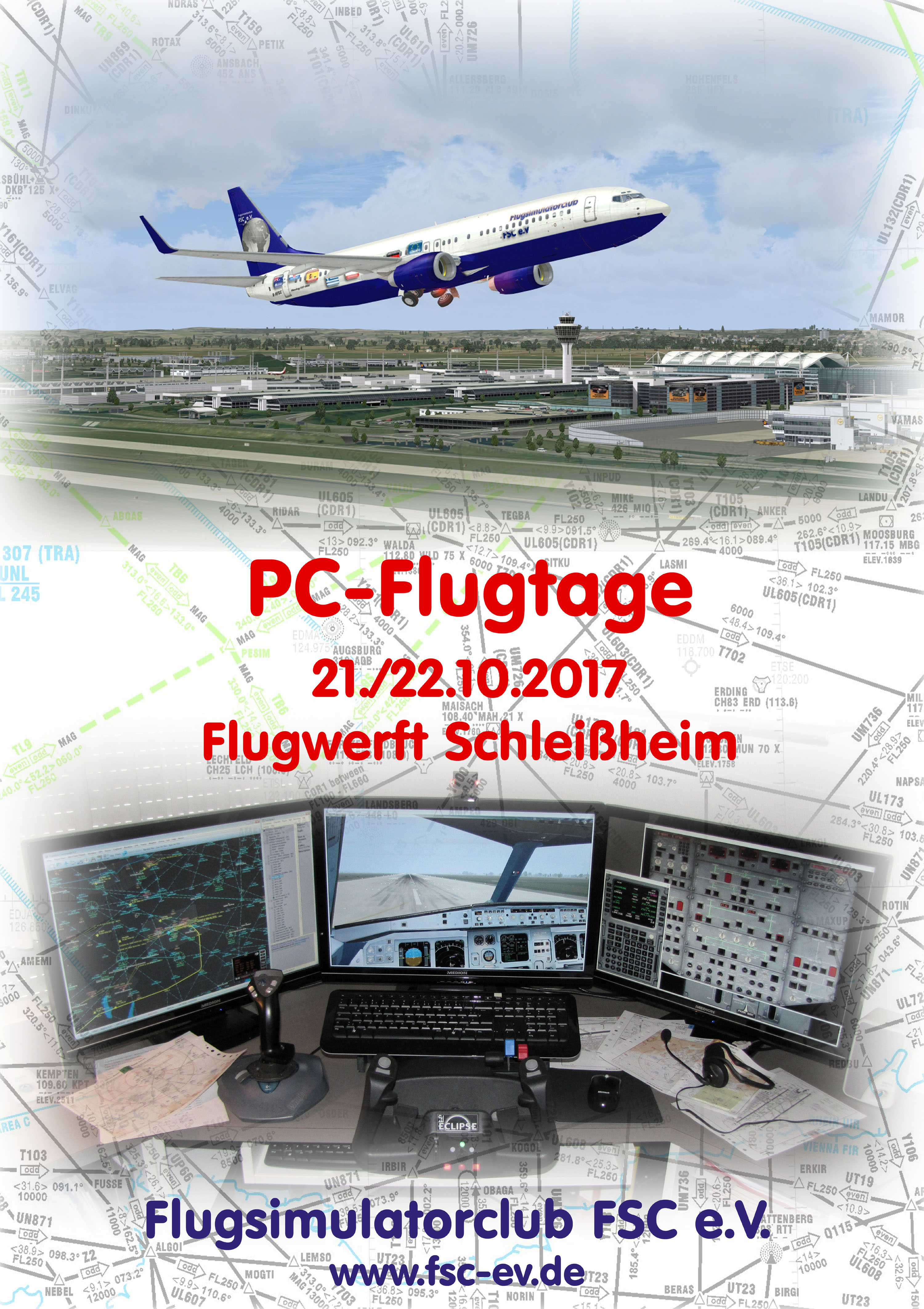 Der Flugsimulatorclub FSC e.V. lädt am 21. und 22. Oktober 2017 wieder alle Flugsimulationsinteressierte in die Flugwerft Schleißheim des Deutschen Museums München ein. Die Veranstaltung soll einen Einblick in das schöne und spannende Hobby der PC-Flugsimulation vermitteln, und sie dient auch dem gegenseitigen Austausch unter bereits aktiven virtuellen Piloten und Controllern.