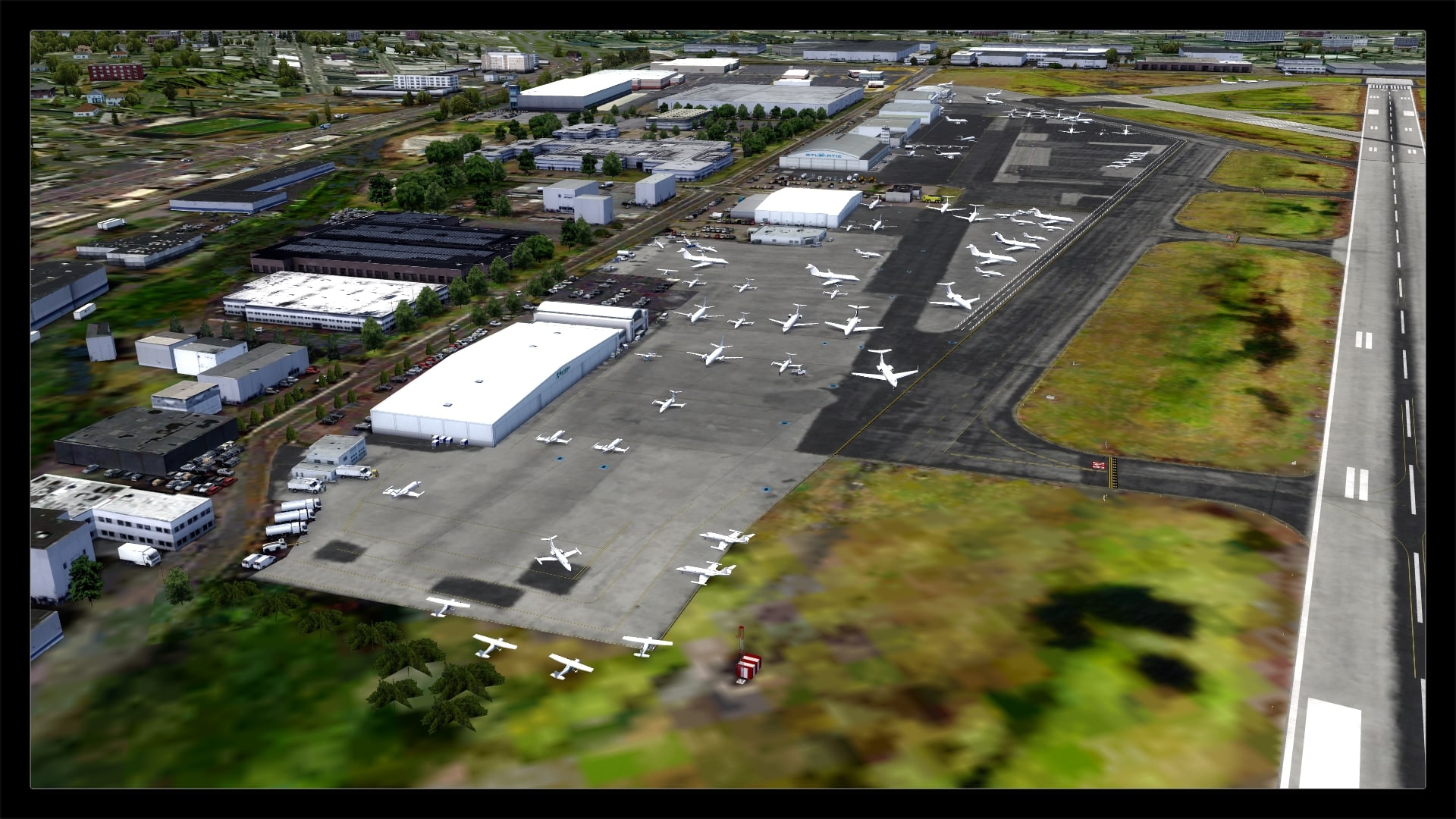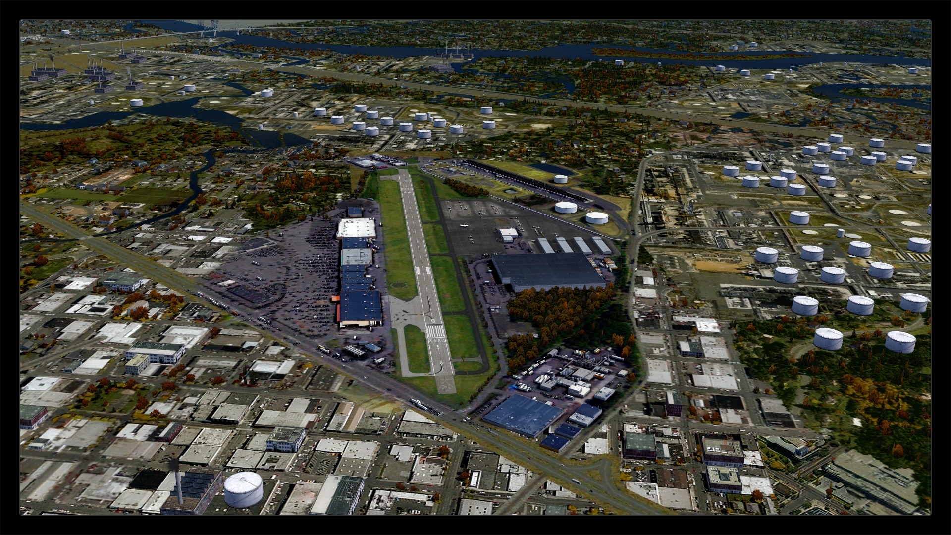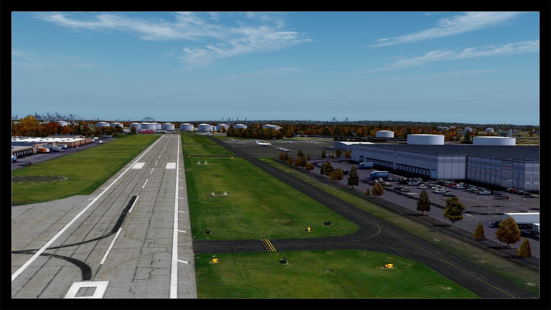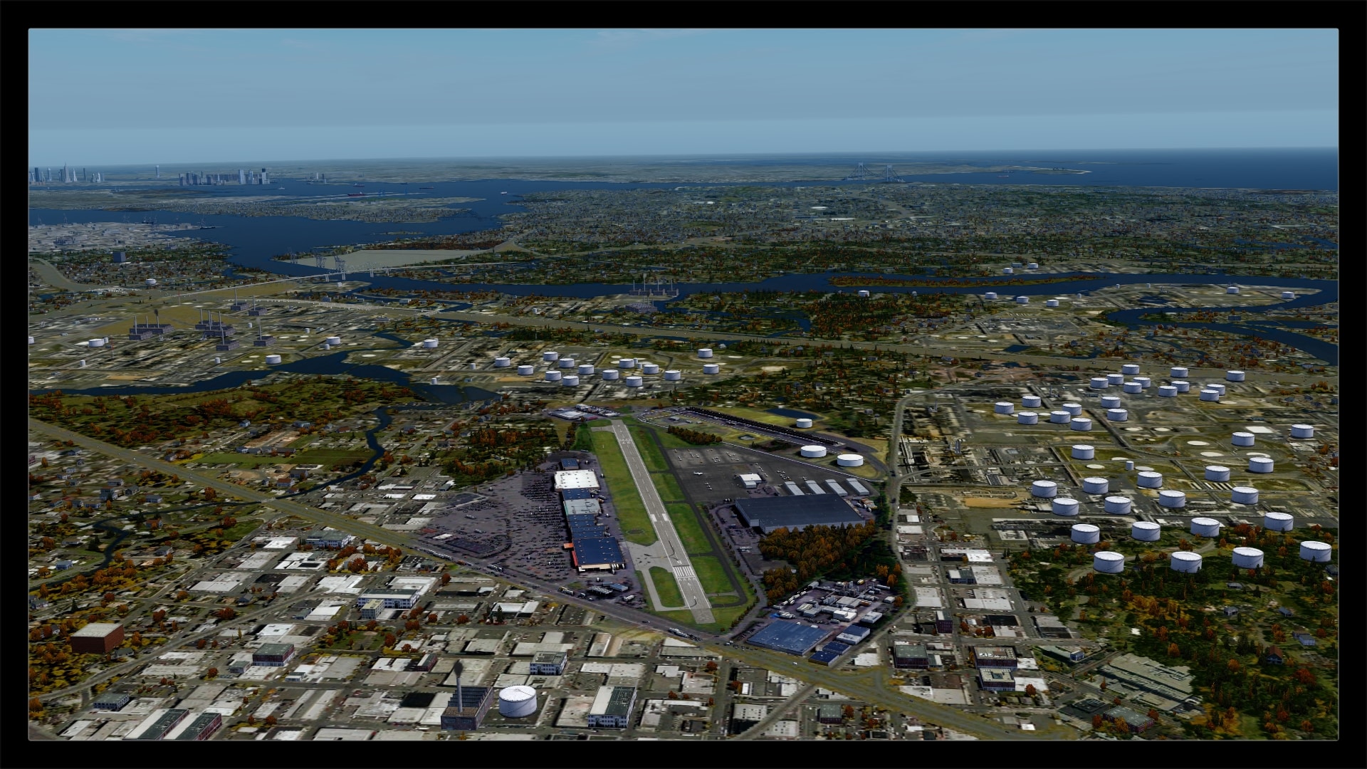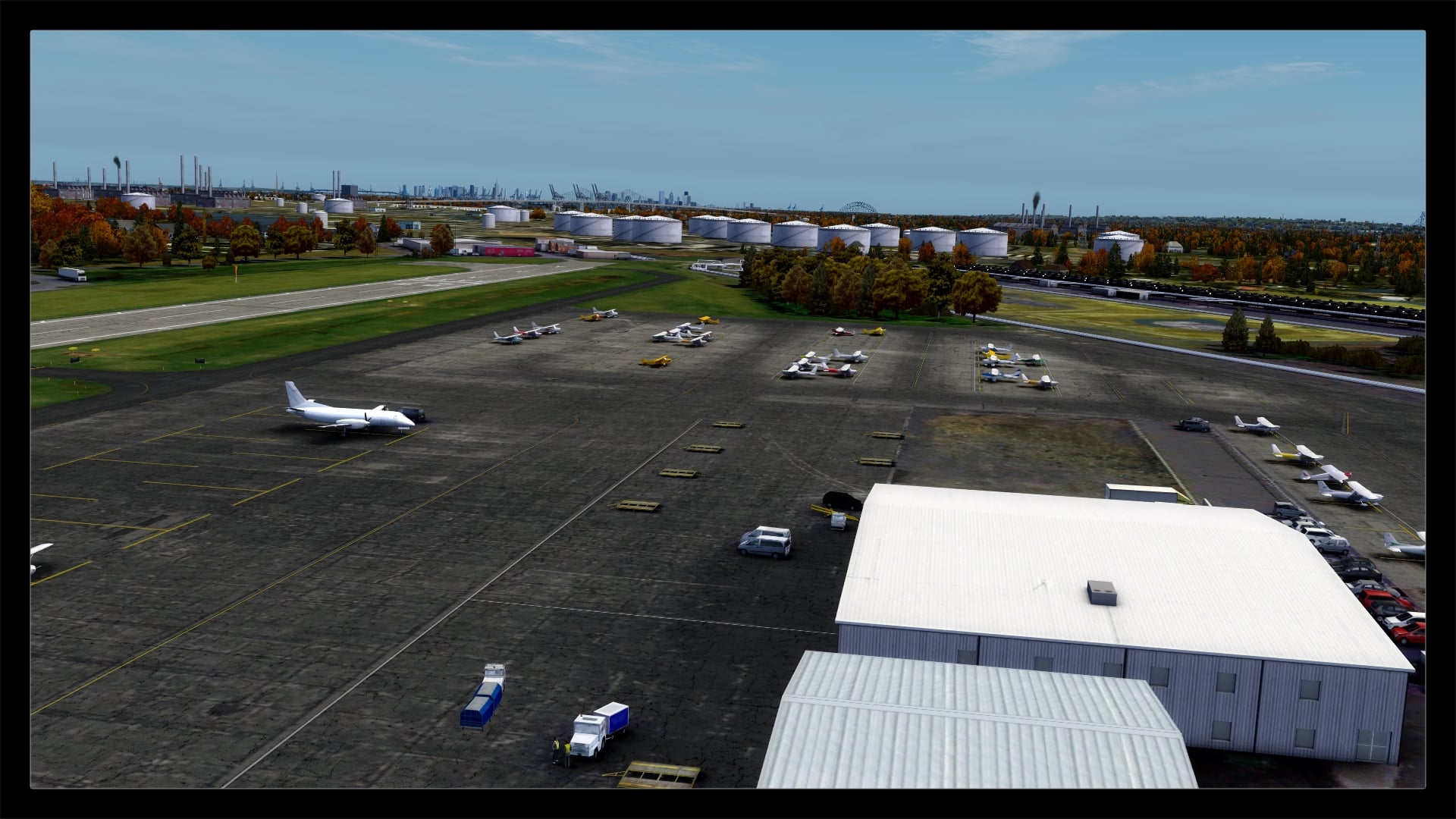 Eingebettet zwischen zwei Golfplätzen, liegt der Essex County Airport ca. 30 km nordwestlich von Manhattan. Abgewickelt wird ausschließlich GA Verkehr. Daher ist es auch nur schwer nachvollziehbar, wieso auf dem Flughafen ULD (Unit Load Device) Container rumstehen. Wie bei den anderen Airports sind die Bodentexturen ganz annehmbar. Allerdings ist der Qualitätsunterscheid zwischen Betonoberfläche und Grasnarbe teilweise stark ausgeprägt. Der Tower ist allenfalls eher rudimentär dargestellt. Der Platz an sich fügt sich sehr gut in die Umgebung ein. Einzig die Einflugschneise der Bahn 22 schneidet sich unschön in einen Teil des angrenzenden Industriegebietes ein. In der Realität ist der Straßenverlauf anders und das Industriegebiet nicht so geformt wie im Simulator ist unklar, und hier der Fehler bei Orbx oder Drzewiecki liegt kann ich nicht beurteilen. Die verwendeten statischen Modelle sind sehr schön und bedürfen keiner Kritik.