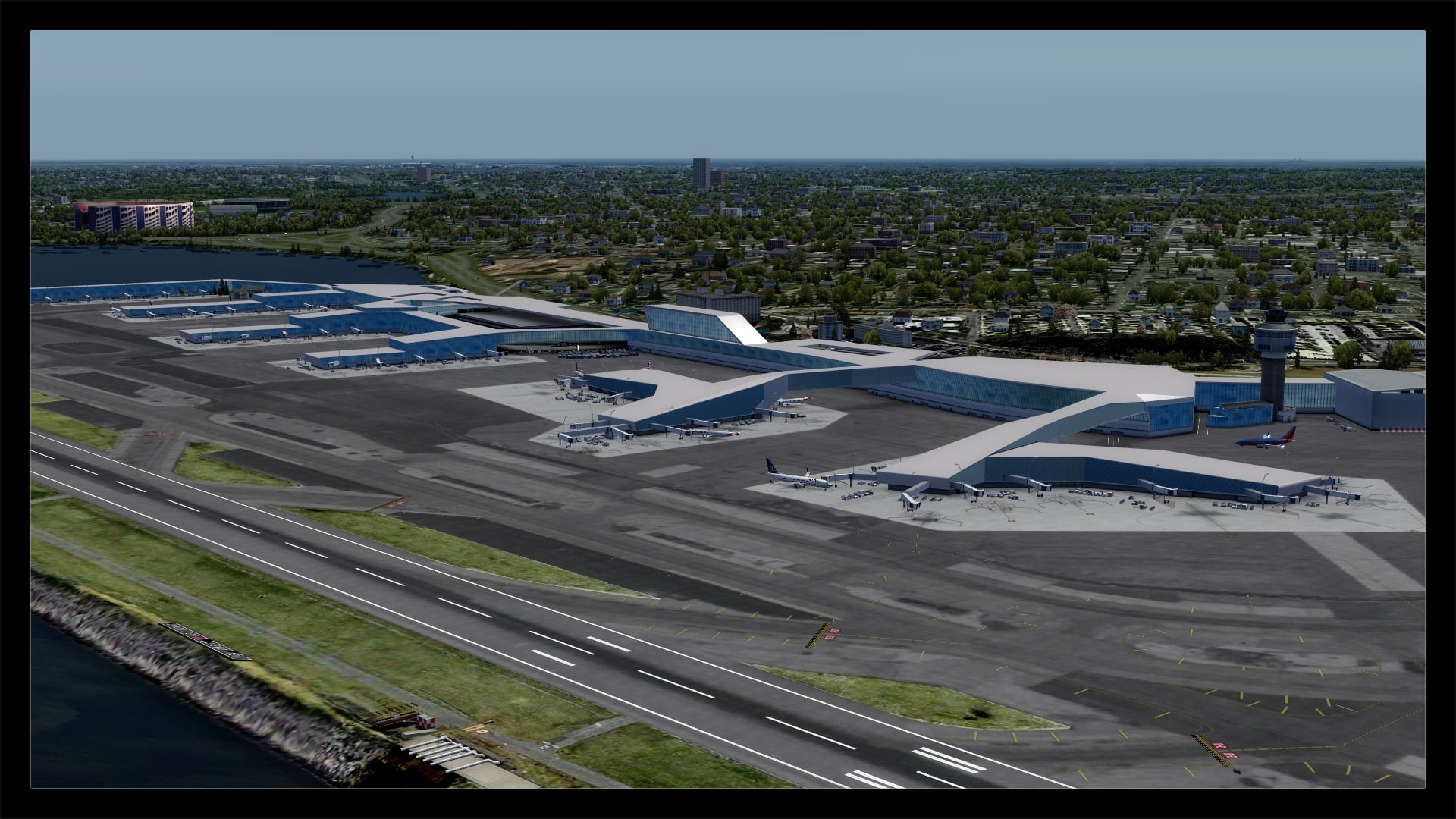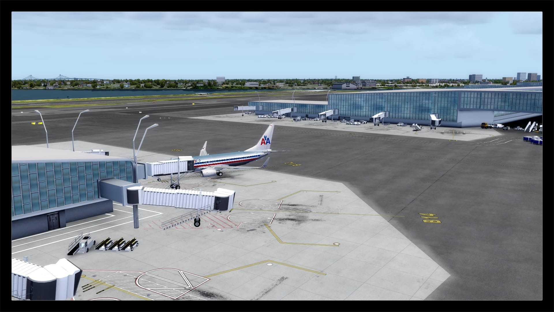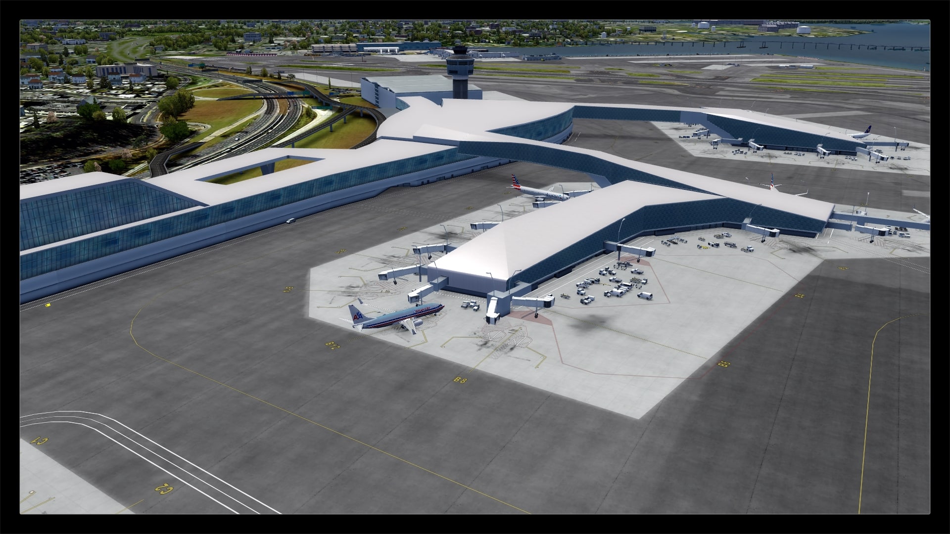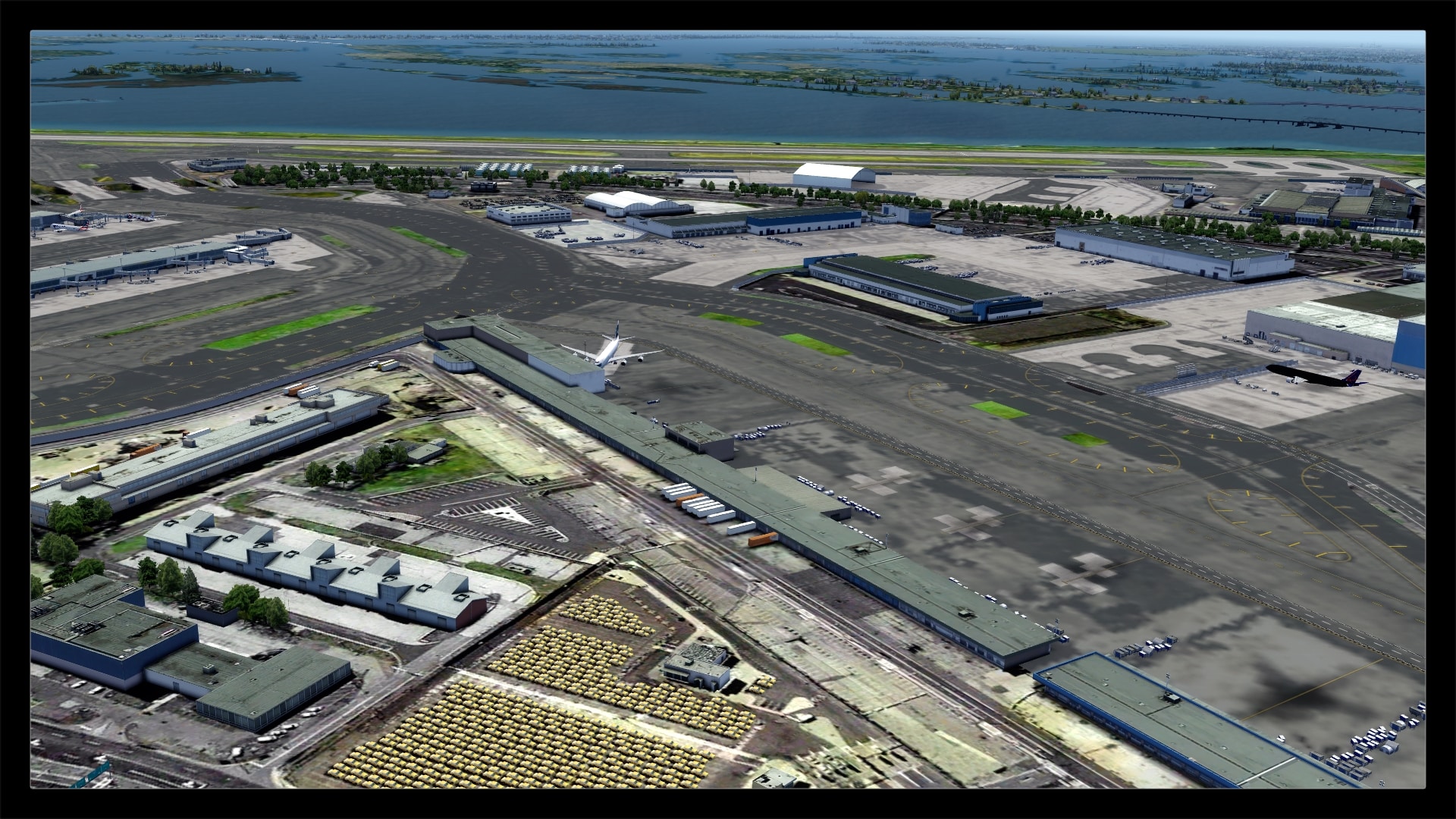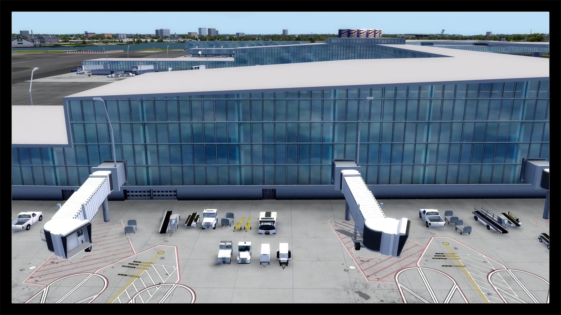 Beim ersten Anflug auf LaGuardia ist man etwas erschrocken, sofern man vorher das Manual nicht gelesen hat. Stimmt doch die Darstellung im Simulator so gar nicht mit der aktuellen Realität überein. Drzewiecki Design hat sich entschlossen, KLGA so darzustellen, wie es nach den umfangreichen Baumaßnahmen aussehen würde. Als Vorlage diente ihnen dabei ein Entwurf der Port Authority. Daher ist es schlicht unmöglich eine Aussage darüber zutreffen, ob die Umsetzung gut gelungen ist. Der Flughafen sieht jedenfalls sehr klinisch sauber aus, wobei die Bodentexturen ein besseres Bild abgeben als bei JFK. Die sehr moderne neue Konstruktion passt sich auch gefühlt sehr schwer in das Gesamtbild ein. Gerade im direkten Vergleich, wie z.B. beim Parkhaus, hat man teilweise das Gefühl, dass sich da zwei Szenerien ins Gehege kommen. Auch muss sich ein Fehler im hinteren Bereich des Airports eingeschlichen haben, denn hier stehen Wohnhäuser am Terminal. Insgesamt sind wieder ausreichend Bodengeräte vorhanden, die Gebäude sind zum Teil mit einigen Details versehen. Auch entdeckt man kleine dargestellte Szenerien. Alles in allem wirkt die Umsetzung aber lieblos und man wird den Eindruck nicht los, dass sie an manchen Stellen schlicht nicht wussten wie die finale Ausgestaltung aussehen wird.