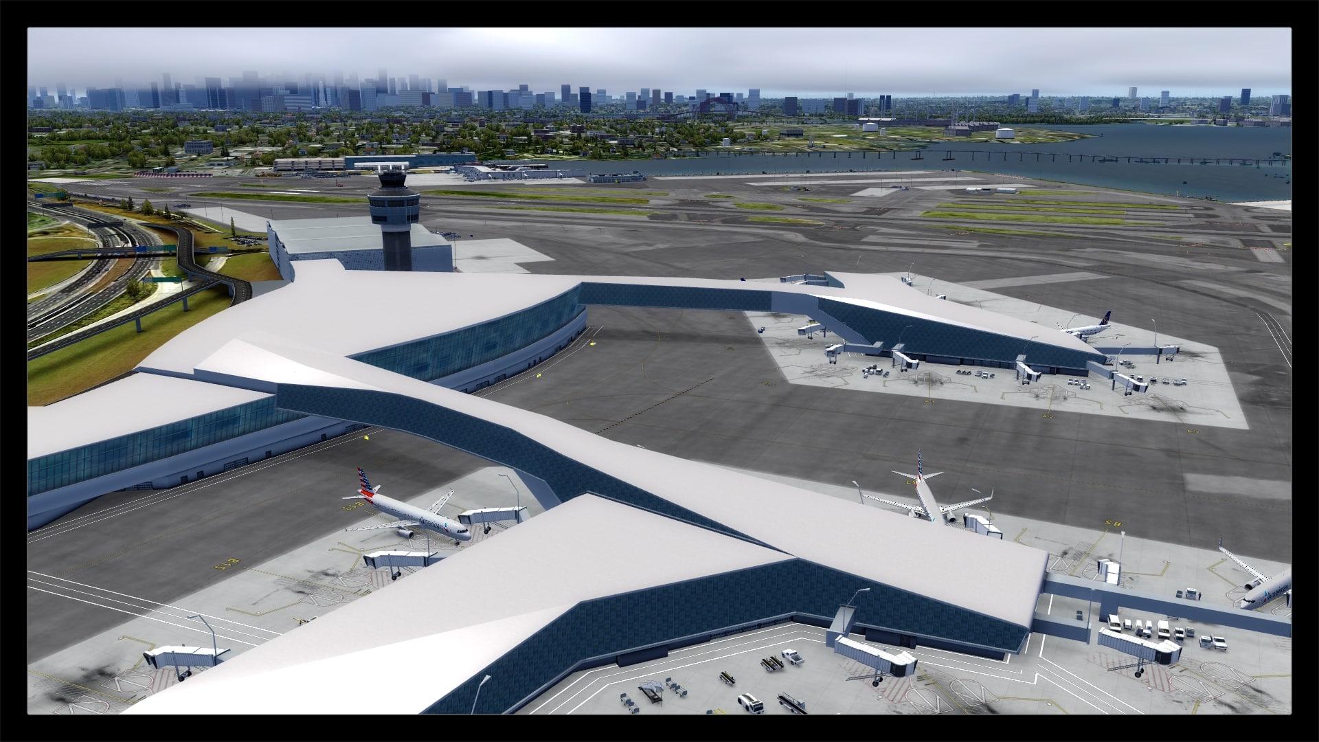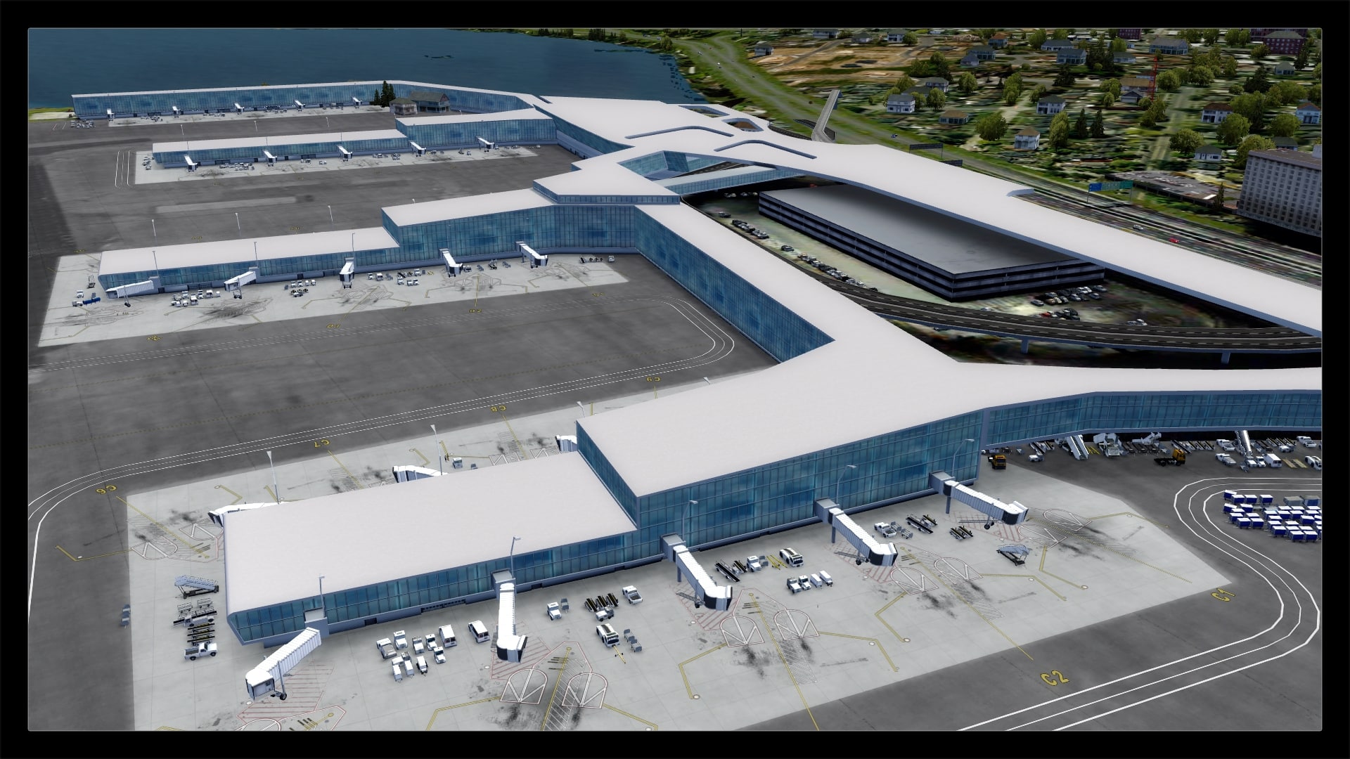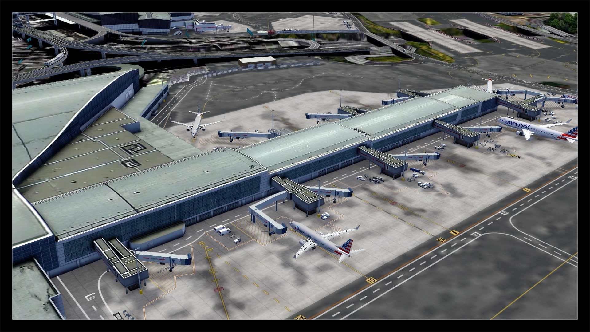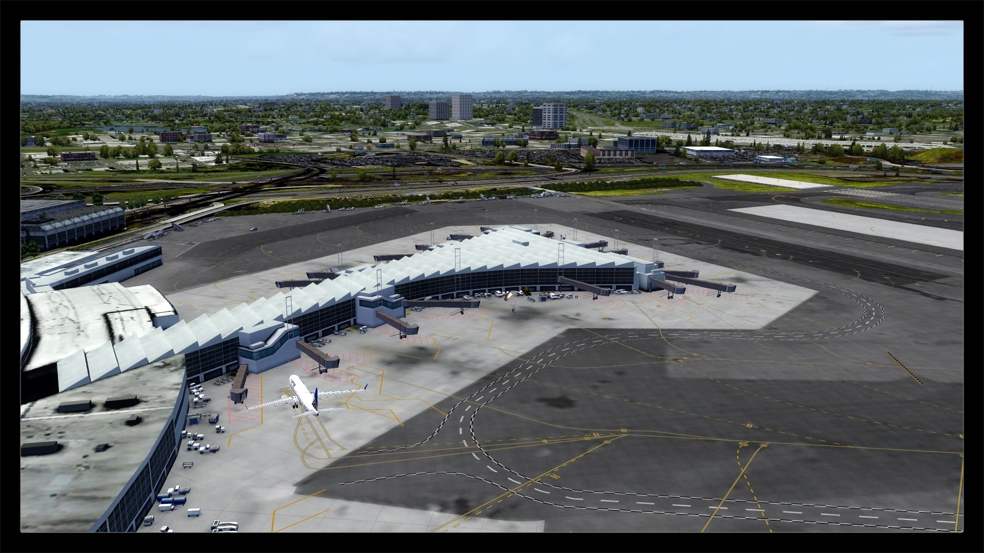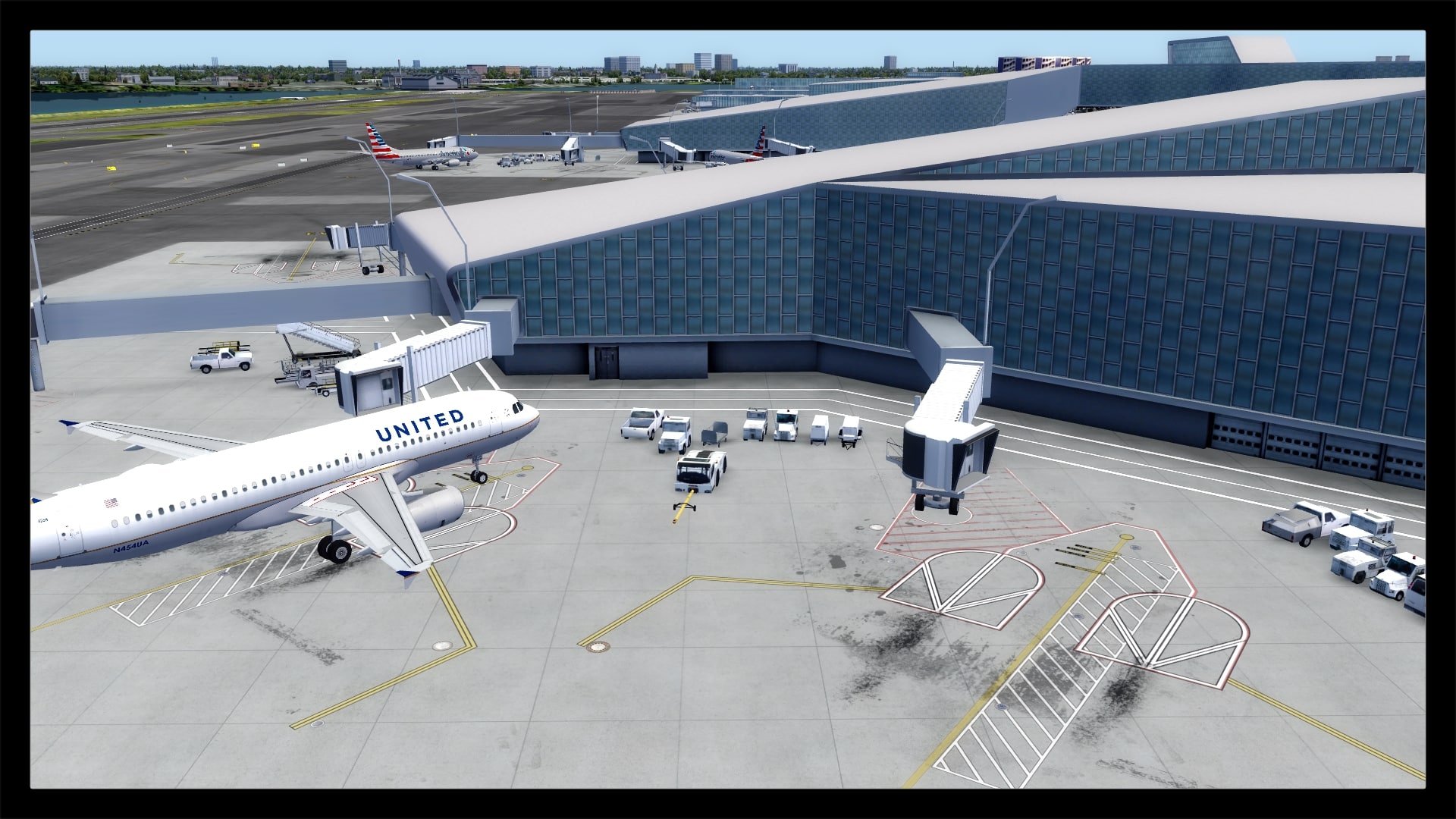 Beim ersten Anflug auf LaGuardia ist man etwas erschrocken, sofern man vorher das Manual nicht gelesen hat. Stimmt doch die Darstellung im Simulator so gar nicht mit der aktuellen Realität überein. Drzewiecki Design hat sich entschlossen, KLGA so darzustellen, wie es nach den umfangreichen Baumaßnahmen aussehen würde. Als Vorlage diente ihnen dabei ein Entwurf der Port Authority. Daher ist es schlicht unmöglich eine Aussage darüber zutreffen, ob die Umsetzung gut gelungen ist. Der Flughafen sieht jedenfalls sehr klinisch sauber aus, wobei die Bodentexturen ein besseres Bild abgeben als bei JFK. Die sehr moderne neue Konstruktion passt sich auch gefühlt sehr schwer in das Gesamtbild ein. Gerade im direkten Vergleich, wie z.B. beim Parkhaus, hat man teilweise das Gefühl, dass sich da zwei Szenerien ins Gehege kommen. Auch muss sich ein Fehler im hinteren Bereich des Airports eingeschlichen haben, denn hier stehen Wohnhäuser am Terminal. Insgesamt sind wieder ausreichend Bodengeräte vorhanden, die Gebäude sind zum Teil mit einigen Details versehen. Auch entdeckt man kleine dargestellte Szenerien. Alles in allem wirkt die Umsetzung aber lieblos und man wird den Eindruck nicht los, dass sie an manchen Stellen schlicht nicht wussten wie die finale Ausgestaltung aussehen wird.
