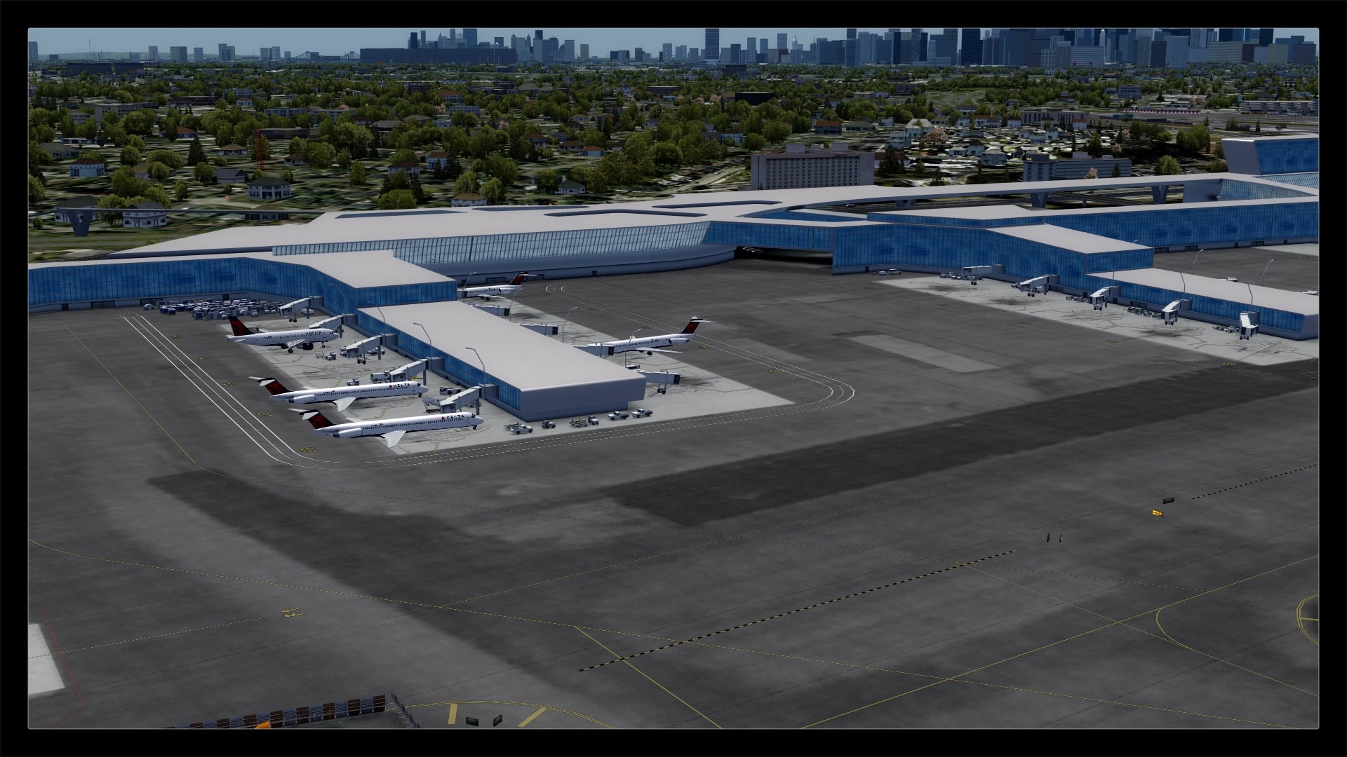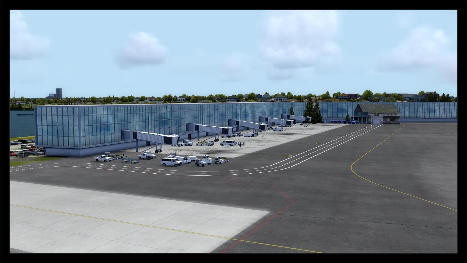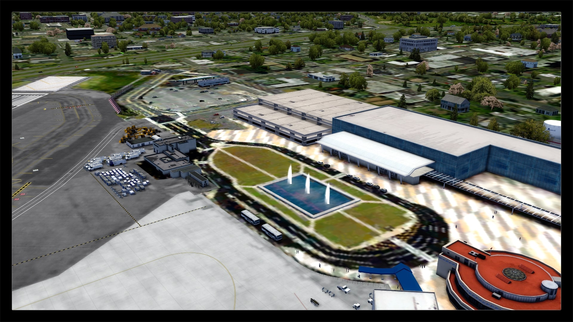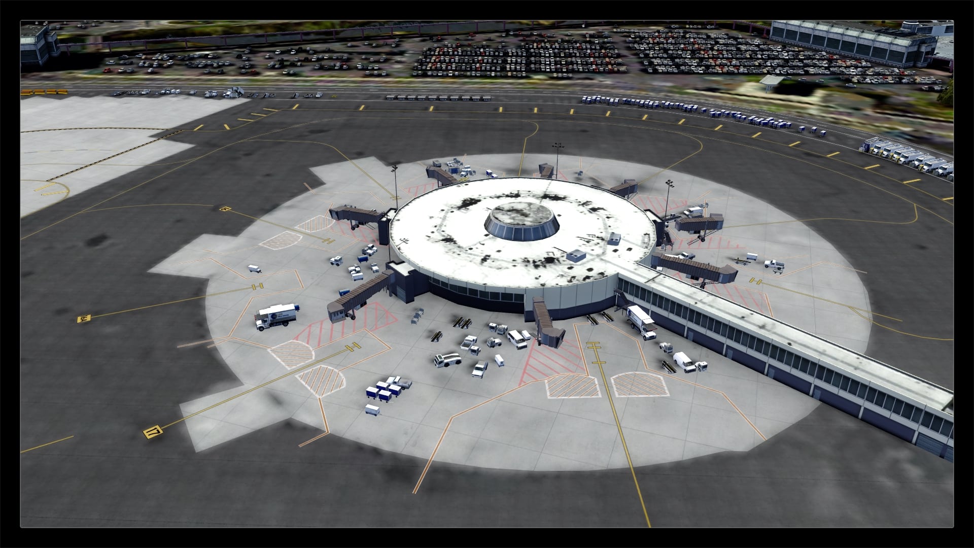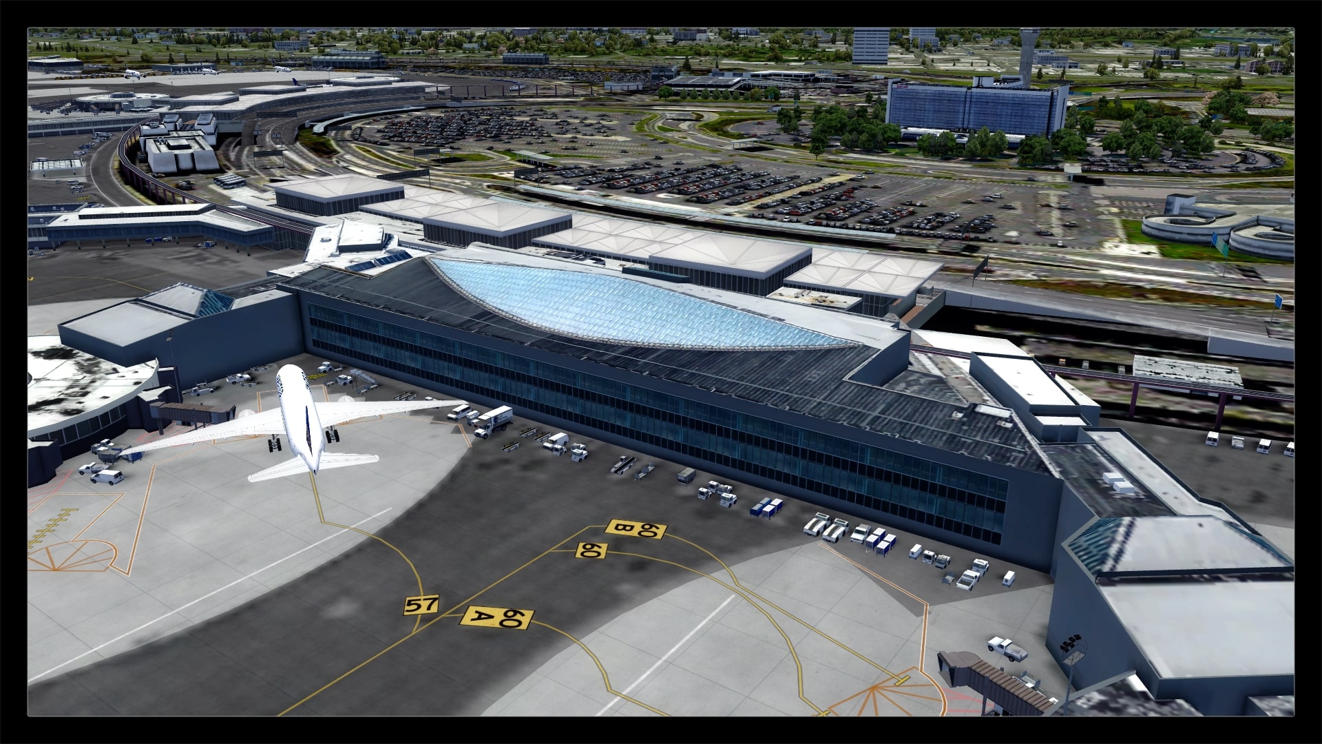 Beim ersten Anflug auf LaGuardia ist man etwas erschrocken, sofern man vorher das Manual nicht gelesen hat. Stimmt doch die Darstellung im Simulator so gar nicht mit der aktuellen Realität überein. Drzewiecki Design hat sich entschlossen, KLGA so darzustellen, wie es nach den umfangreichen Baumaßnahmen aussehen würde. Als Vorlage diente ihnen dabei ein Entwurf der Port Authority. Daher ist es schlicht unmöglich eine Aussage darüber zutreffen, ob die Umsetzung gut gelungen ist. Der Flughafen sieht jedenfalls sehr klinisch sauber aus, wobei die Bodentexturen ein besseres Bild abgeben als bei JFK. Die sehr moderne neue Konstruktion passt sich auch gefühlt sehr schwer in das Gesamtbild ein. Gerade im direkten Vergleich, wie z.B. beim Parkhaus, hat man teilweise das Gefühl, dass sich da zwei Szenerien ins Gehege kommen. Auch muss sich ein Fehler im hinteren Bereich des Airports eingeschlichen haben, denn hier stehen Wohnhäuser am Terminal. Insgesamt sind wieder ausreichend Bodengeräte vorhanden, die Gebäude sind zum Teil mit einigen Details versehen. Auch entdeckt man kleine dargestellte Szenerien. Alles in allem wirkt die Umsetzung aber lieblos und man wird den Eindruck nicht los, dass sie an manchen Stellen schlicht nicht wussten wie die finale Ausgestaltung aussehen wird.