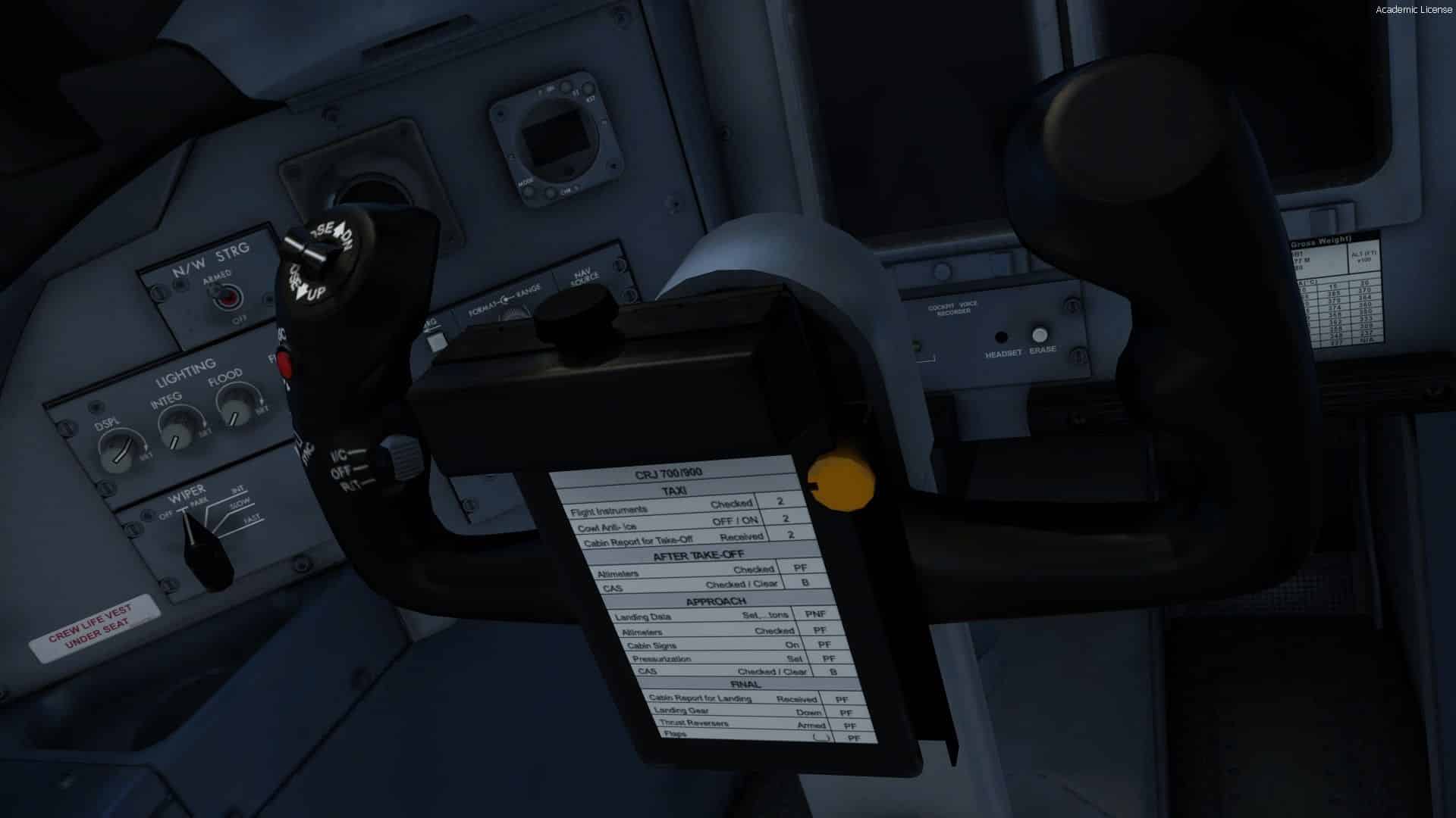 Wer bereits mit einer Umsetzung der Bombardier Dash-8 in FSX oder Prepar3D unterwegs war, dem wird das Cockpitlayout des CRJ angenehm vertraut vorkommen. Viele Arbeitsschritte gelingen intuitiv, da Bedienelemente für Bildschirme, TCAS und Radios an den gleichen Positionen zu finden sind wie in der kleineren Turboprop. Ebenso wie die Dash fliegt auch der CRJ ohne Autothrottle und verfügt über eine ähnliche Autopilotsystematik. Alles in allem lassen sich diverse Gemeinsamkeiten finden, die den Einstieg für Dash 8-Piloten sicher ein wenig einfacher gestaltet. Keine Angst, auch ohne Erfahrungen mit Bombardier kann man problemlos auf den kleinen Zweistrahler „umschulen“. Im Vergleich zu Airbus und Boeing ist das Cockpit zwar weniger intuitiv, dank der ausführlichen Dokumentation kann sich jedoch jeder in Ruhe in die Systematik der Maschine einlesen und lernen sich im Cockpit der CRJ zurecht zu finden.