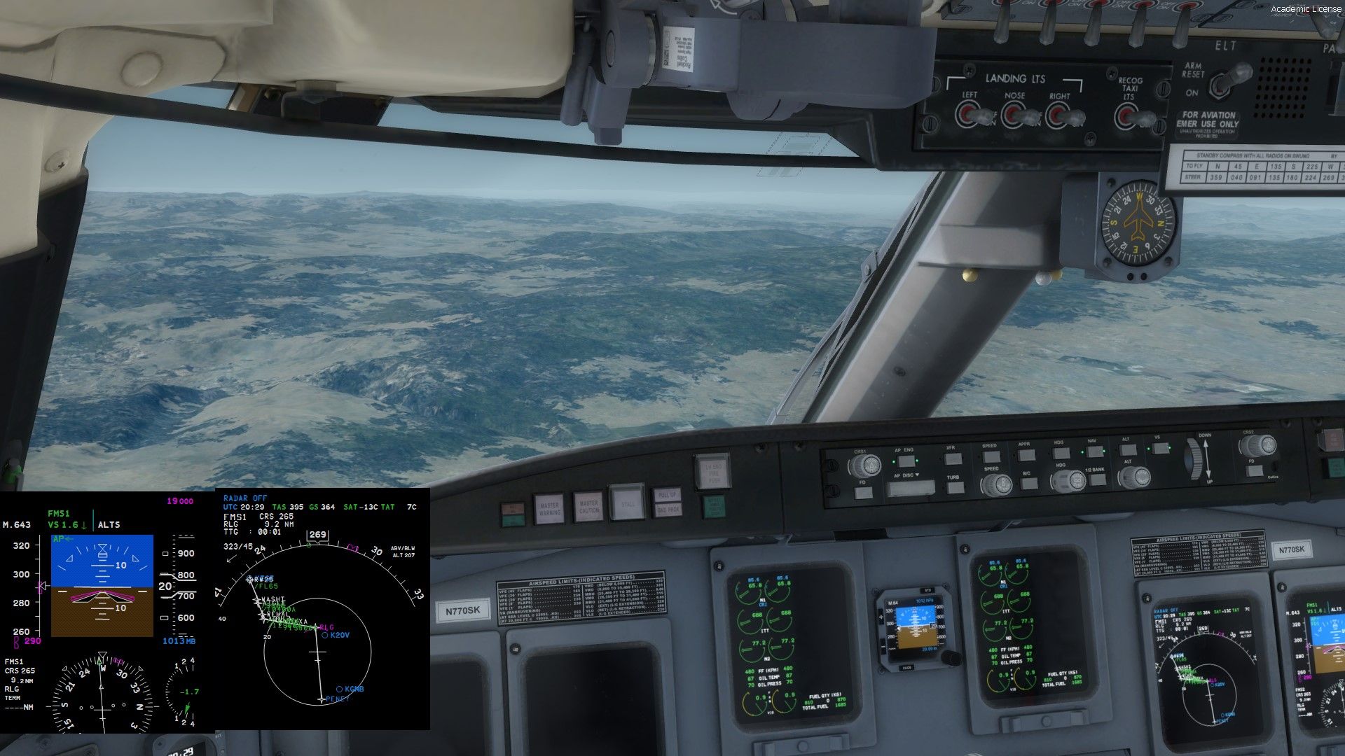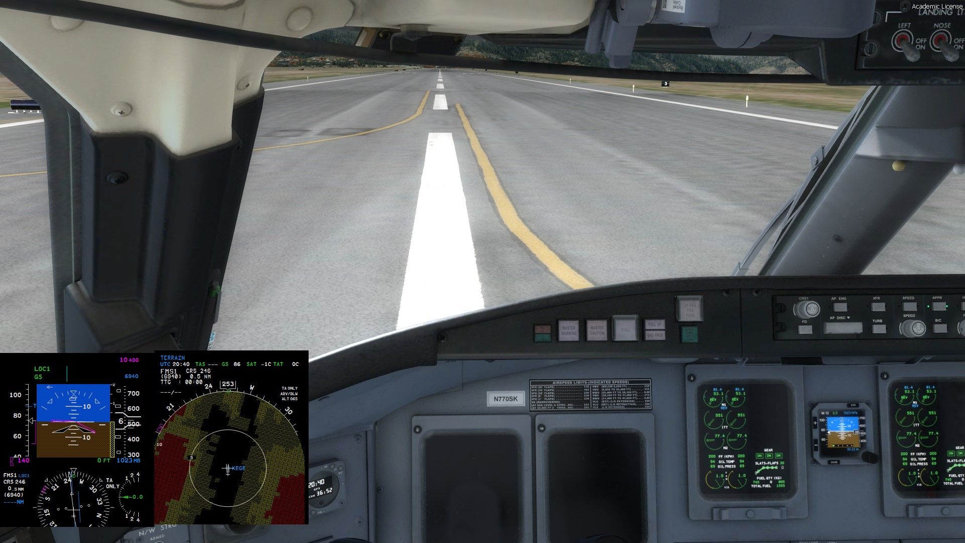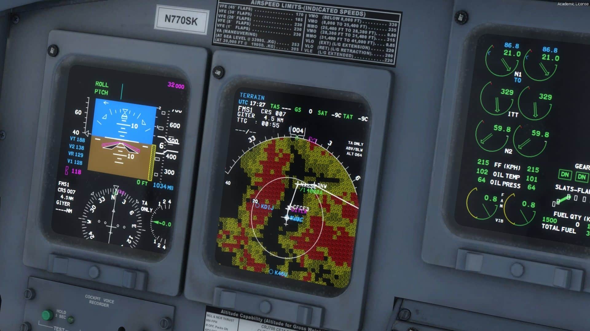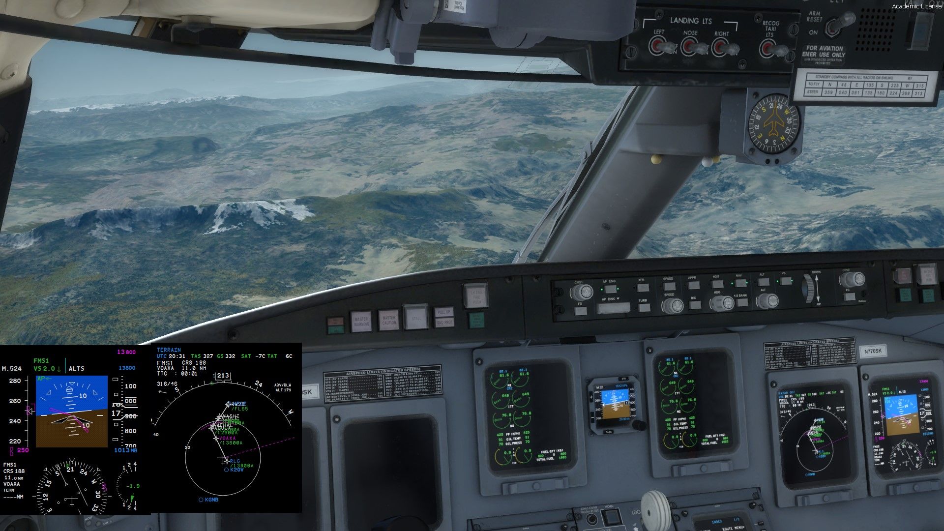 Besonders praktisch für den Flug von Jackson ist die Umsetzung des Geländeradars. Wie auch das Wetterradar (war im vorherigen Flug zu sehen) wird das Terrain auf dem Navigationsdisplay in entsprechenden Farben dargestellt. Es ist realistisch umgesetzt und funktioniert sehr gut.