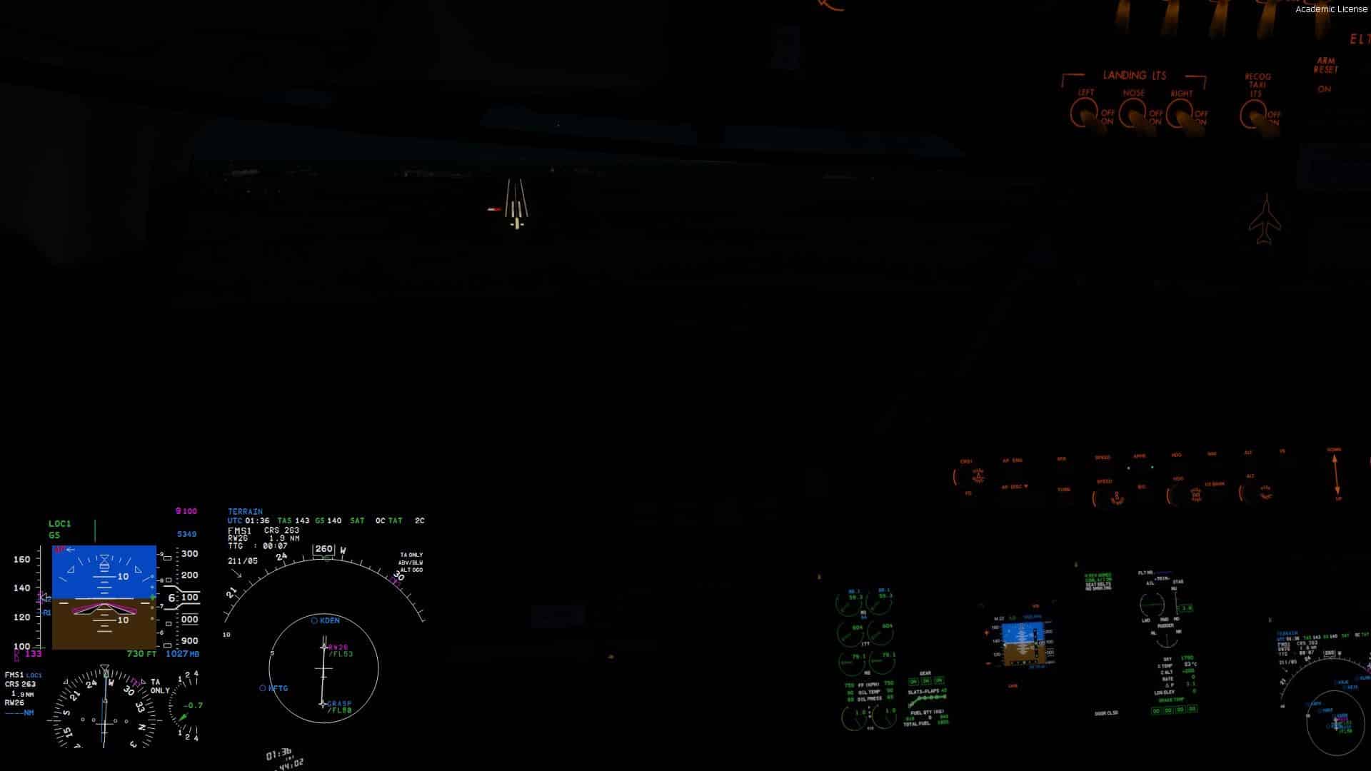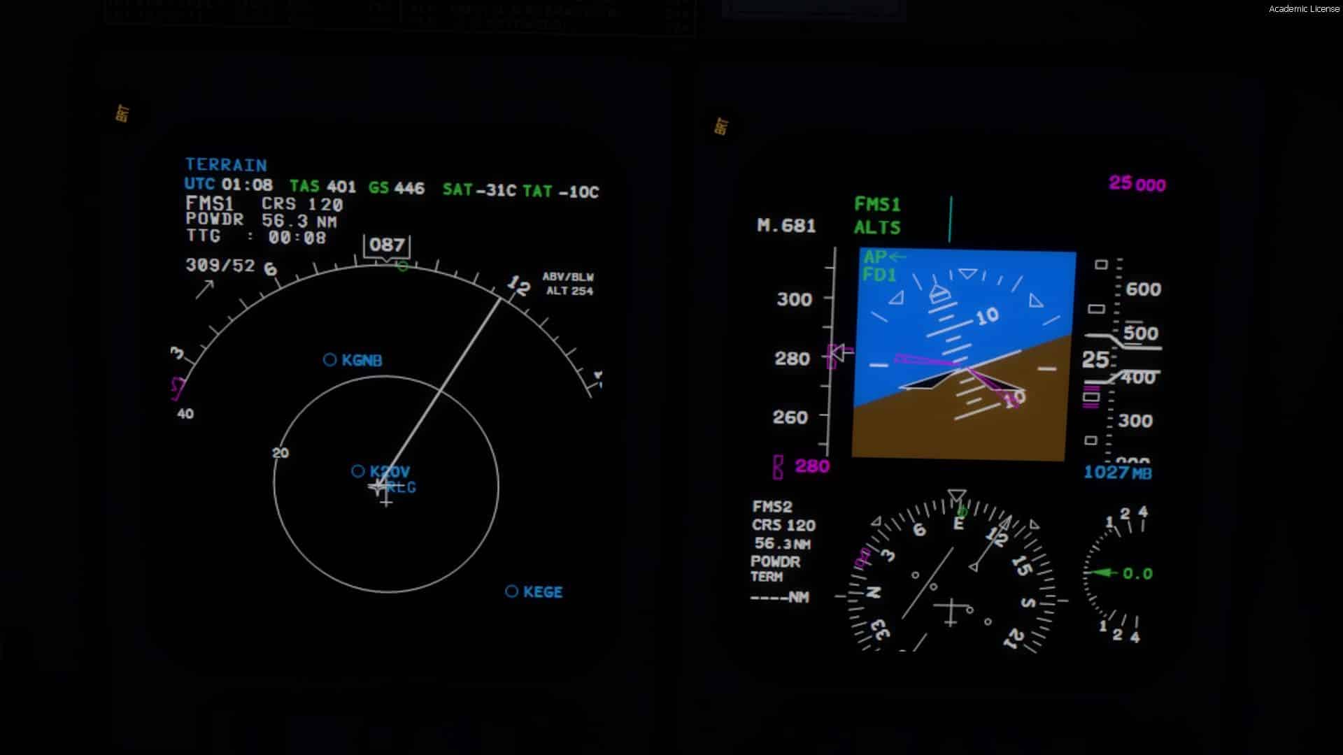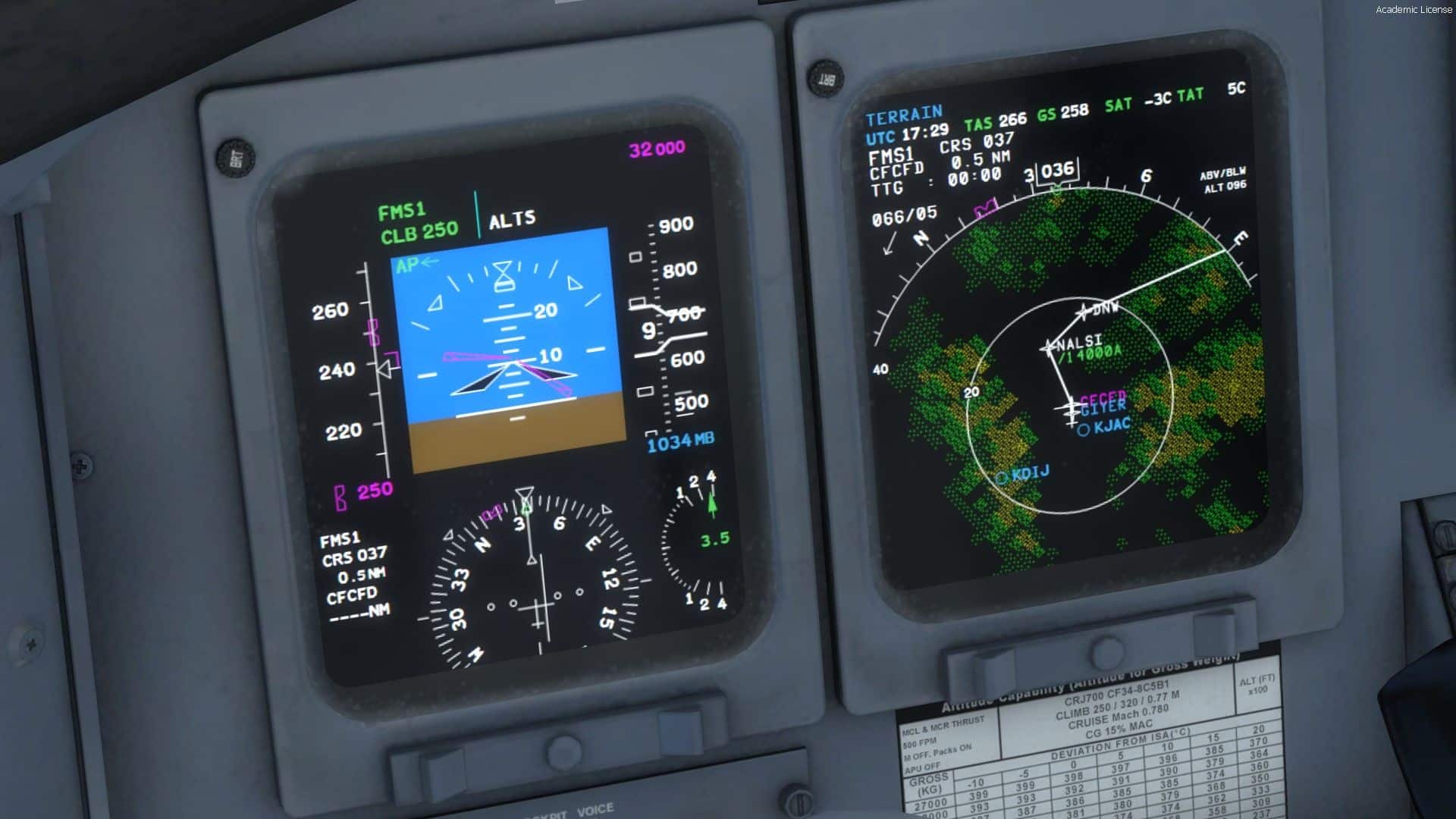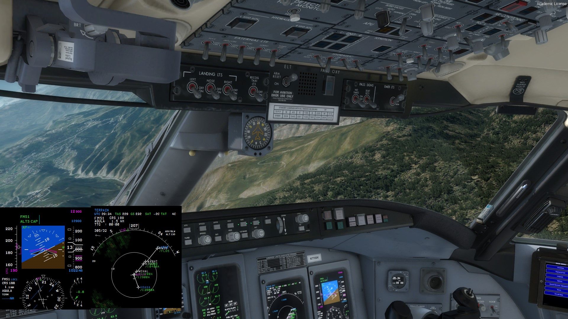 Besonders praktisch für den Flug von Jackson ist die Umsetzung des Geländeradars. Wie auch das Wetterradar (war im vorherigen Flug zu sehen) wird das Terrain auf dem Navigationsdisplay in entsprechenden Farben dargestellt. Es ist realistisch umgesetzt und funktioniert sehr gut.