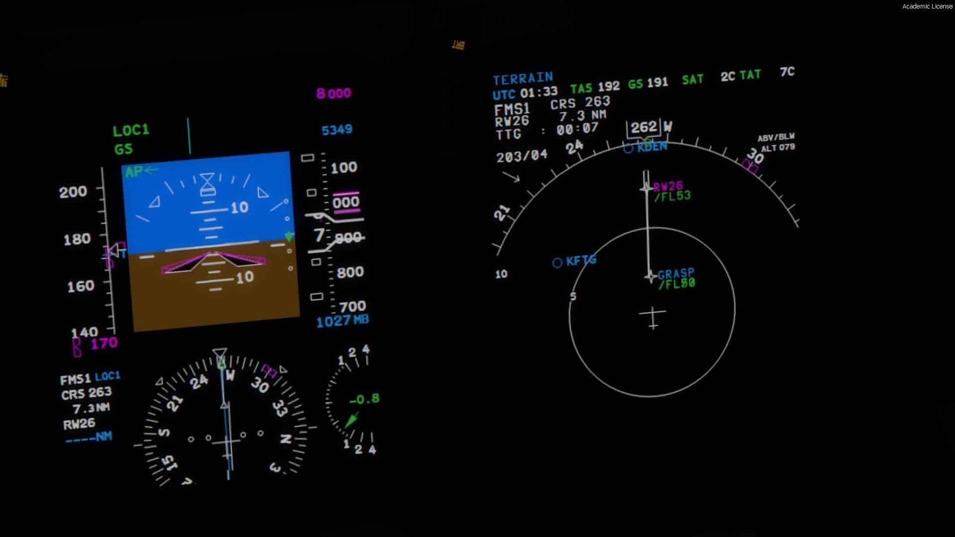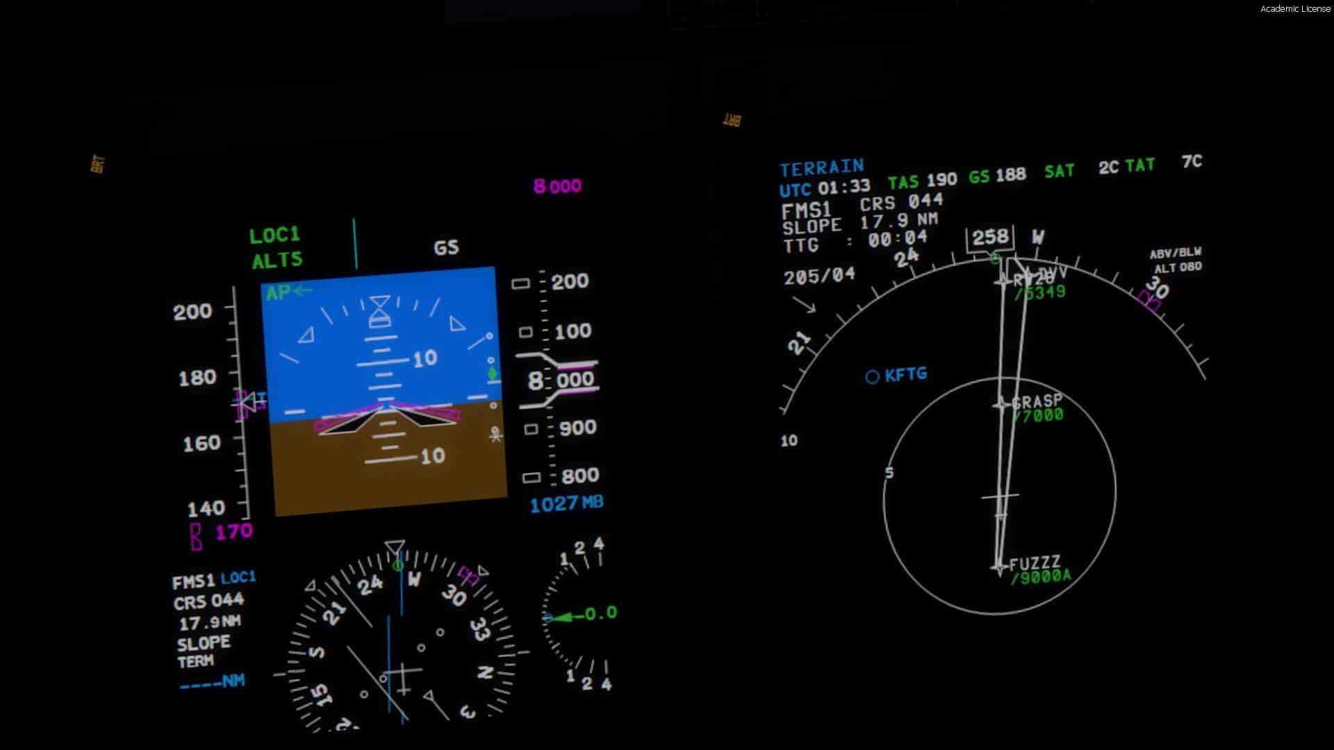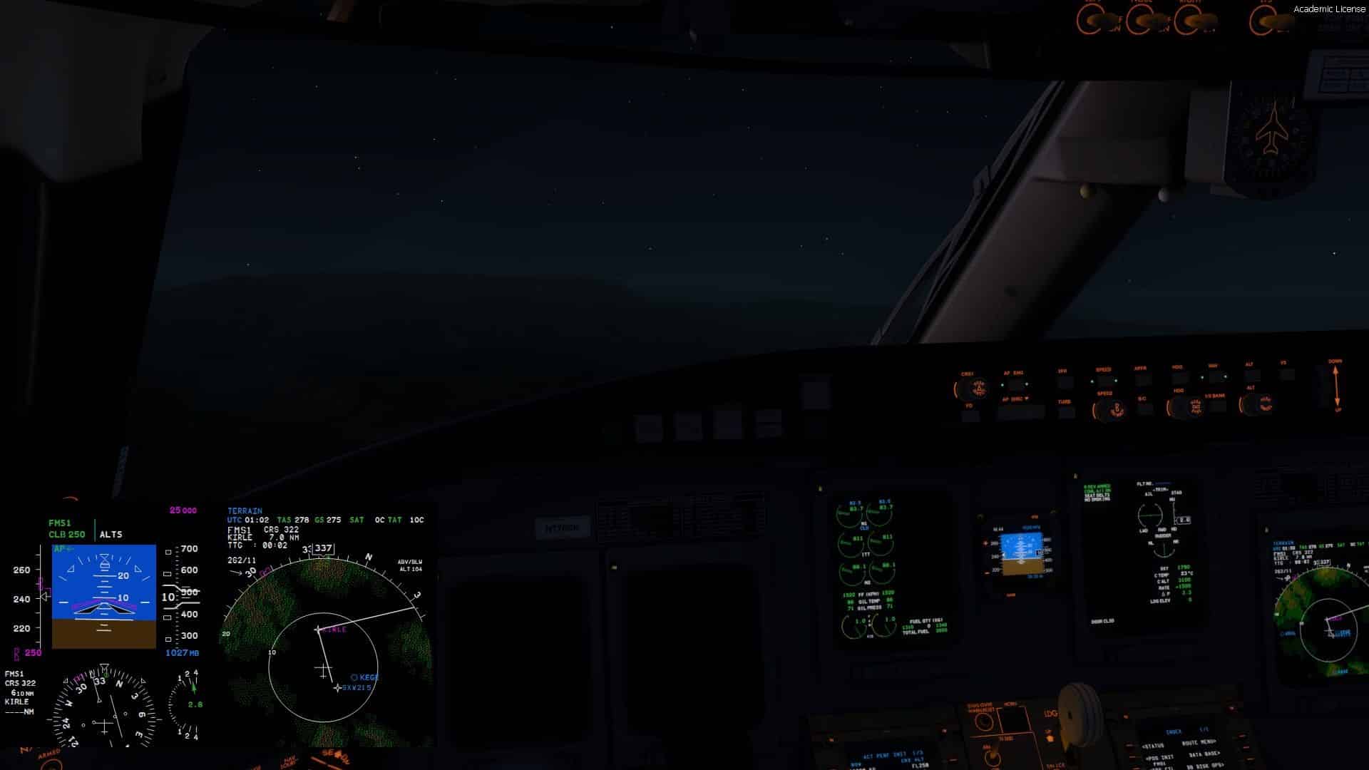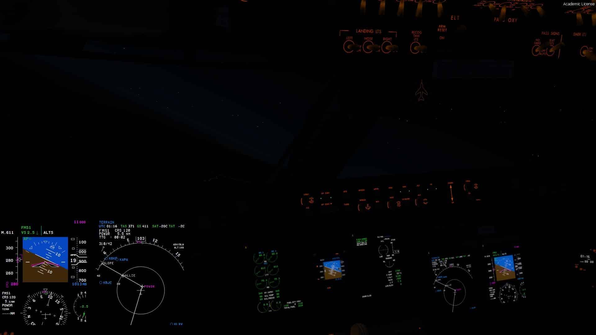 Besonders praktisch für den Flug von Jackson ist die Umsetzung des Geländeradars. Wie auch das Wetterradar (war im vorherigen Flug zu sehen) wird das Terrain auf dem Navigationsdisplay in entsprechenden Farben dargestellt. Es ist realistisch umgesetzt und funktioniert sehr gut.