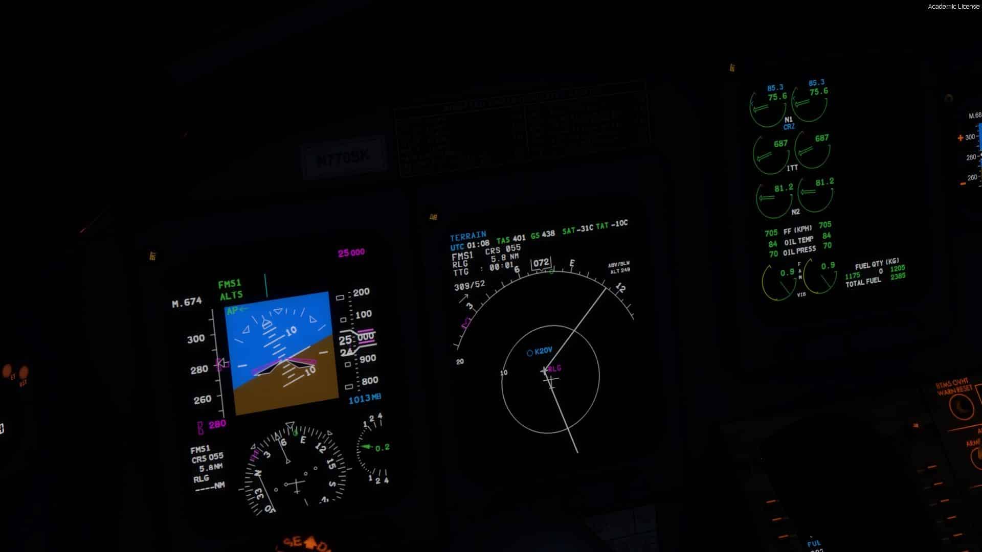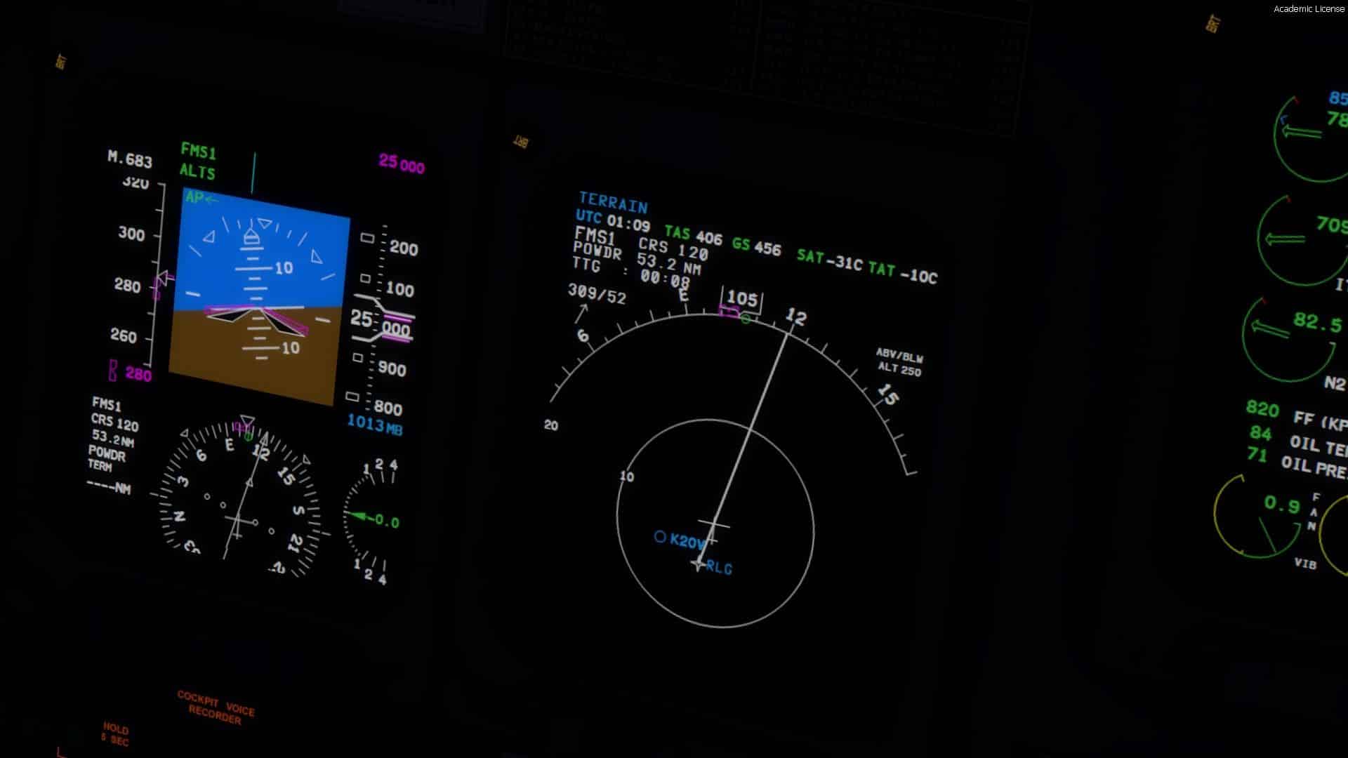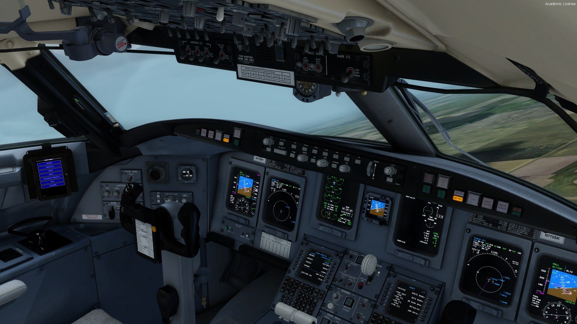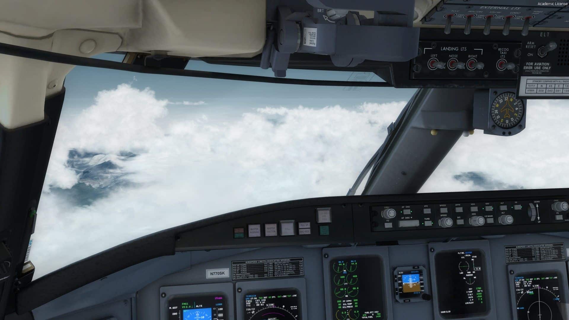 Besonders praktisch für den Flug von Jackson ist die Umsetzung des Geländeradars. Wie auch das Wetterradar (war im vorherigen Flug zu sehen) wird das Terrain auf dem Navigationsdisplay in entsprechenden Farben dargestellt. Es ist realistisch umgesetzt und funktioniert sehr gut.
