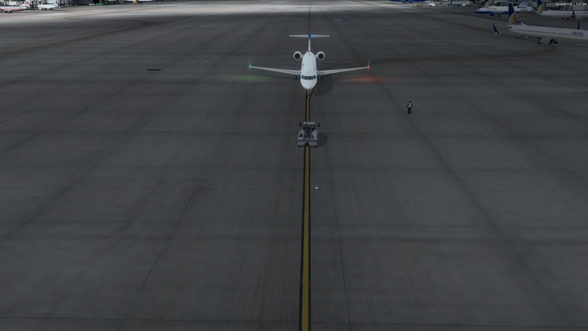 Während des Pushbacks ziehen bereits einige dichte Wolken über Denver. Das Wetter entlang der geplanten Route soll stürmisch sein. Der Start erfolgt aber zunächst bei guten Witterungsverhältnissen.