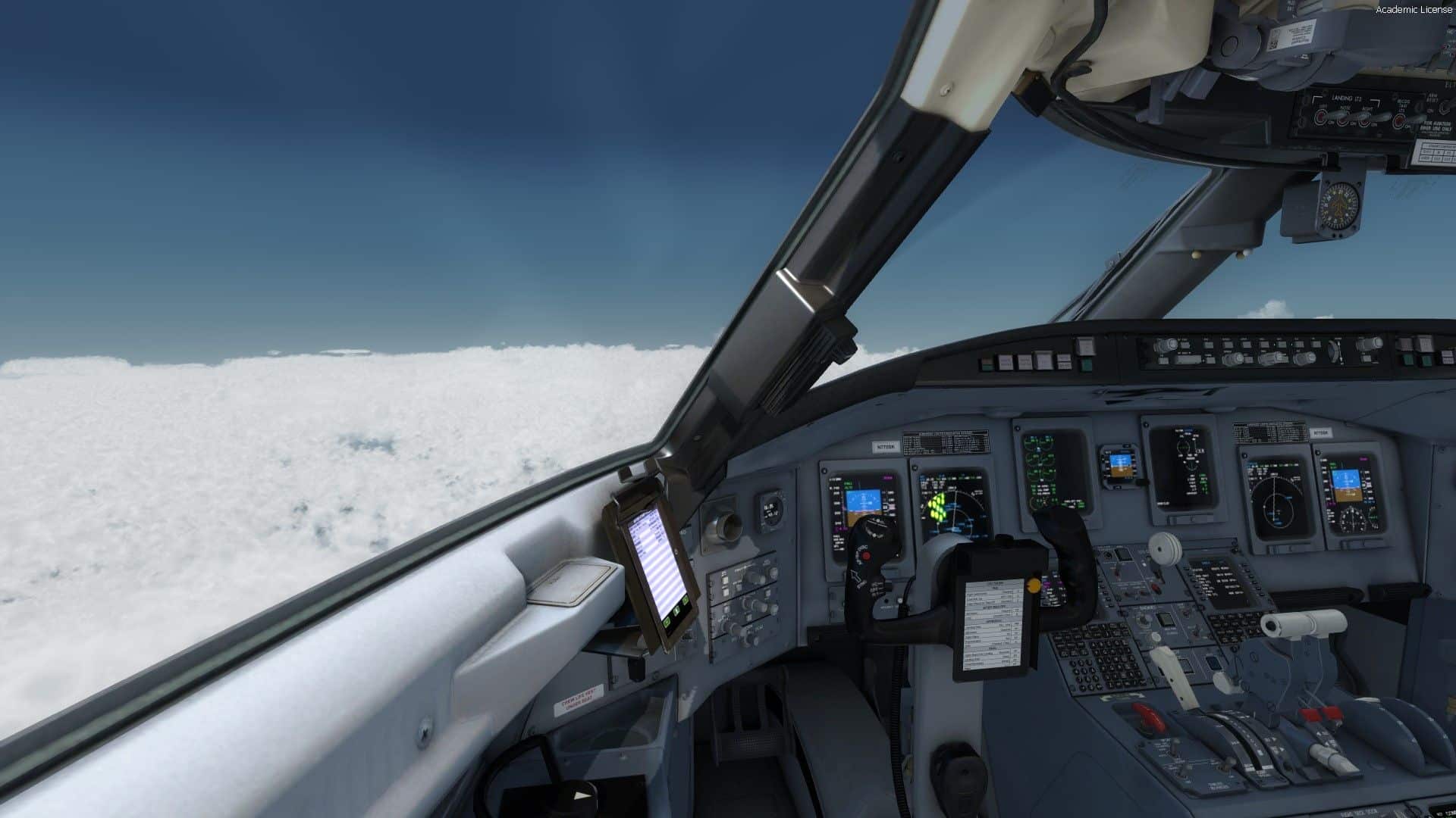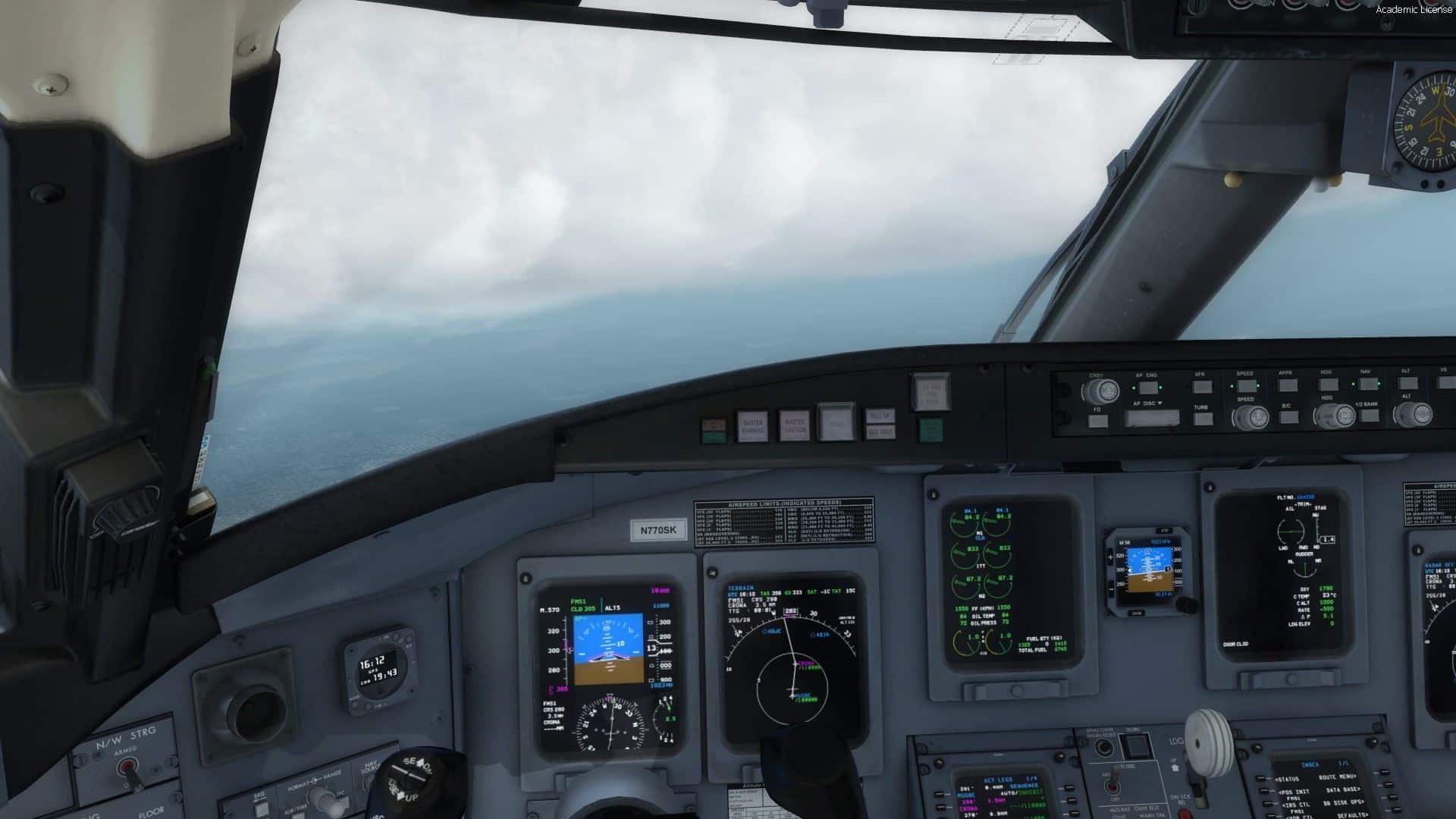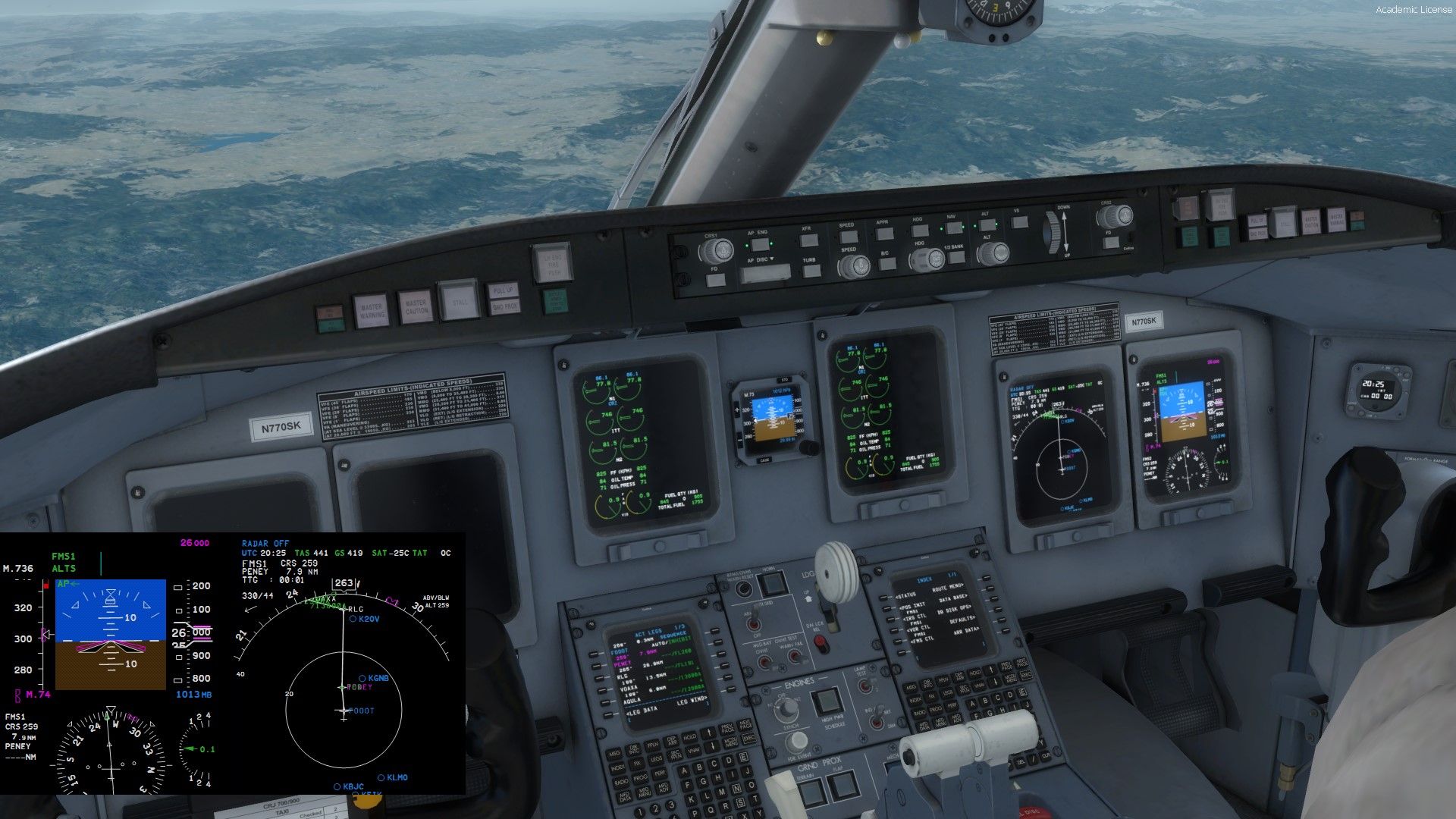 Im Reiseflug folgt der Autopilot sauber der vorgegebenen Route. Kurven werden als scharfe Ecken auf dem Navigationsdisplay dargestellt, das Flugzeug fliegt sie allerdings weich ab. Ein zu spätes Drehen und Überfliegen der Wegpunkte gibt es (im Reiseflug) nicht. Da der CRJ ohne automatische Schubregelung fliegt, will die Geschwindigkeit im Reiseflug manuell gehalten werden. Mit ein bisschen Feingefühl und kleinen Bewegungen gelingt das ziemlich gut und das Flugzeug fliegt entspannt mit Mach .74 dahin.