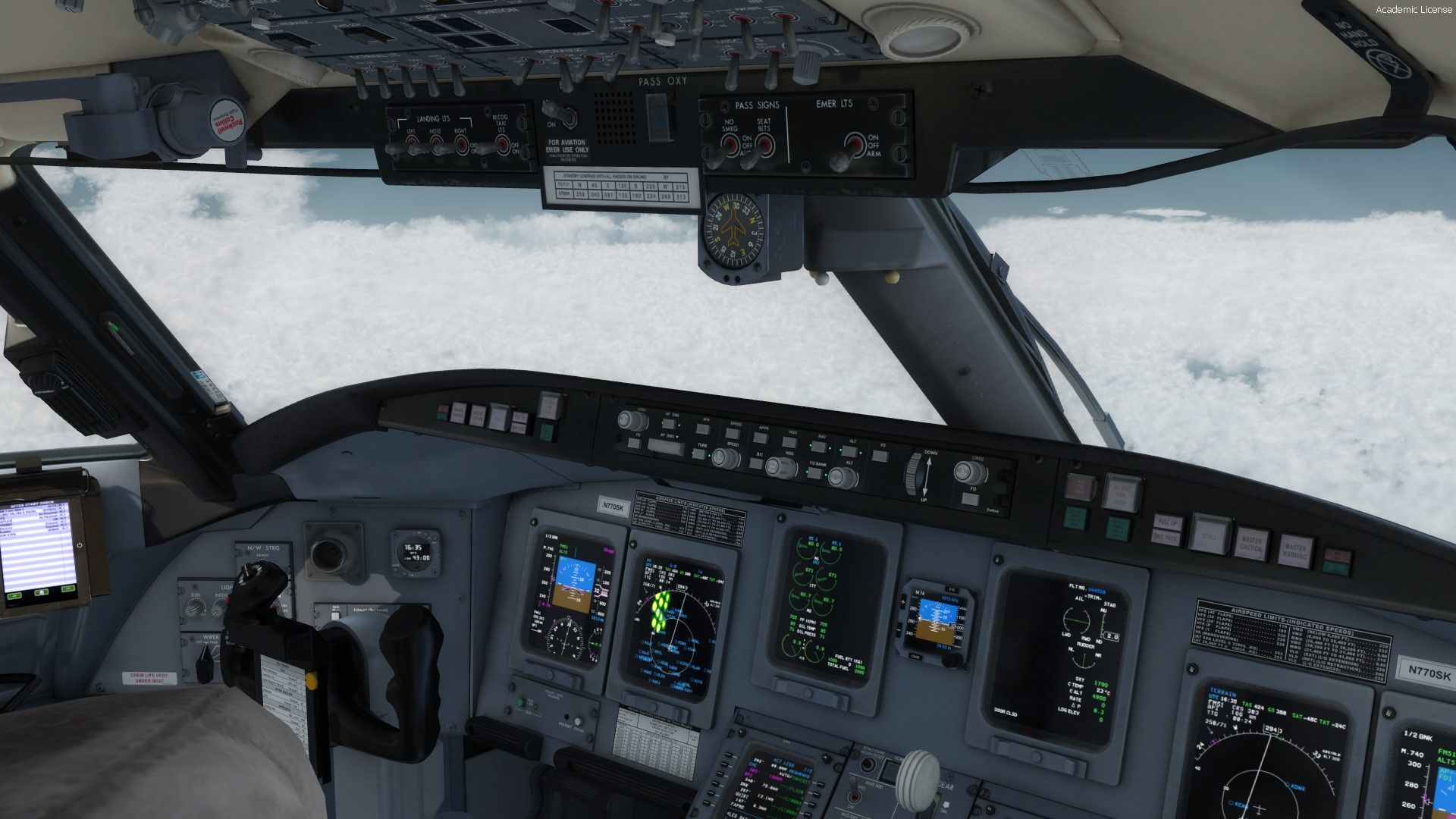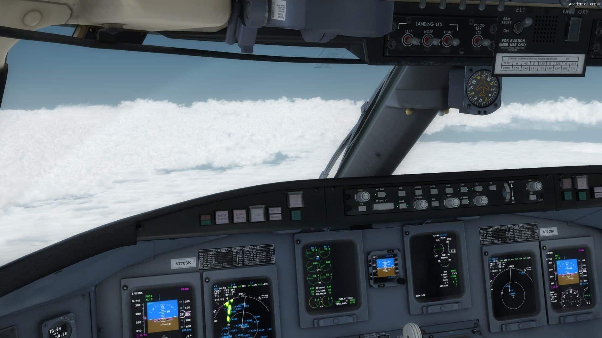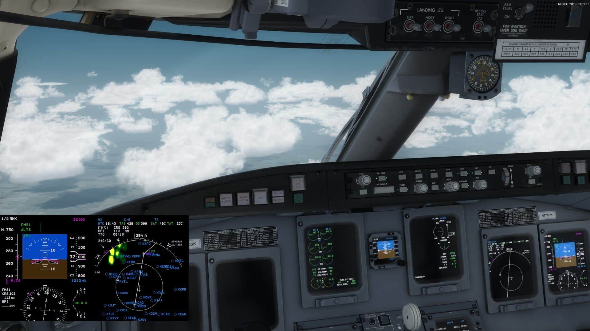 Im Reiseflug folgt der Autopilot sauber der vorgegebenen Route. Kurven werden als scharfe Ecken auf dem Navigationsdisplay dargestellt, das Flugzeug fliegt sie allerdings weich ab. Ein zu spätes Drehen und Überfliegen der Wegpunkte gibt es (im Reiseflug) nicht. Da der CRJ ohne automatische Schubregelung fliegt, will die Geschwindigkeit im Reiseflug manuell gehalten werden. Mit ein bisschen Feingefühl und kleinen Bewegungen gelingt das ziemlich gut und das Flugzeug fliegt entspannt mit Mach .74 dahin.