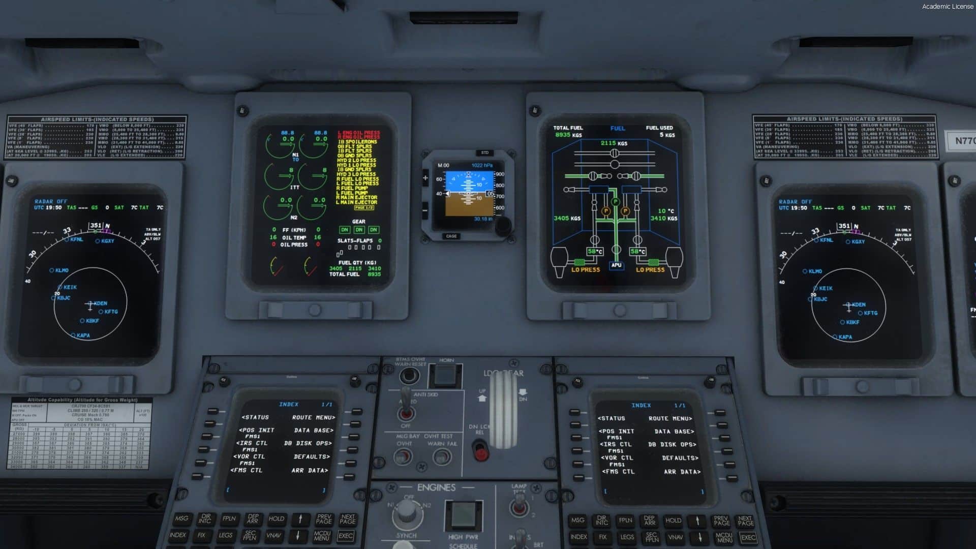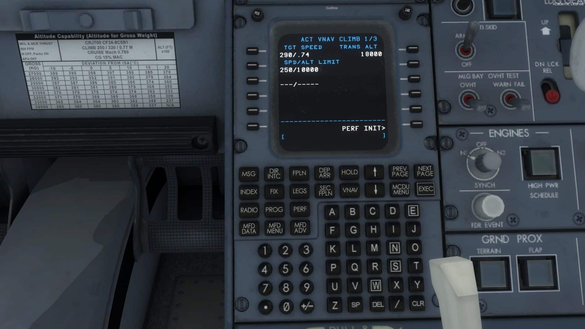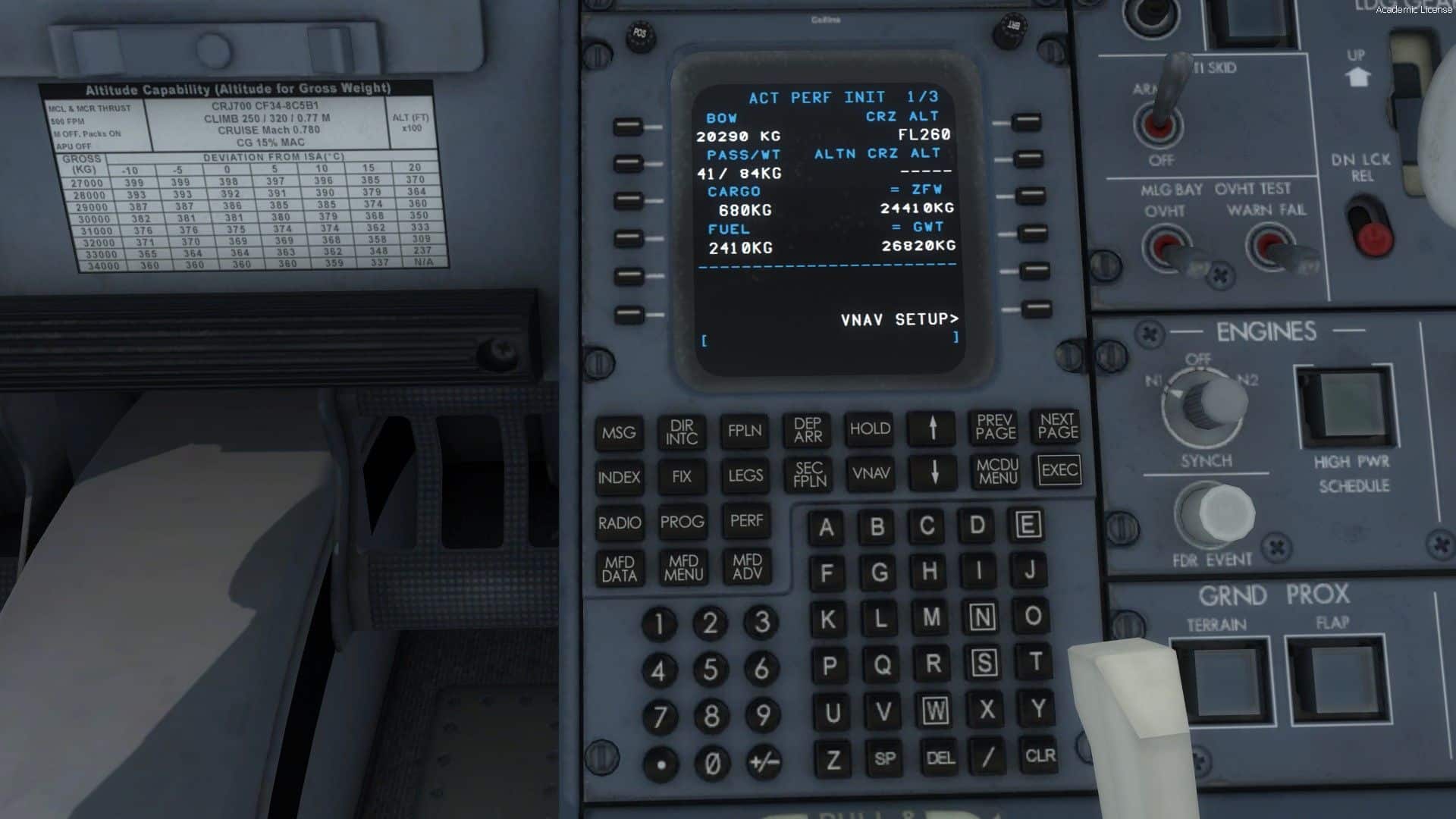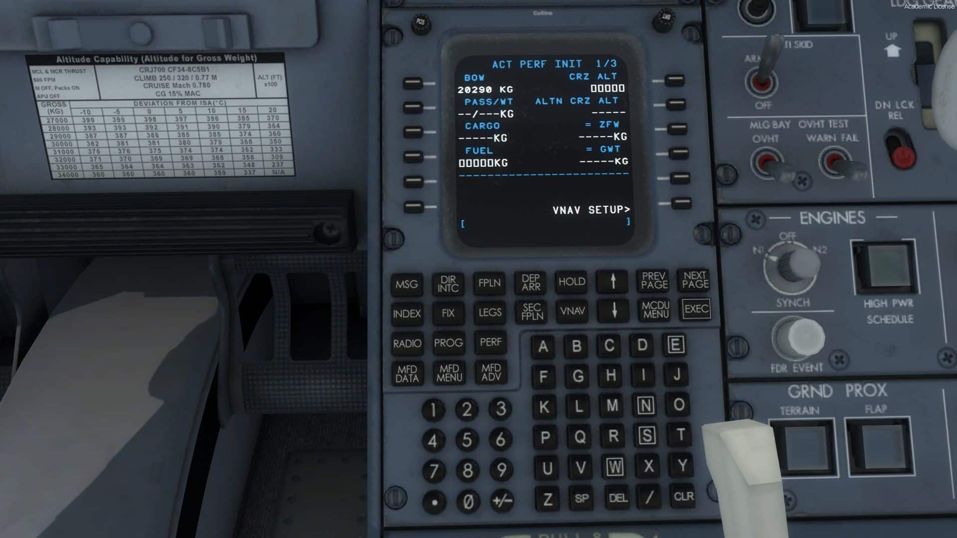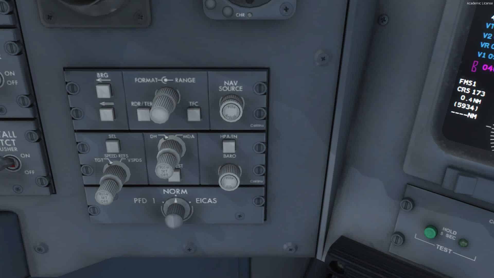 Anders als bei den meisten größeren Flugzeugen werden Takeoff-Speeds nicht im FMC berechnet. Sie sind in einer Tabelle, die ebenfalls zur Dokumentation gehört, verzeichnet. Nach Gewicht, Höhe, Temperatur und Klappensetting kann man die entsprechenden Geschwindigkeiten ausfindig machen und über einen Drehregler links neben dem PFD eintragen. Dort befinden sich auch die Steuerelemente zur Einstellung des Navigationsdisplays. Neben Radius und Modus kann an dieser Stelle auch Terrain bzw. Wetter dazugeschaltet werden. Zudem wird an diesem Panel auch der Luftdruck eingestellt.