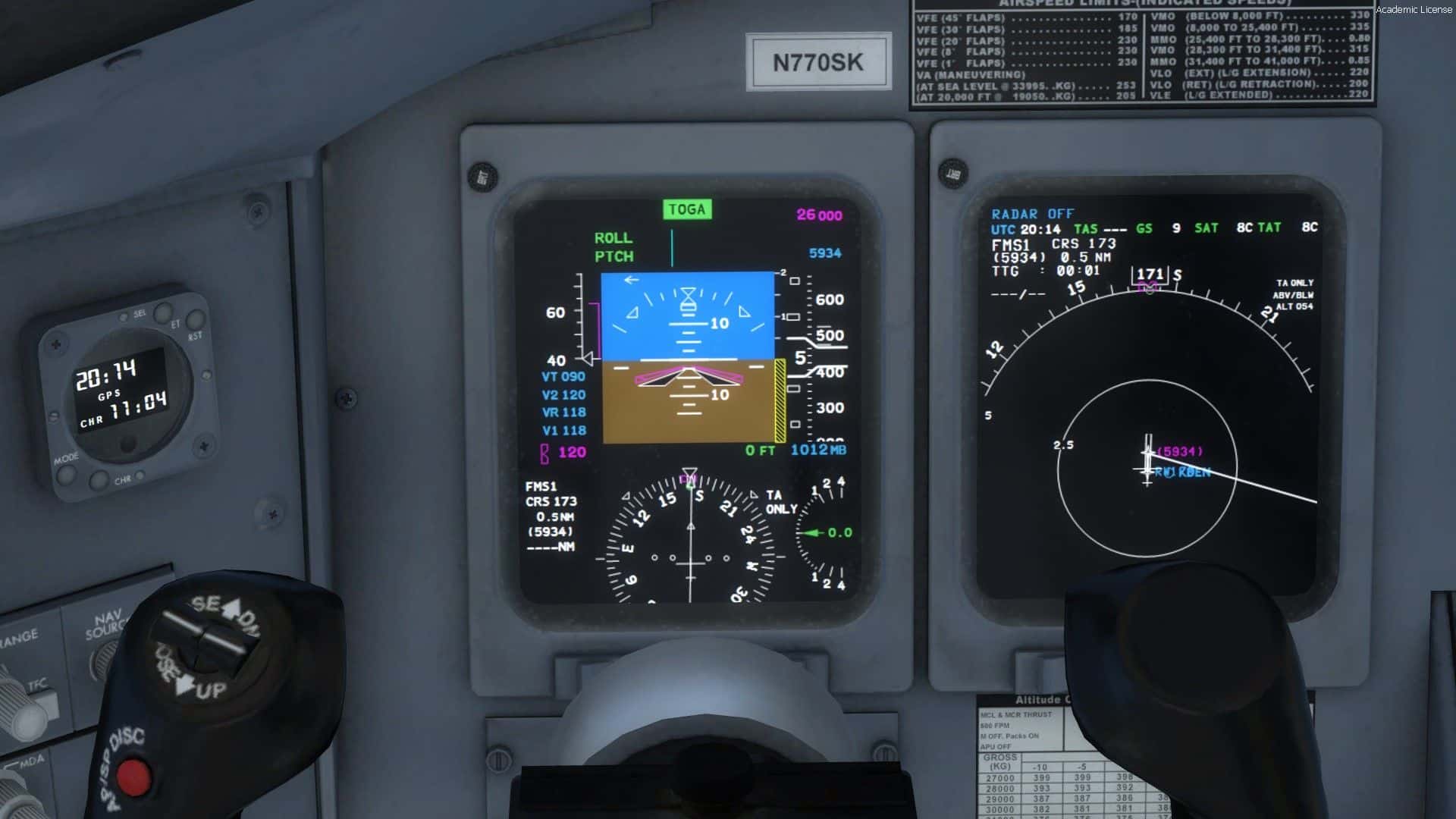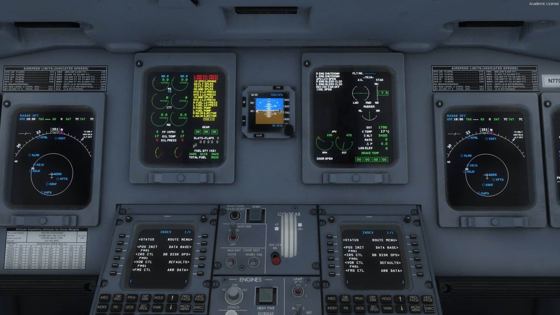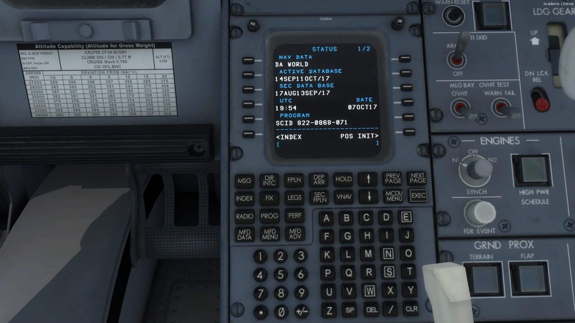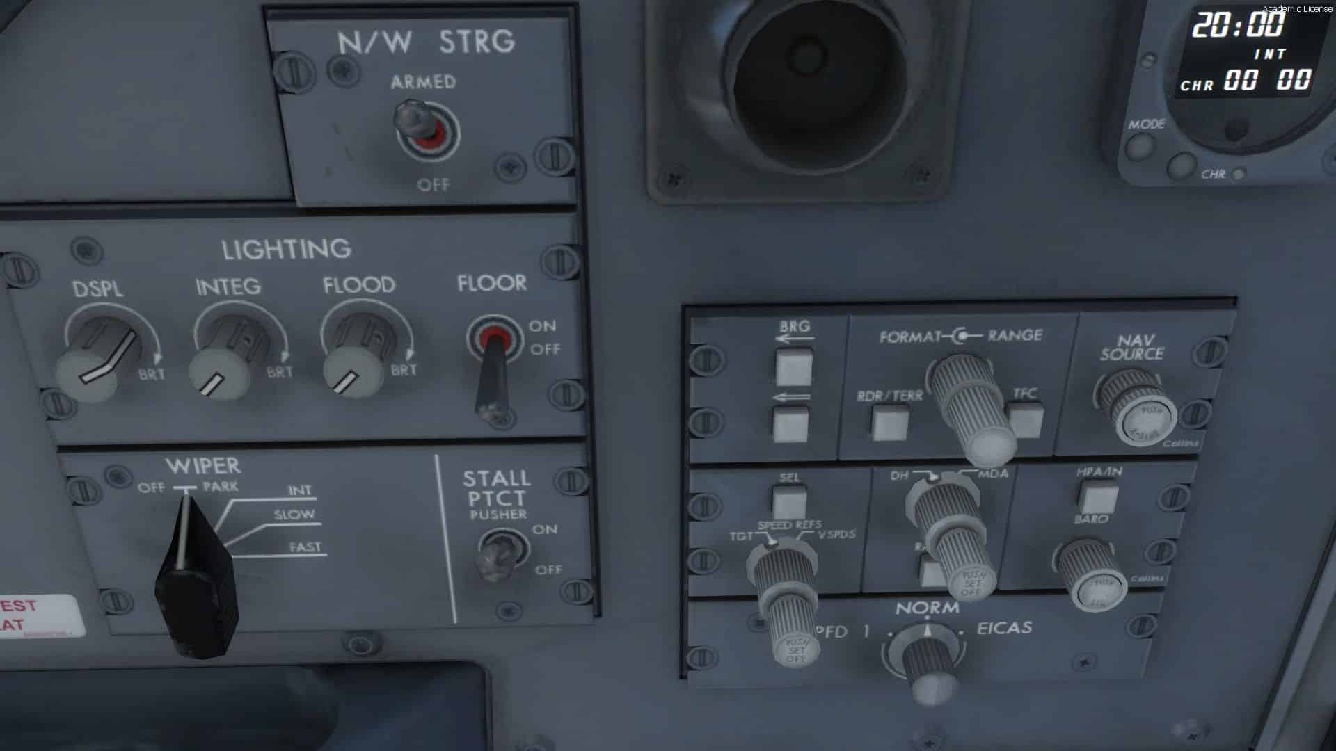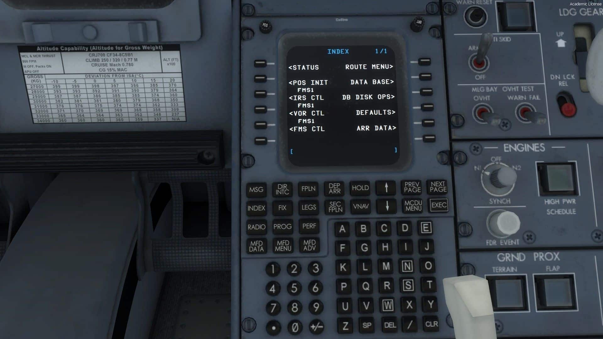 Anders als bei den meisten größeren Flugzeugen werden Takeoff-Speeds nicht im FMC berechnet. Sie sind in einer Tabelle, die ebenfalls zur Dokumentation gehört, verzeichnet. Nach Gewicht, Höhe, Temperatur und Klappensetting kann man die entsprechenden Geschwindigkeiten ausfindig machen und über einen Drehregler links neben dem PFD eintragen. Dort befinden sich auch die Steuerelemente zur Einstellung des Navigationsdisplays. Neben Radius und Modus kann an dieser Stelle auch Terrain bzw. Wetter dazugeschaltet werden. Zudem wird an diesem Panel auch der Luftdruck eingestellt.