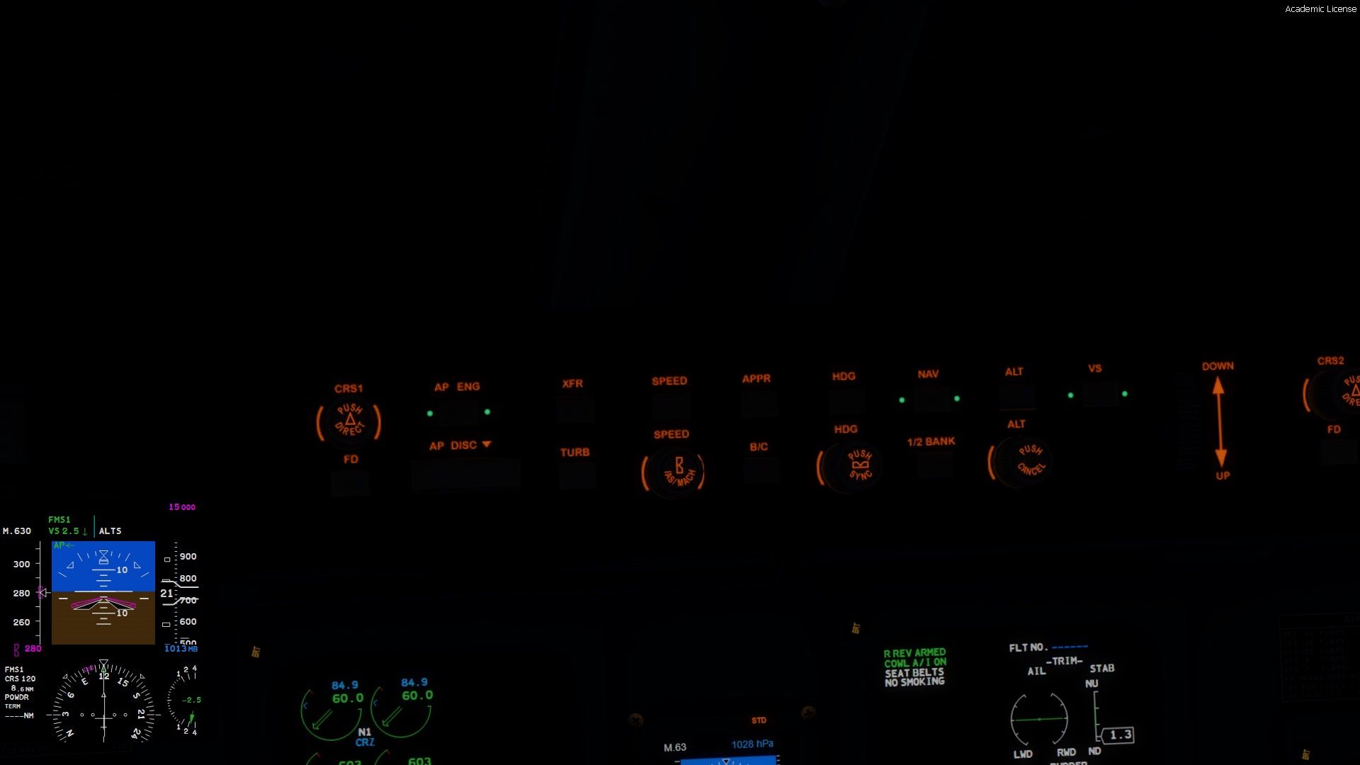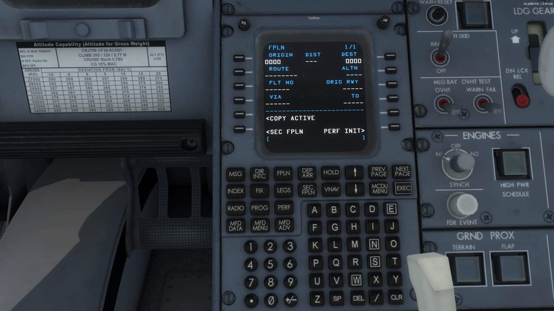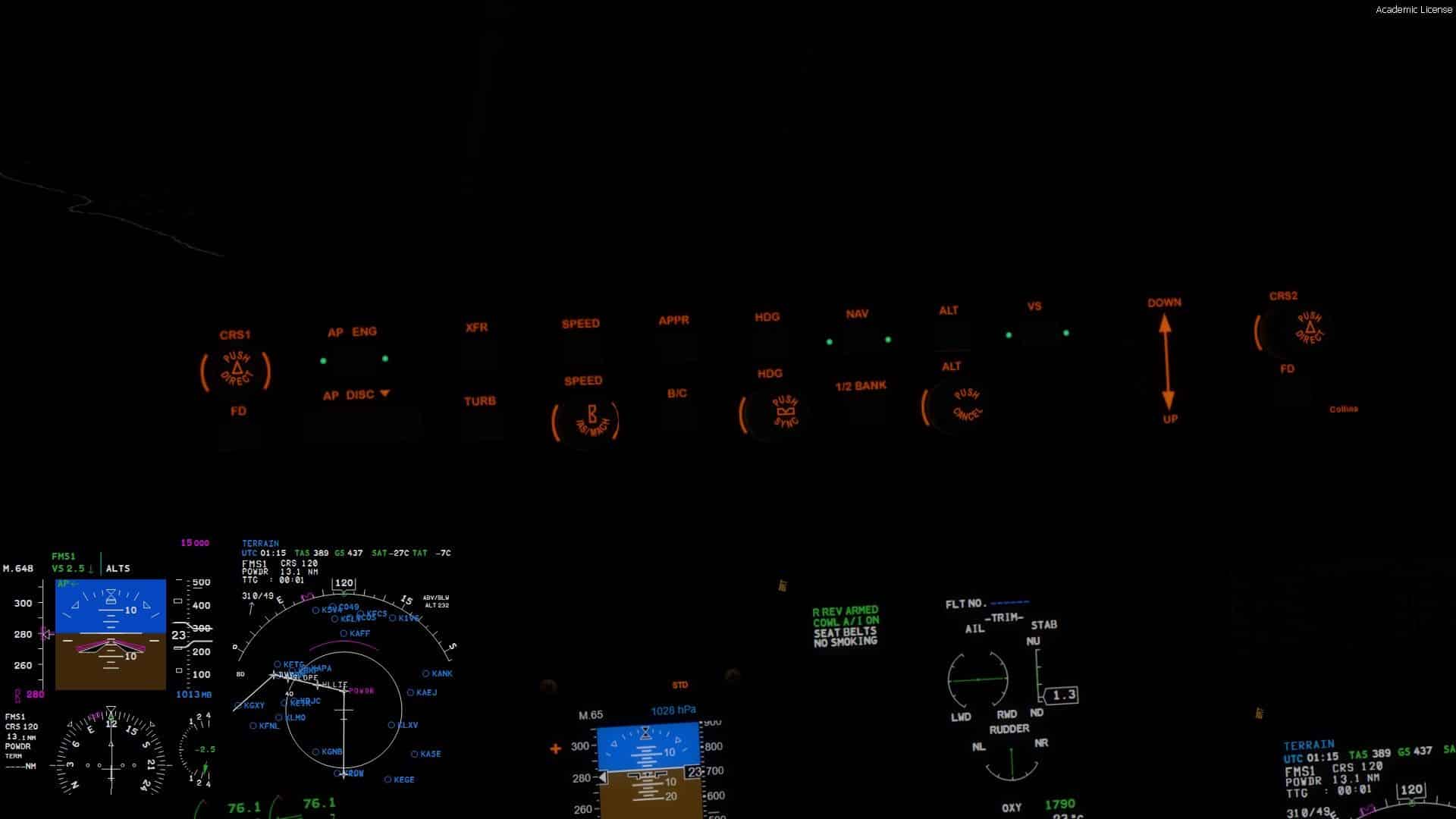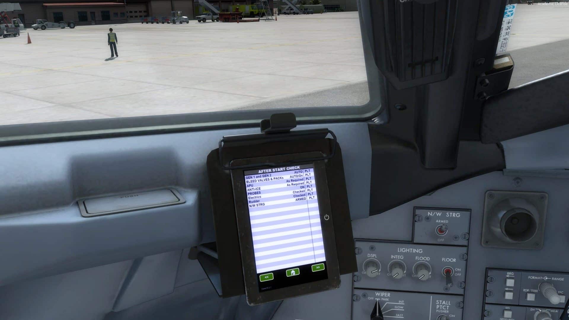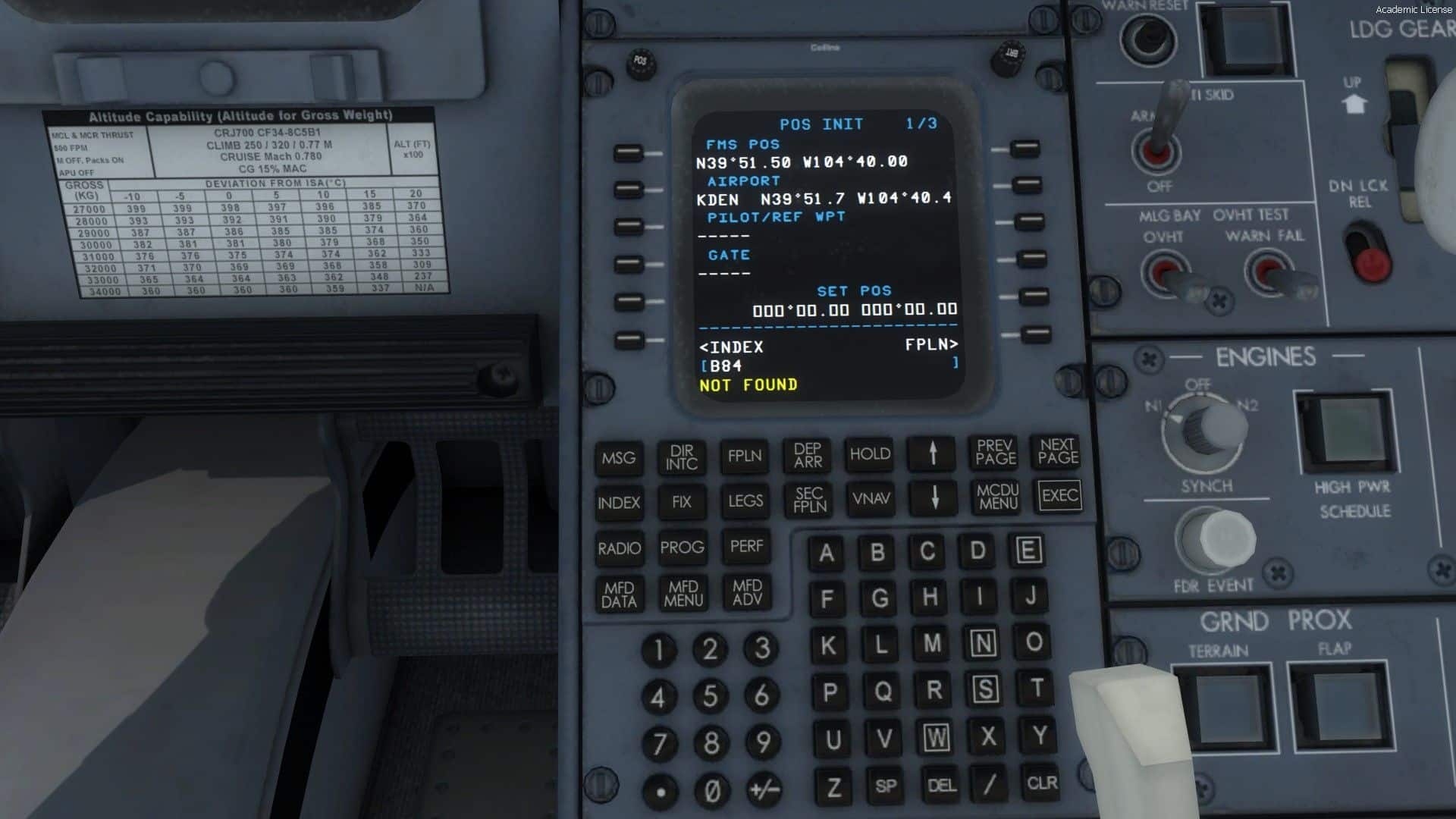 Anders als bei den meisten größeren Flugzeugen werden Takeoff-Speeds nicht im FMC berechnet. Sie sind in einer Tabelle, die ebenfalls zur Dokumentation gehört, verzeichnet. Nach Gewicht, Höhe, Temperatur und Klappensetting kann man die entsprechenden Geschwindigkeiten ausfindig machen und über einen Drehregler links neben dem PFD eintragen. Dort befinden sich auch die Steuerelemente zur Einstellung des Navigationsdisplays. Neben Radius und Modus kann an dieser Stelle auch Terrain bzw. Wetter dazugeschaltet werden. Zudem wird an diesem Panel auch der Luftdruck eingestellt.