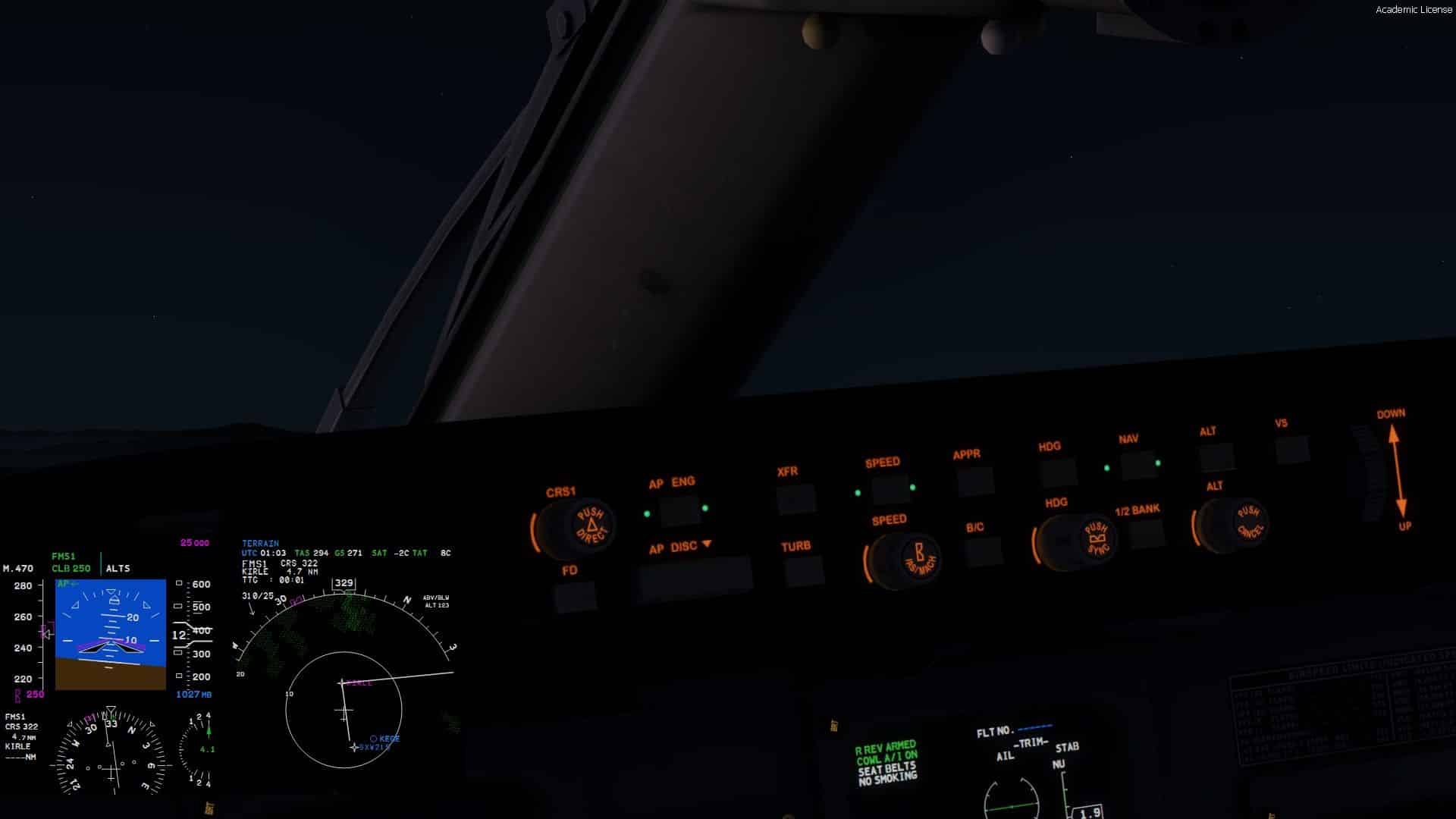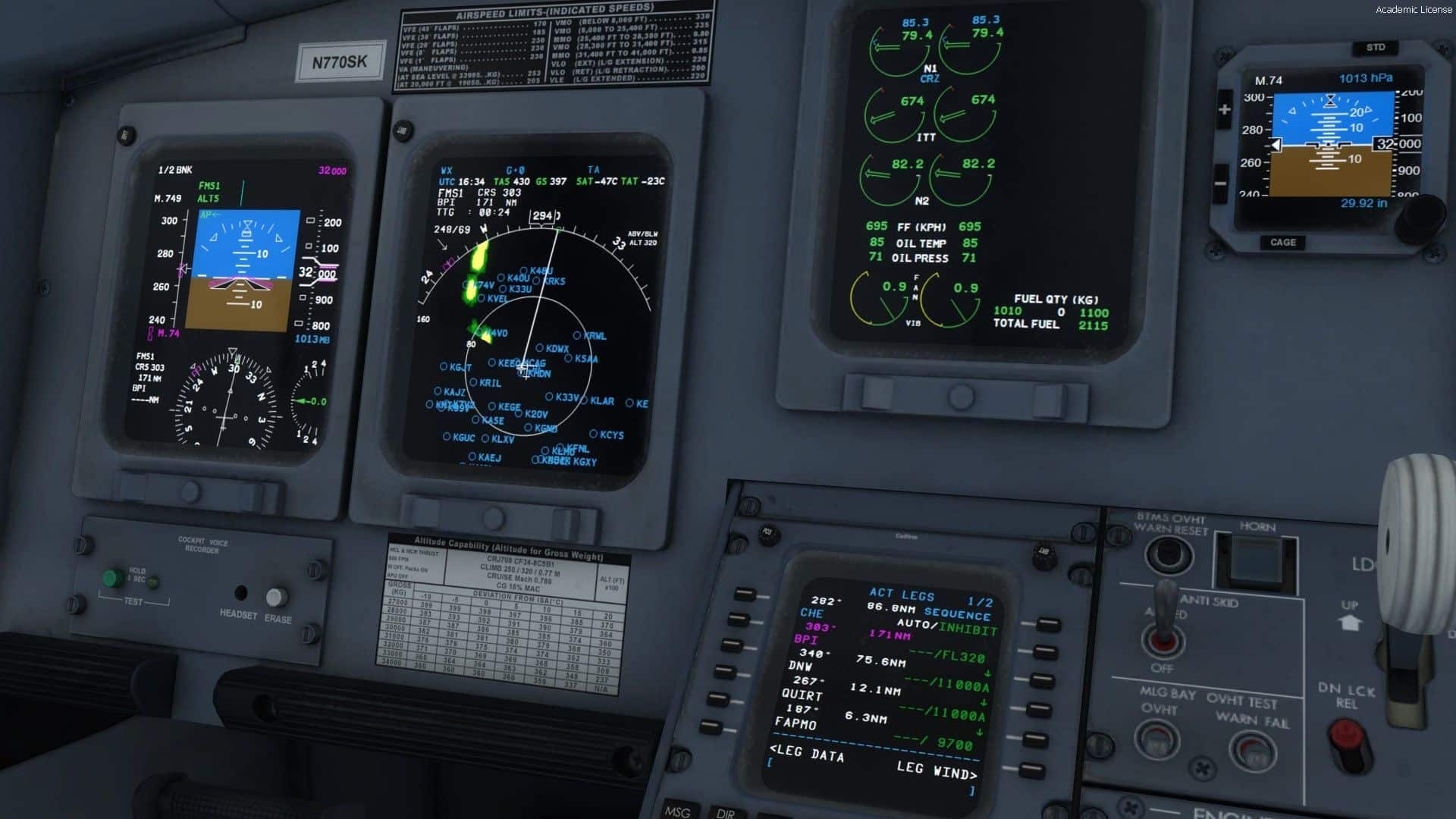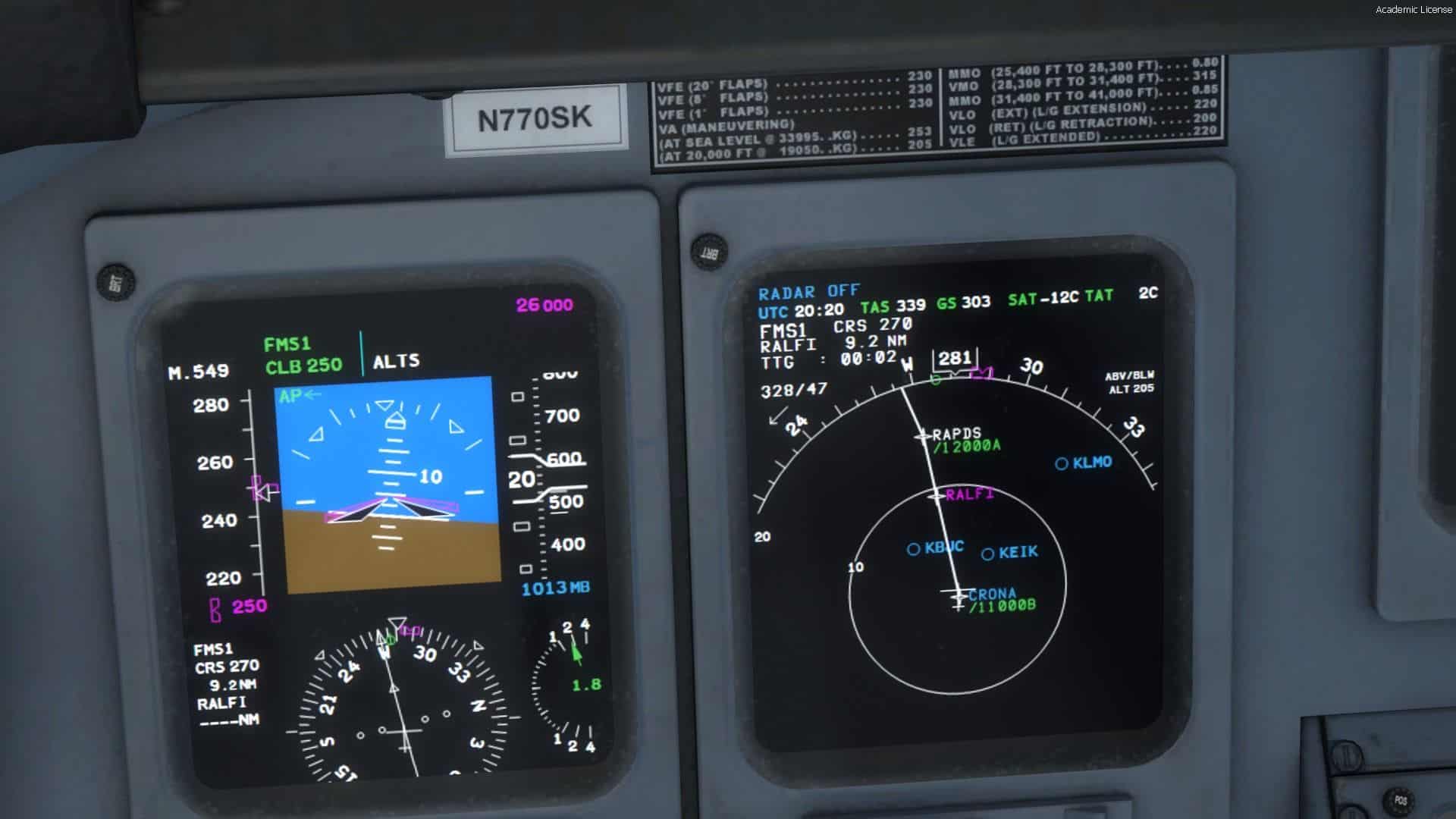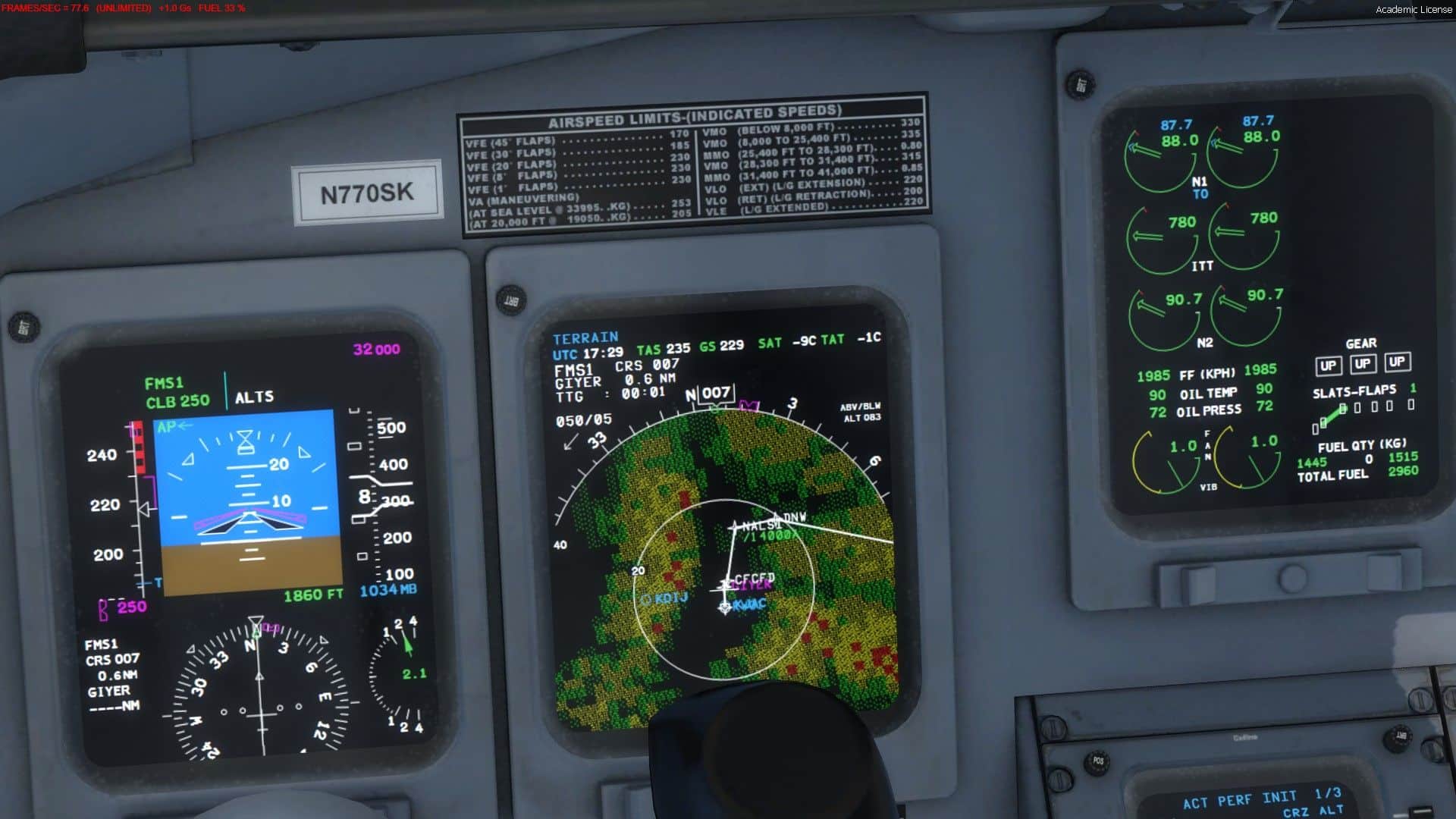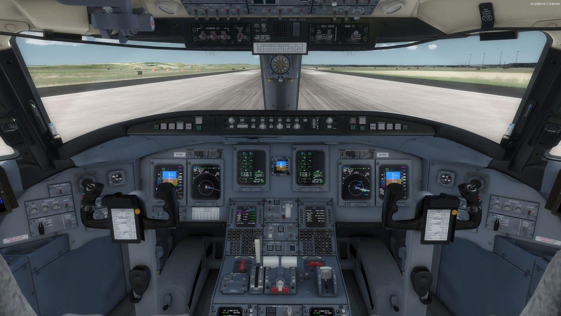 Anders als bei den meisten größeren Flugzeugen werden Takeoff-Speeds nicht im FMC berechnet. Sie sind in einer Tabelle, die ebenfalls zur Dokumentation gehört, verzeichnet. Nach Gewicht, Höhe, Temperatur und Klappensetting kann man die entsprechenden Geschwindigkeiten ausfindig machen und über einen Drehregler links neben dem PFD eintragen. Dort befinden sich auch die Steuerelemente zur Einstellung des Navigationsdisplays. Neben Radius und Modus kann an dieser Stelle auch Terrain bzw. Wetter dazugeschaltet werden. Zudem wird an diesem Panel auch der Luftdruck eingestellt.