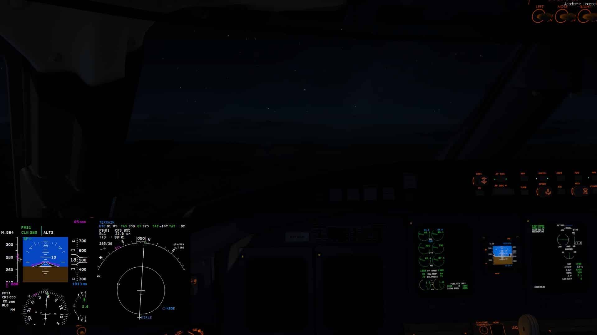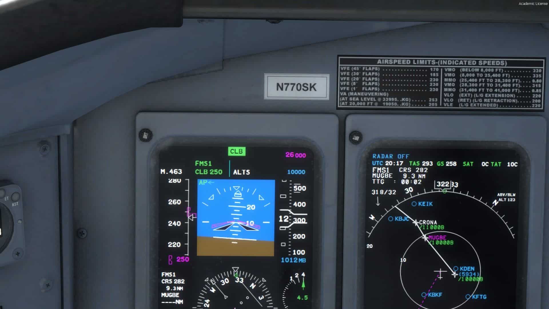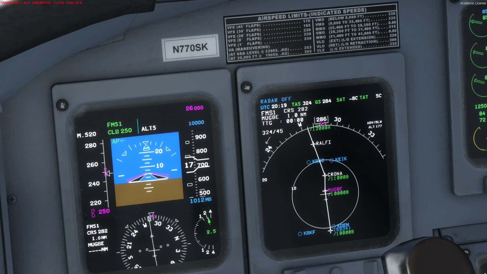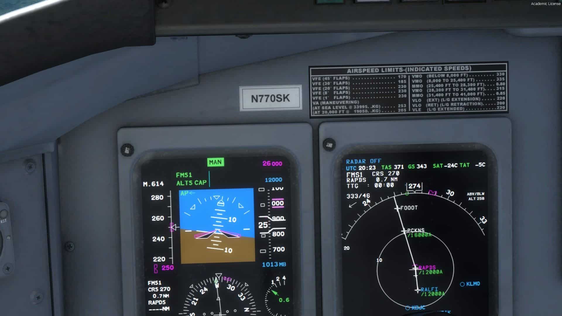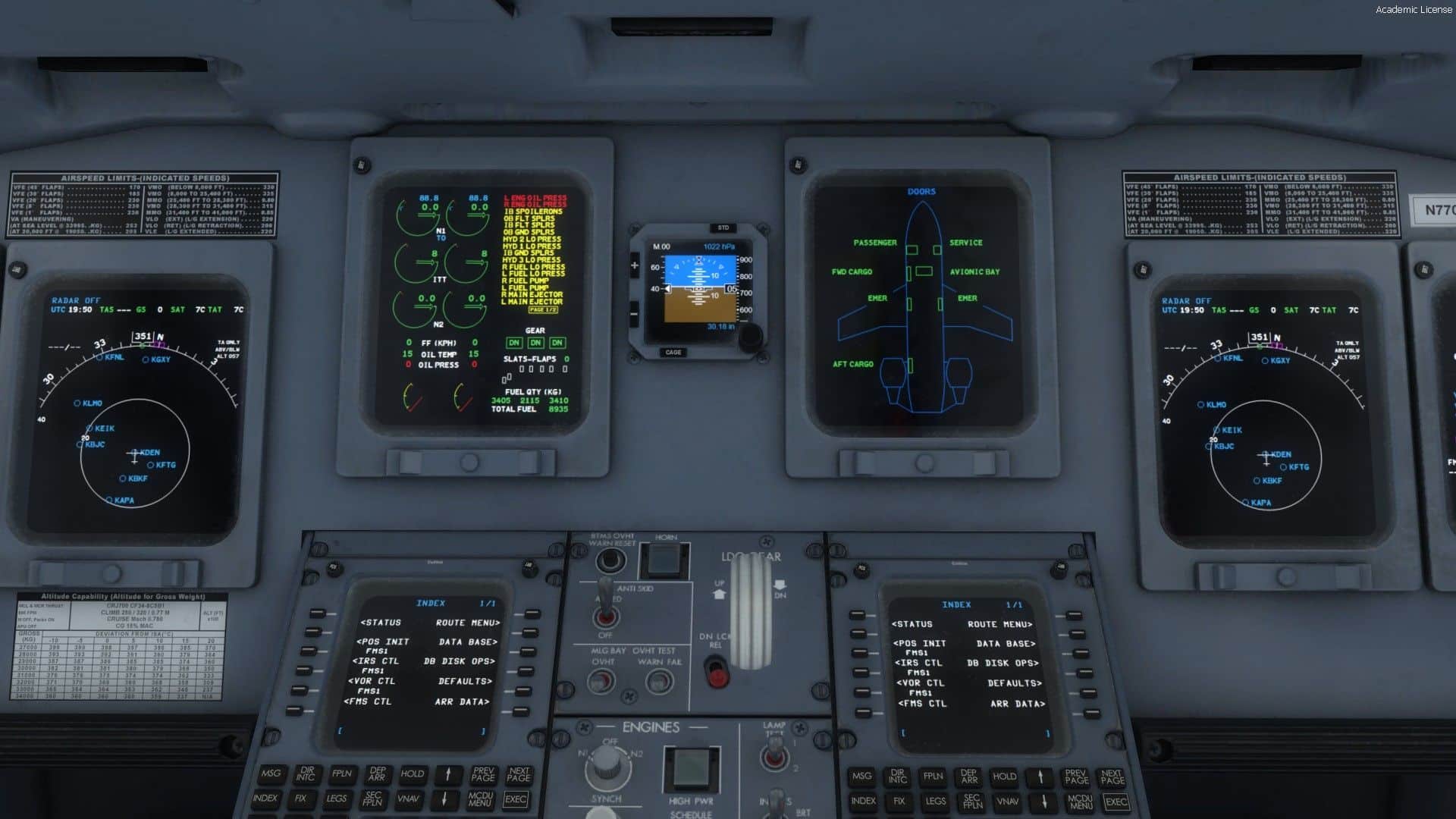 Anders als bei den meisten größeren Flugzeugen werden Takeoff-Speeds nicht im FMC berechnet. Sie sind in einer Tabelle, die ebenfalls zur Dokumentation gehört, verzeichnet. Nach Gewicht, Höhe, Temperatur und Klappensetting kann man die entsprechenden Geschwindigkeiten ausfindig machen und über einen Drehregler links neben dem PFD eintragen. Dort befinden sich auch die Steuerelemente zur Einstellung des Navigationsdisplays. Neben Radius und Modus kann an dieser Stelle auch Terrain bzw. Wetter dazugeschaltet werden. Zudem wird an diesem Panel auch der Luftdruck eingestellt.