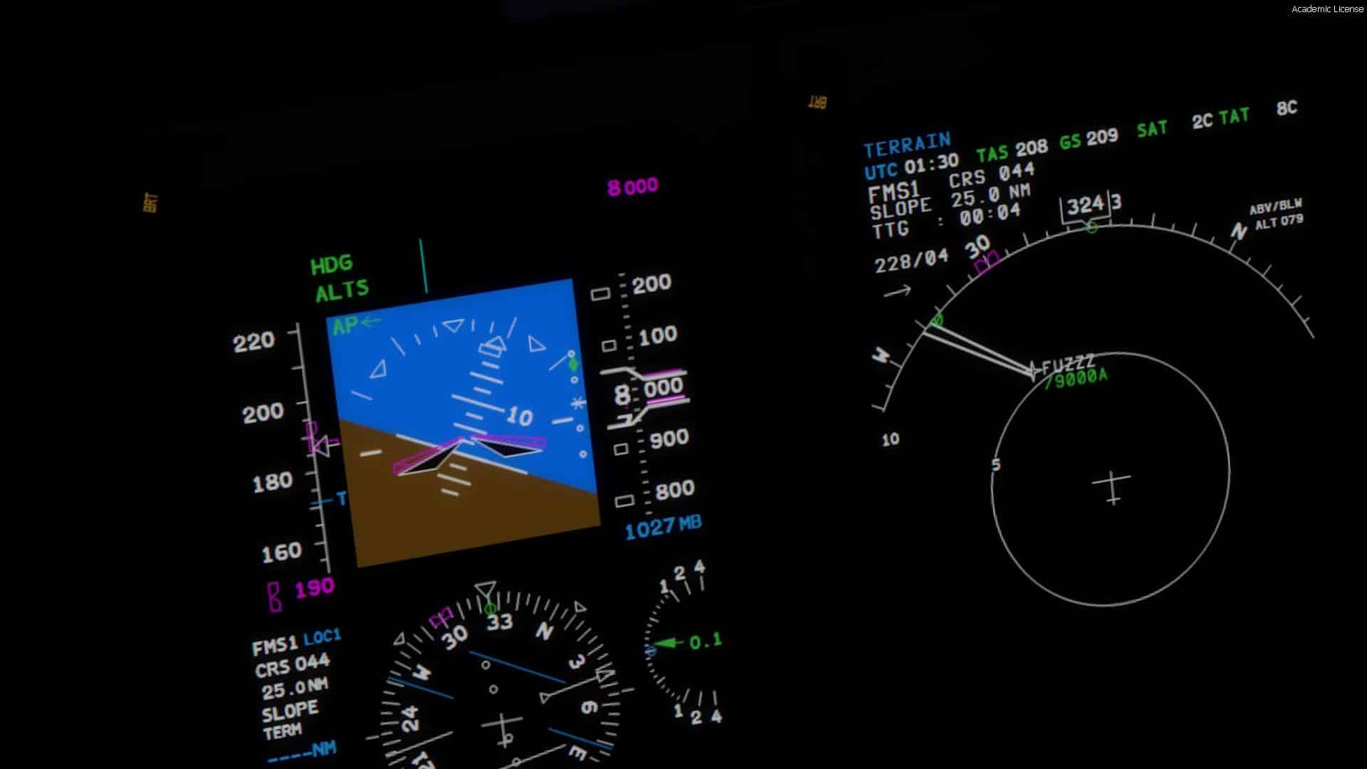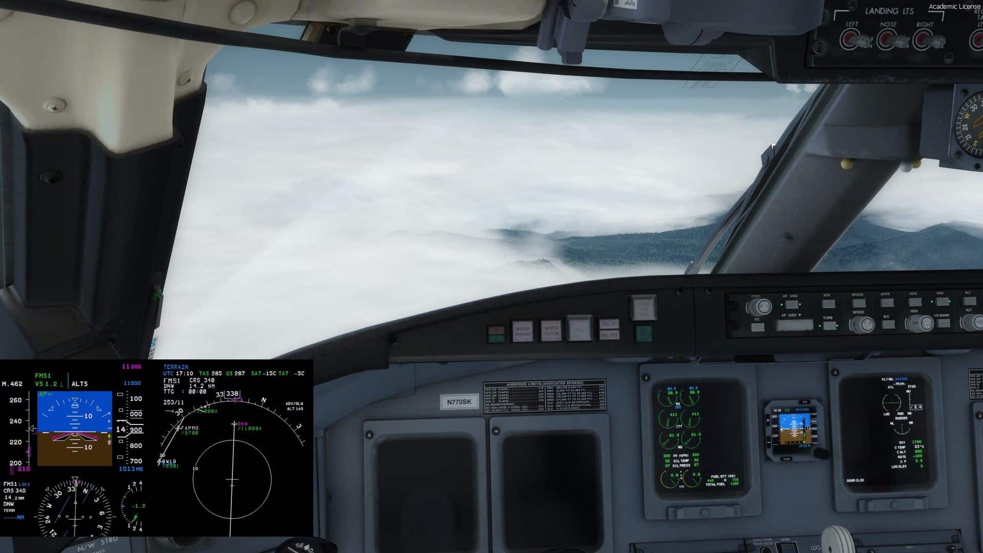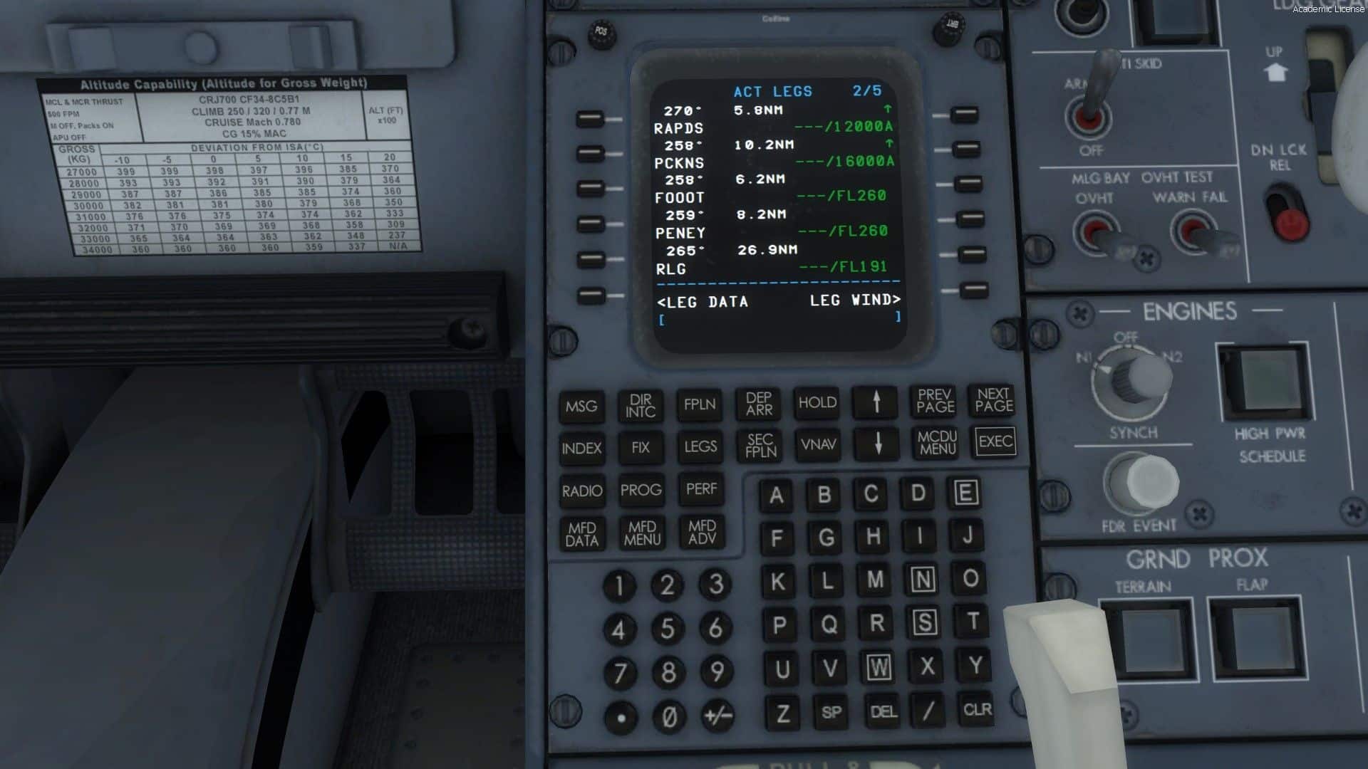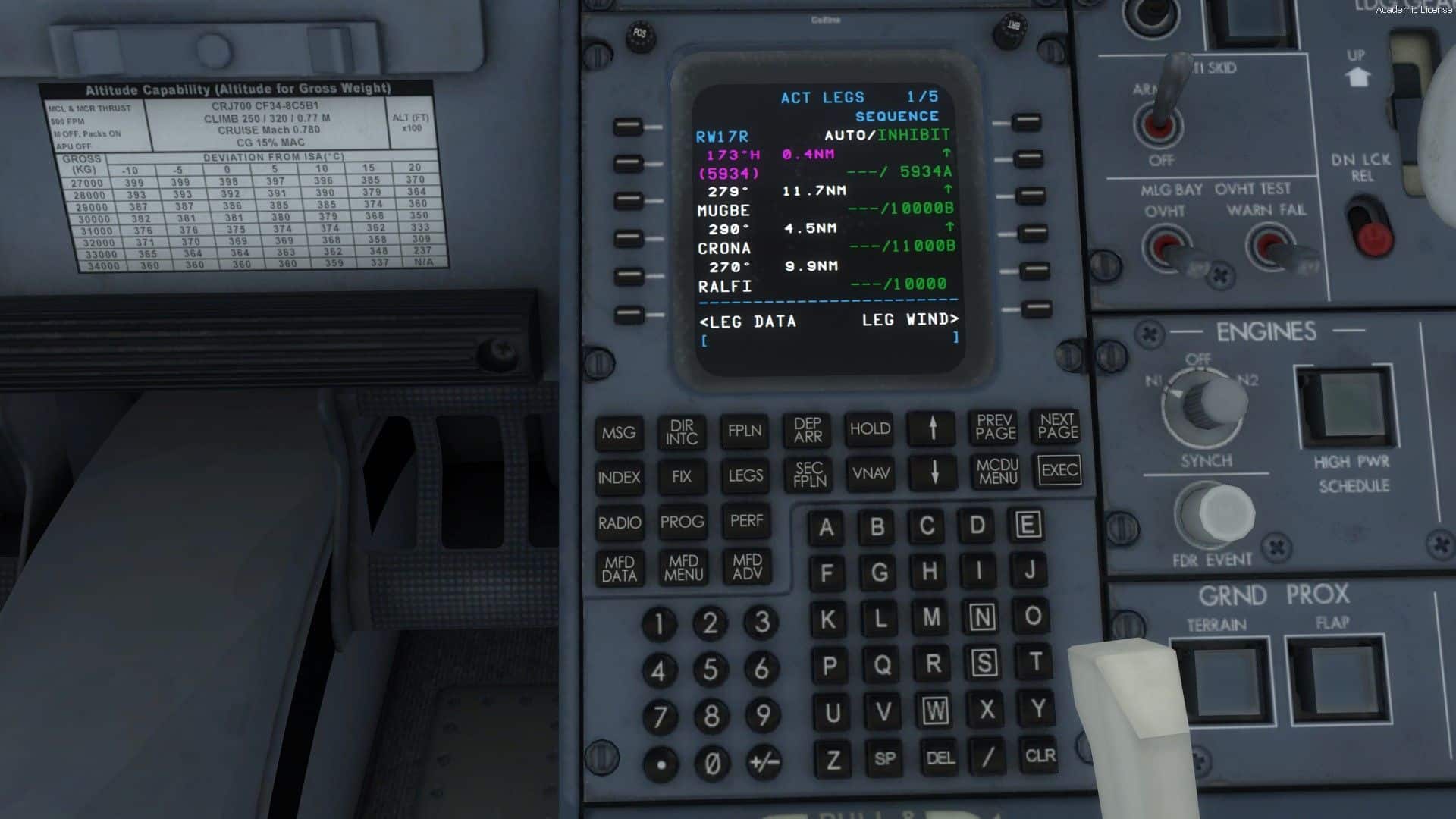 Während in Climb und Cruise alles sehr gut läuft und der CRJ problemlos den Vorgaben des Autopiloten folgt, finden sich im Sink- und Anflug noch einige kleine Macken. Zwar kalkuliert das FMC einen Top of Descent, jedoch ist das Abfliegen des Sinkprofils nicht ganz sauber. Oft gibt es Sprünge im angedachten Profil und der Autopilot hat Mühe sich den entstandenen Abweichungen anzupassen. Im PFD kann man das LNAV-Profil an einer weißen „Schneeflocke“ erkennen.