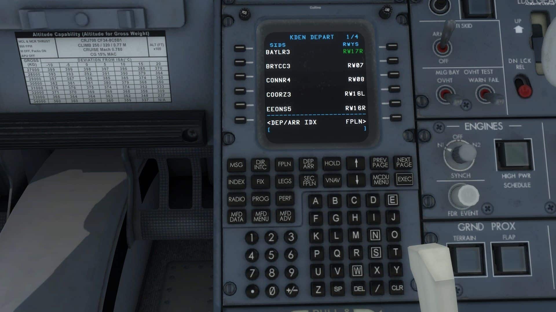 Nach dem Start wird der Schub bei sicherer Steiggeschwindigkeit auf Climb reduziert und der Autopilot, nach Angabe in der Aerosoft-Dokumentation, möglichst früh eingeschaltet. Im NAV-Modus folgt das Flugzeug der zuvor programmierten Route und steigt auf Reiseflughöhe. Was der CRJ nicht kann, ist bedingte Wegpunkte abfliegen. Dem Start aus Denvers Runway 17R auf der FOOT3 RNAV-Departure folgt beispielsweise eine Rechtskurve in Richtung MUGBE nach Erreichen von 5934ft. Im CRJ-FMC geht es von RWY17R per Direct nach MUGBE. Den entsprechenden Turn unter der angegebenen Bedingung muss man manuell (geht natürlich auch per Autopilot, HDG oder NAV mit Direct-Befehl) ausführen. Zudem berechnet das FMC des CRJ zwar automatisch ein vertikales Profil, das kann allerdings nicht automatisch abgeflogen werden. Bei Steig- und Sinkflug muss man also auf die Einhaltung von Höhen und Geschwindigkeiten achten. Ich hab das bei diesem Flug verpennt. Schande über mein Haupt.