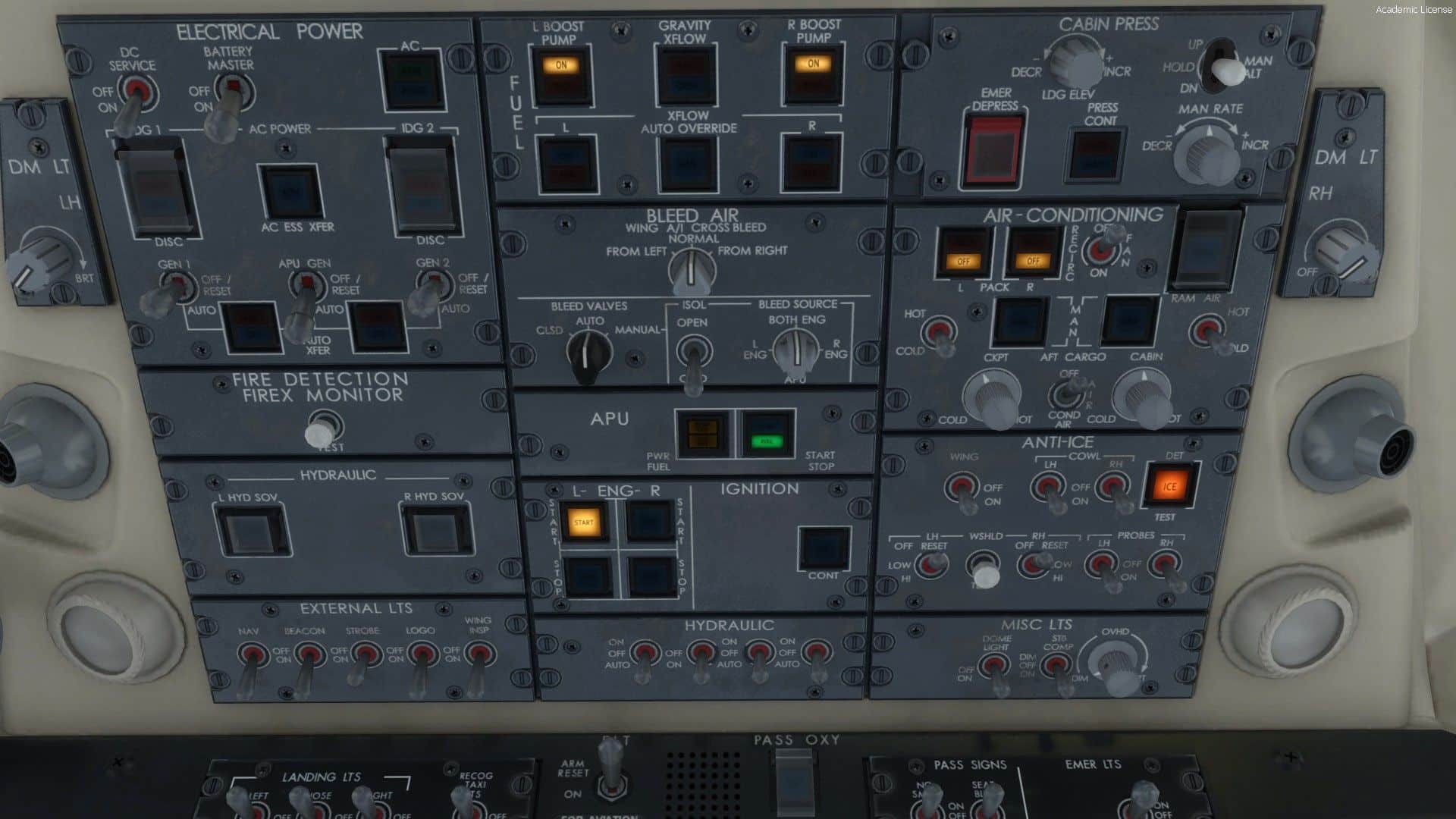Wichtige Systeme wie Hydraulics, Electrics, Packs, Bleed Air und Anti-Ice sind mit ihrer Logik weitestgehend simuliert und können im Overheadpanel bedient werden. Das EICAS bietet die Möglichkeit, alle Systeme zu prüfen und ihren Status abzurufen. Systemausfälle werden nicht simuliert. Aus diesem Grund kommt es zu logischen Fehlern bei den genannten Systemen, sobald man in eine „Abormal-Situation“ kommt. Als Beispiel sei das Abschalten der Packs im Reiseflug genannt. In diesem Fall bleibt der Kabinendruck in der Aerosoftumsetzung stabil und das Flugzeug gibt lediglich einen Hinweis über ausgeschaltete Packs aus.