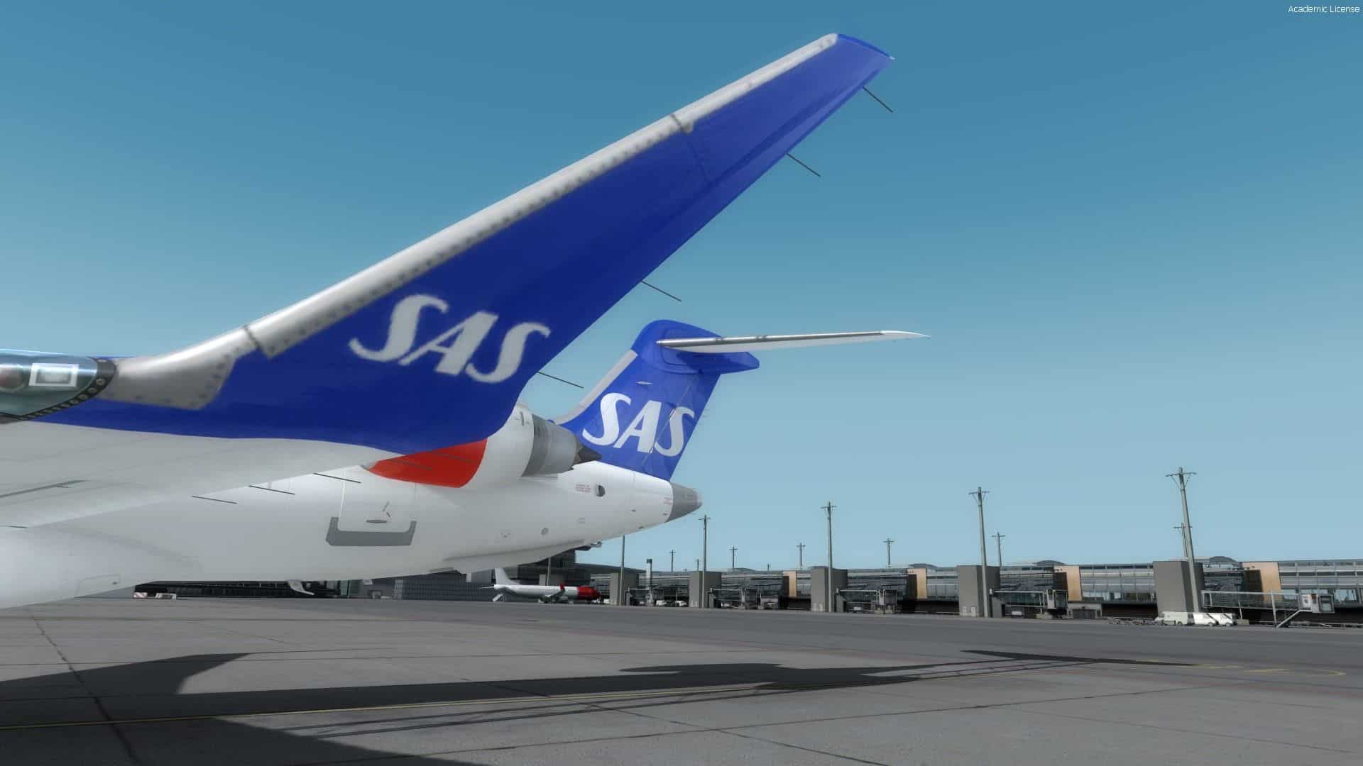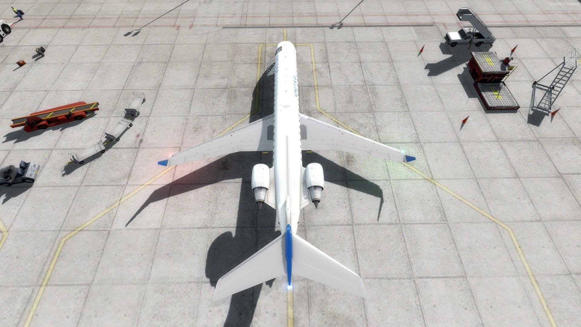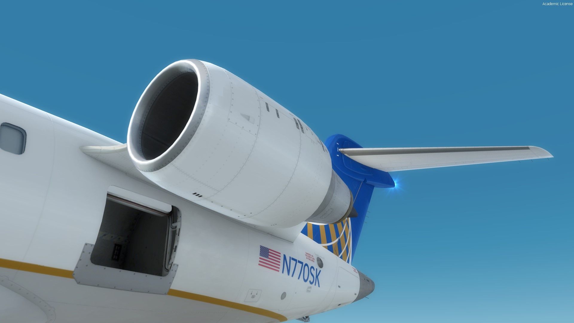 Beim ersten Blick auf das Modell fallen keine Unstimmigkeiten ins Auge. Das Flugzeug wirkt im Simulator wie das reale Vorbild. Die Proportionen stimmen, Formen, Winkel und Kanten sind passend. Viele Details wie Pitot-Rohre, Antennen und Scheibenwischer sind an der Außenhaut angebracht und Fahrwerk, Steuerflächen und Triebwerke sind mit vielen Einzelheiten modelliert worden. Der Eingang mit geöffneter Tür wirkt plastisch und auch die GPU (ein Standardelement aus dem Hause Aerosoft – man findet es z.B. am Airbus und auf den balearischen Inseln) ergänzt das Gesamtbild des Außenmodells qualitativ gut. Schade, dass die entsprechenden Klappen zu den Anschlüssen am Flugzeug nicht modelliert sind und die Kabel so einfach „in die Außenhaut“ laufen. Die Texturen des Repaints wirken an einigen Stellen (bei kleinen Schriftzügen oder dünnen Linien bzw. Punkten) etwas unscharf, sind aber im Grunde solide und machen einen guten Eindruck.