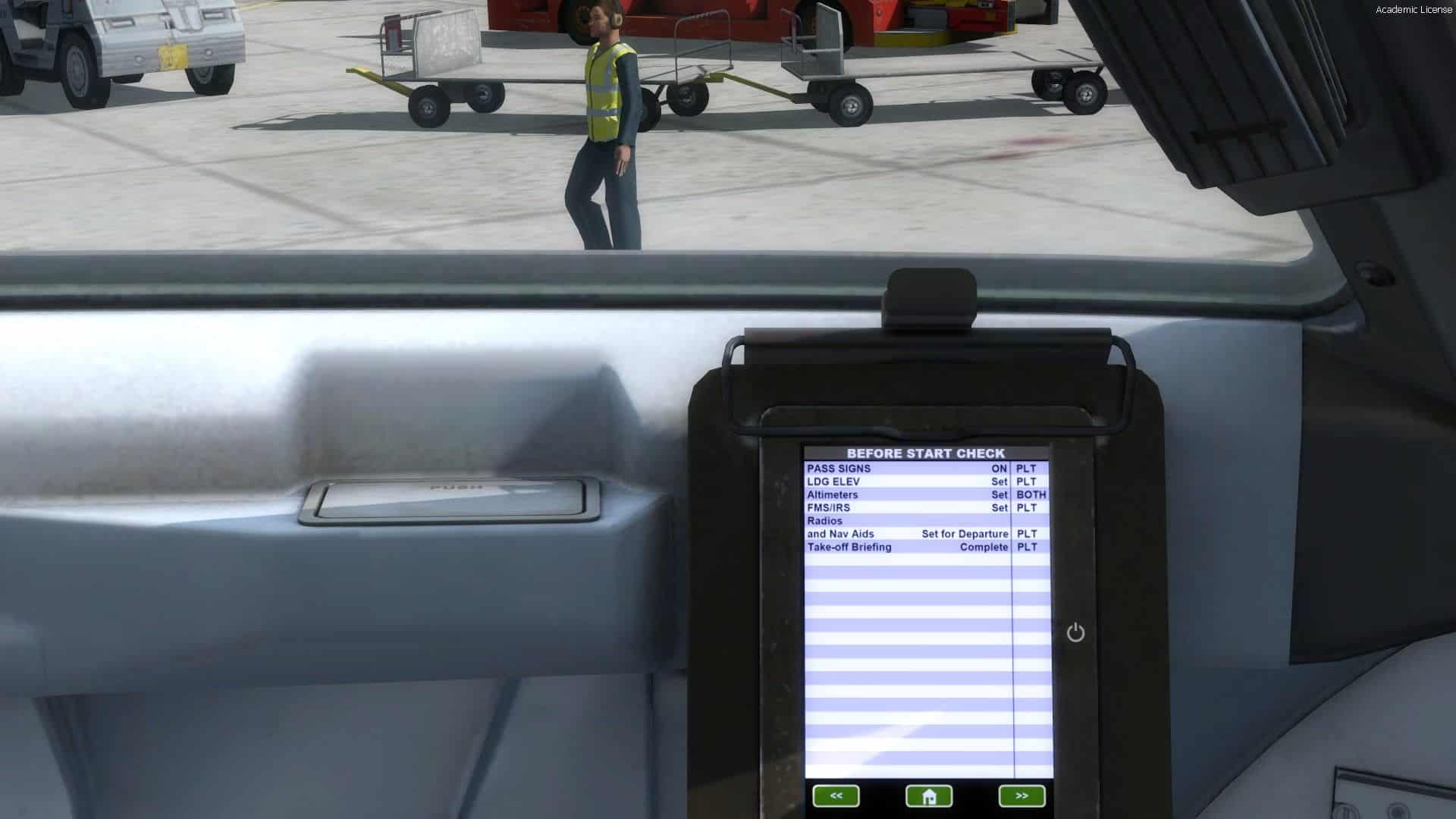 Zu Beginn des Fluges lässt sich der CRJ als Cold & Dark, Ready to Taxi und Ready to Fly, sowie, seit Version 1.0.0.5, als „Turnaround“ konfigurieren. Aerosoft liefert in der Dokumentation ausführliche Checklisten, so dass die Maschine mit ein paar Handgriffen recht schnell aus dem Cold & Dark geweckt werden kann. Aus dem Turnaround-Status ist man noch schneller, so kann man in circa 10 Minuten abflugbereit sein. Ideal also für einen Feierabendflug.