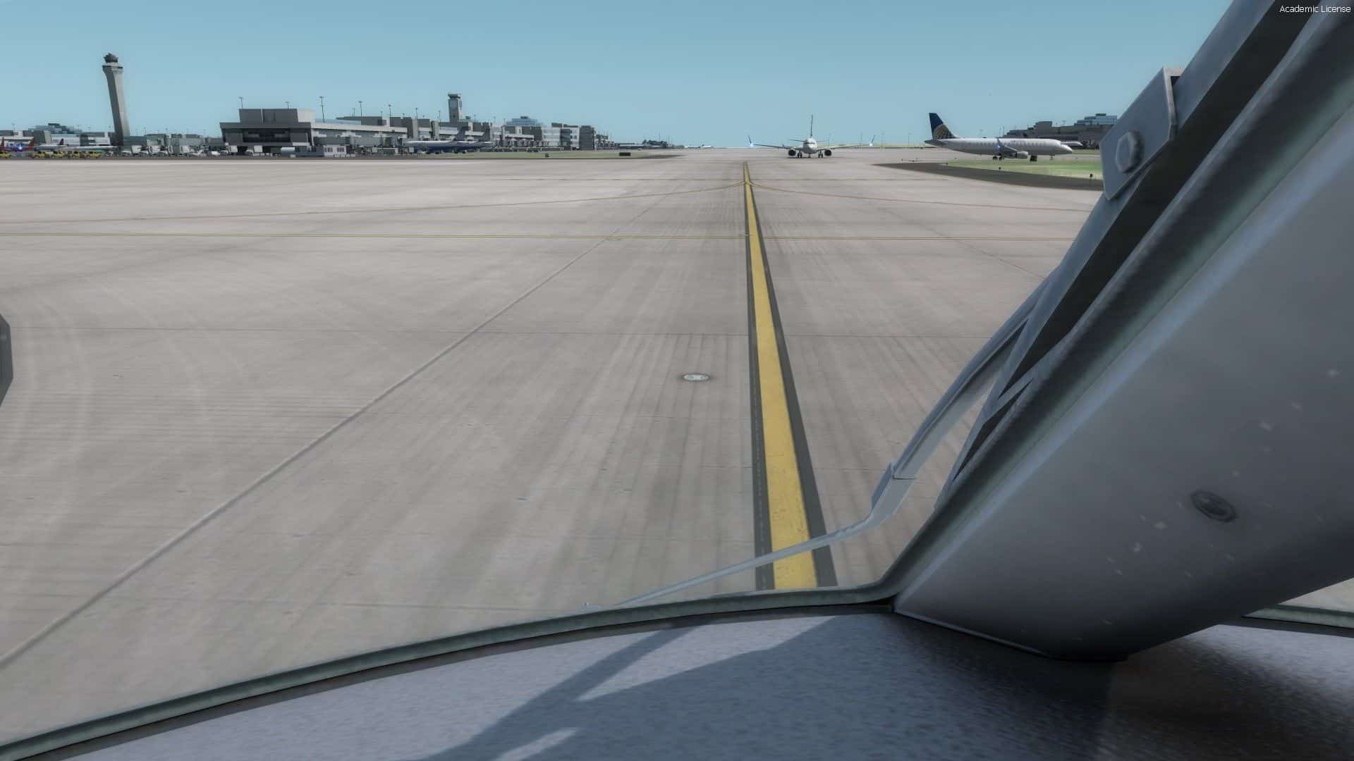 Nach dem Starten der Triebwerke geht es zur nahen Bahn 08. Der CRJ benötigt ein gewisses Maß an Schub um sich in Bewegung zu setzen, lässt sich dann aber mit kleinen Steuereingaben gut manövrieren. Wichtig: Bugradsteuerung aktivieren, sonst wird spätestens der erste 90°-Turn zu einer überraschenden Herausforderung.