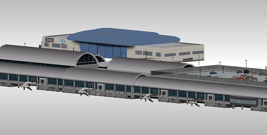 John Wayne Orange County (KSNA). Die 3D Objekte sind bereits fertig umgesetzt und auf PBR Texturen umgestellt worden. Es muss der ganze Boden, mit seinen Objekten, Fototexturen und natürlich Taxiways, Serviceways und so weiter definiert werden.