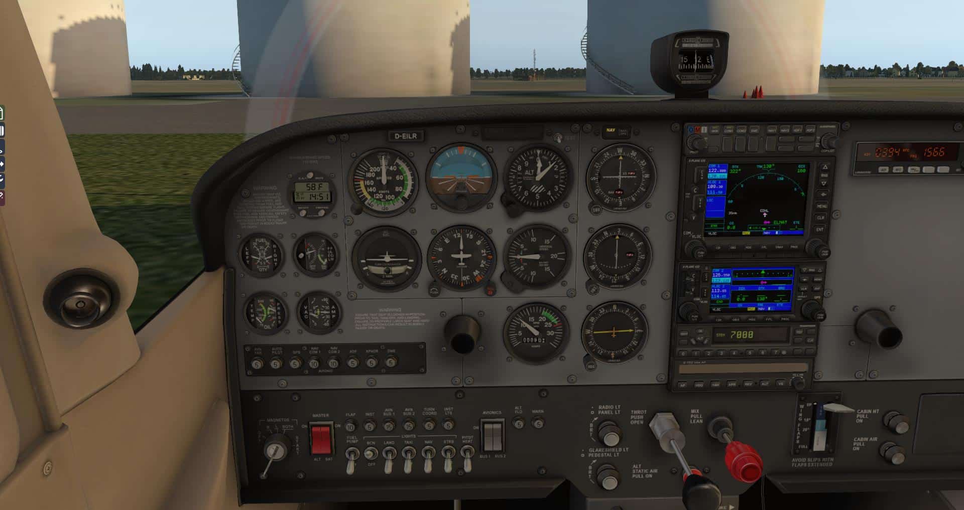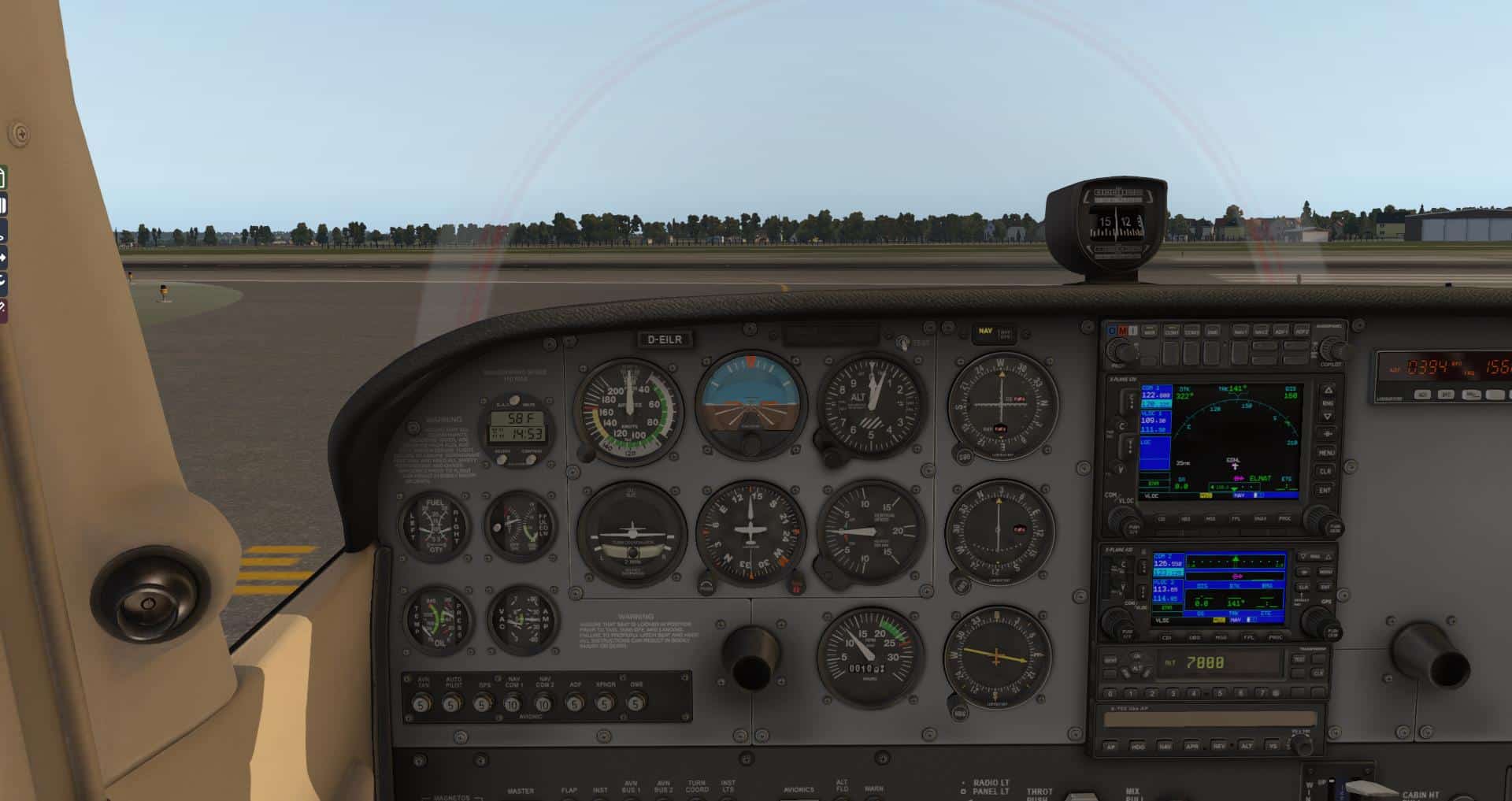 Beim Starten des Motors können wir den Starter sehr eindrucksvoll hören, das kann die X-Plane-11-C172 ohne REP so zumindest nicht. Den Avionics wurde akustisch auch ein wenig Leben eingehaucht, sodass wir uns hier nicht wie in einer sterilen Umgebung vorkommen. Beim Rollen auf dem Boden fällt auf, dass die Abrollgeräusche angefasst wurden und man die Bremsen – wie bei anderen REP-Projekten auch – quietschen hören kann. Abhängig von der Bremsintensität, versteht sich. Der Motorensound selbst wirkt ebenfalls überzeugend, er drängt sich nicht auf, ist aber deutlich wahrnehmbar und klingt realistisch. Gerade wenn es windig ist, zeigen sich sehr schnell die implementierten Windgeräusche. Es macht großen Spaß bei böigem Seitenwind anzufliegen und bei jeder Böe nicht nur das Flugzeug versetzen zu sehen, sondern auch das aurale Feedback dazuzubekommen.