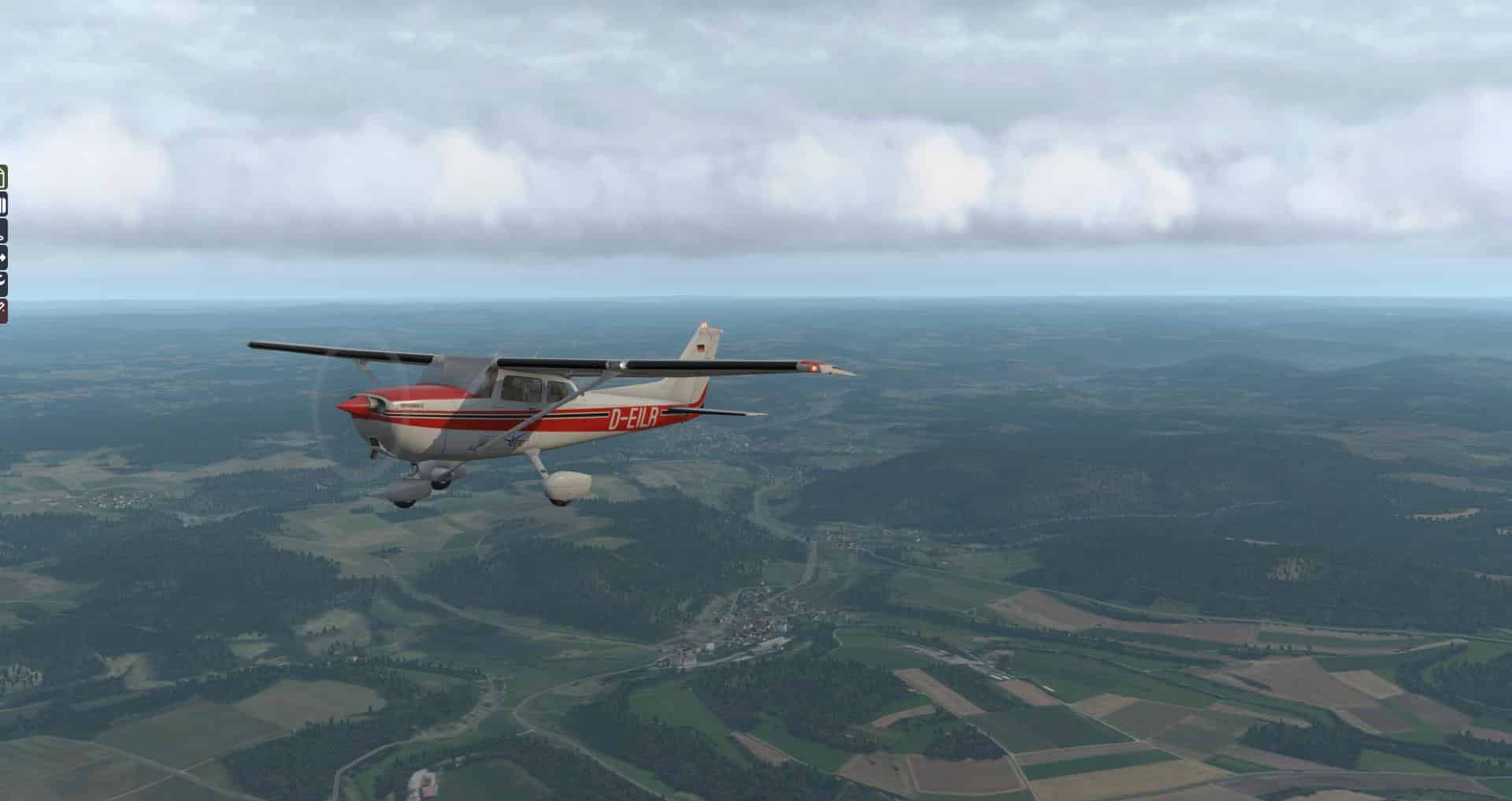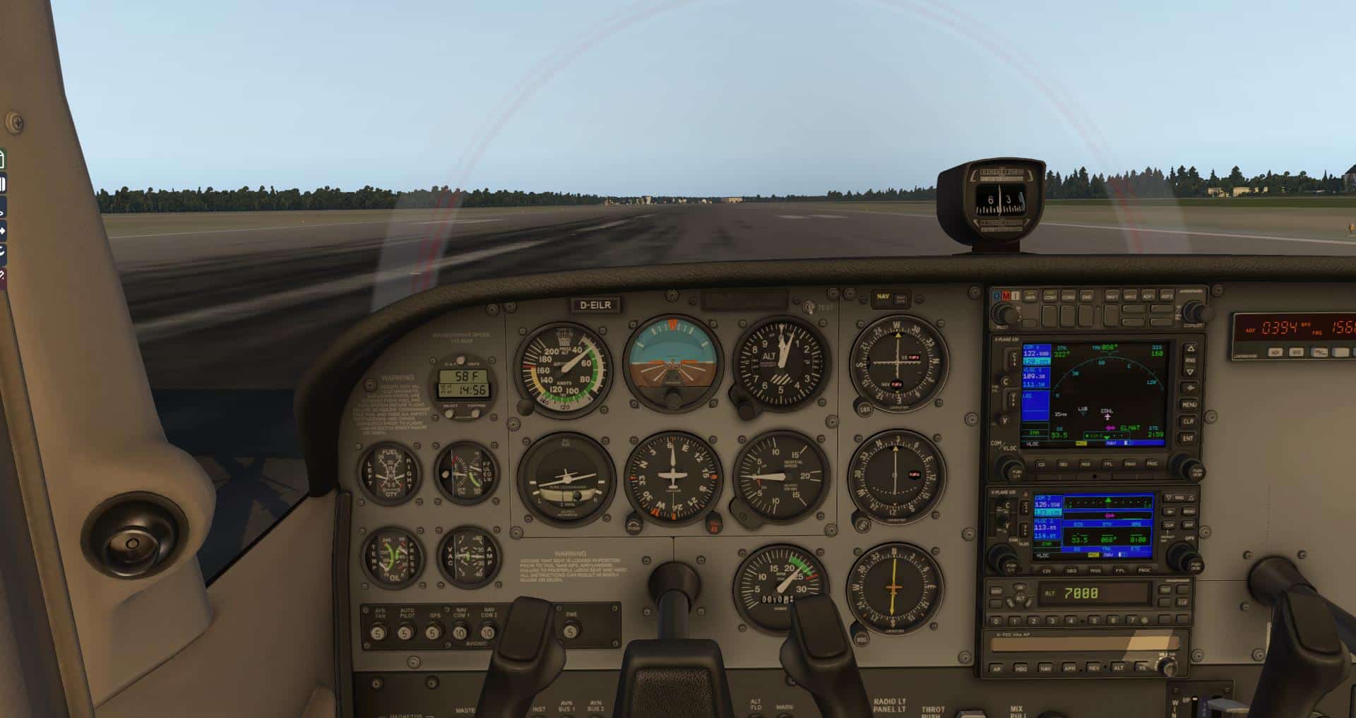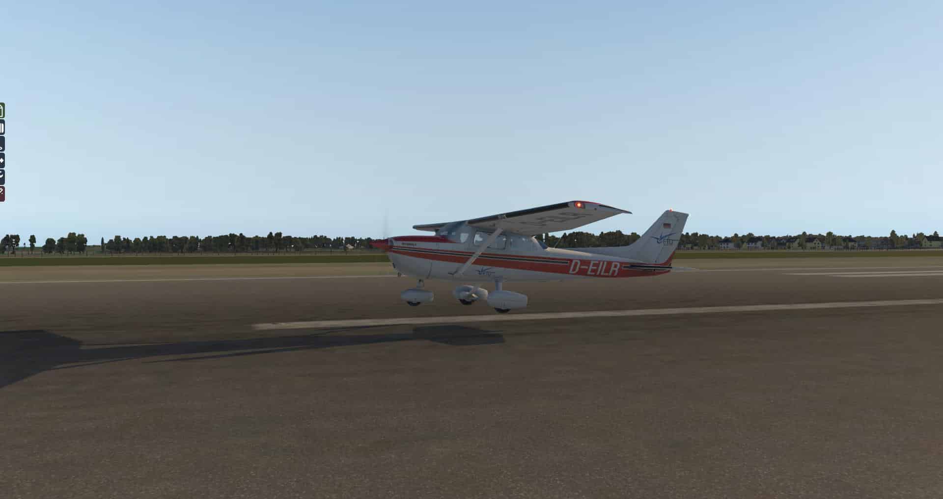 Der Start verläuft entspannt, etwas anderes ist vom Schulflugzeug schlechthin aber auch nicht zu erwarten. Bei Seitenwind hat man aus dem Stand weg natürlich ordentlich zu tun, da der vertikale Stabilisator ein gutes Segel darstellt und sich das Bugrad nach X-Plane-Manier nicht allzu sehr mit dem Asphalt verzahnt. Davon abgesehen aber alles nicht der Rede wert, wir ziehen leicht am Steuerhorn und beobachten, wie sich die Cessna sanft von der Piste hebt und den Eingaben des Piloten lauscht.