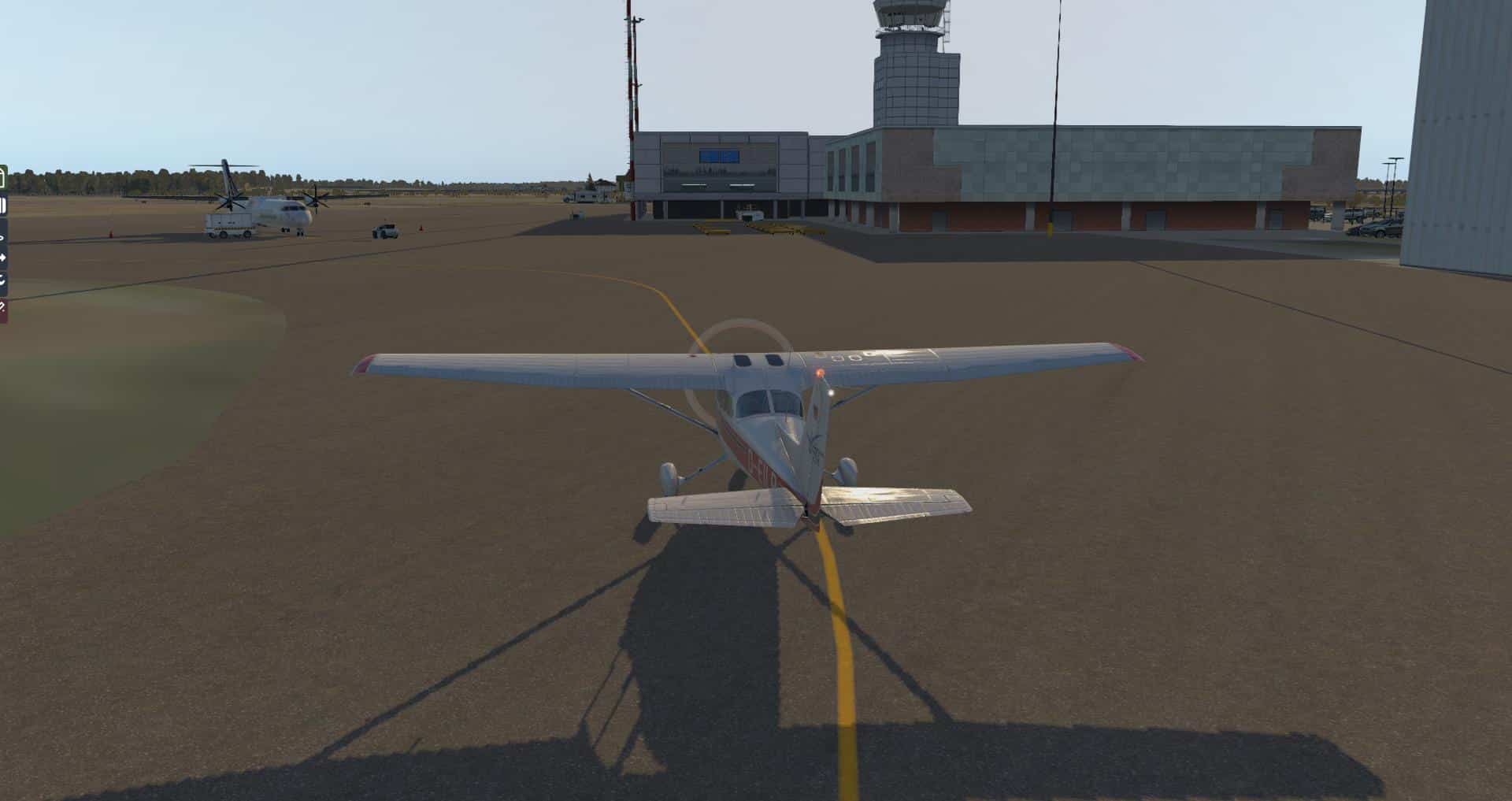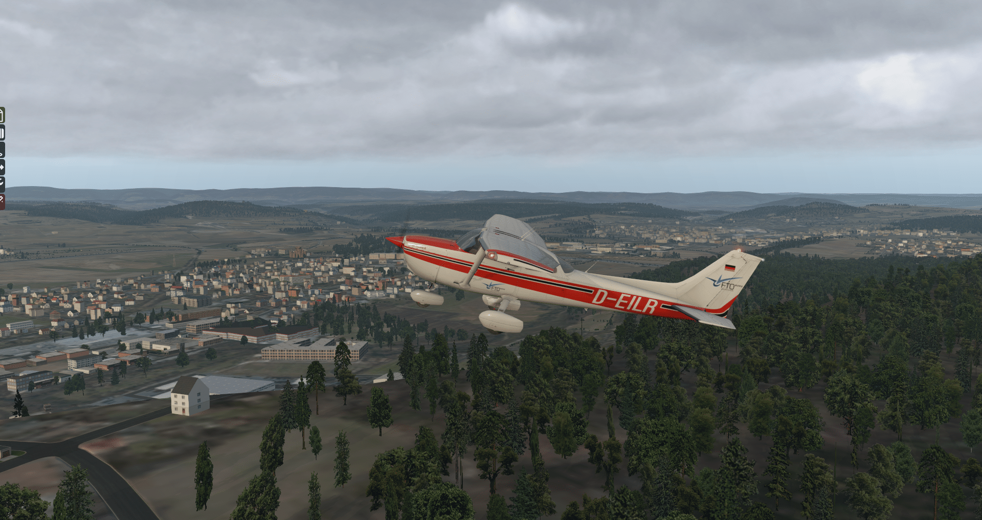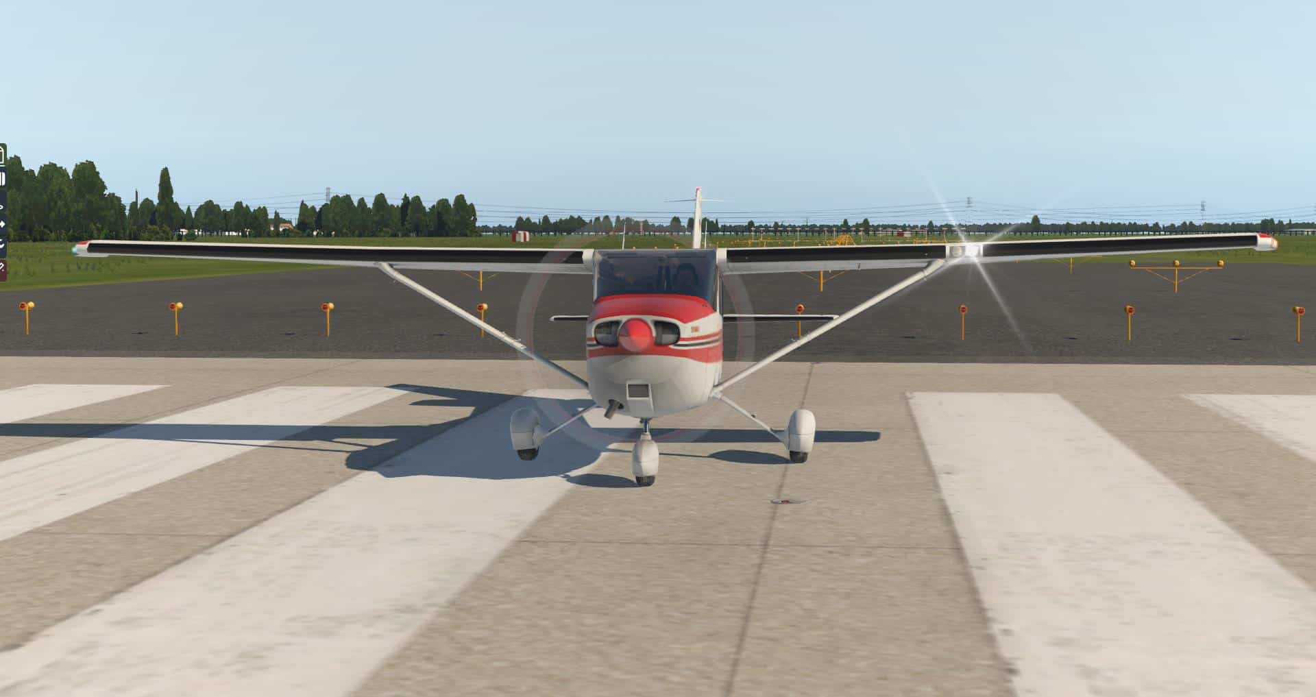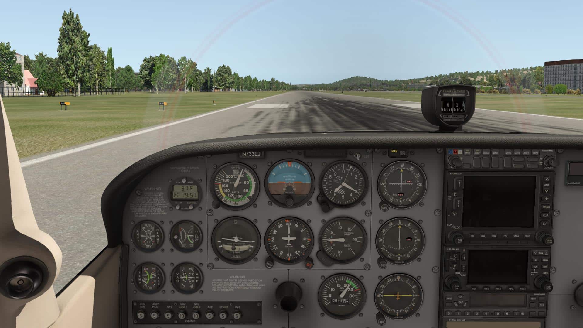 Der Start verläuft entspannt, etwas anderes ist vom Schulflugzeug schlechthin aber auch nicht zu erwarten. Bei Seitenwind hat man aus dem Stand weg natürlich ordentlich zu tun, da der vertikale Stabilisator ein gutes Segel darstellt und sich das Bugrad nach X-Plane-Manier nicht allzu sehr mit dem Asphalt verzahnt. Davon abgesehen aber alles nicht der Rede wert, wir ziehen leicht am Steuerhorn und beobachten, wie sich die Cessna sanft von der Piste hebt und den Eingaben des Piloten lauscht.