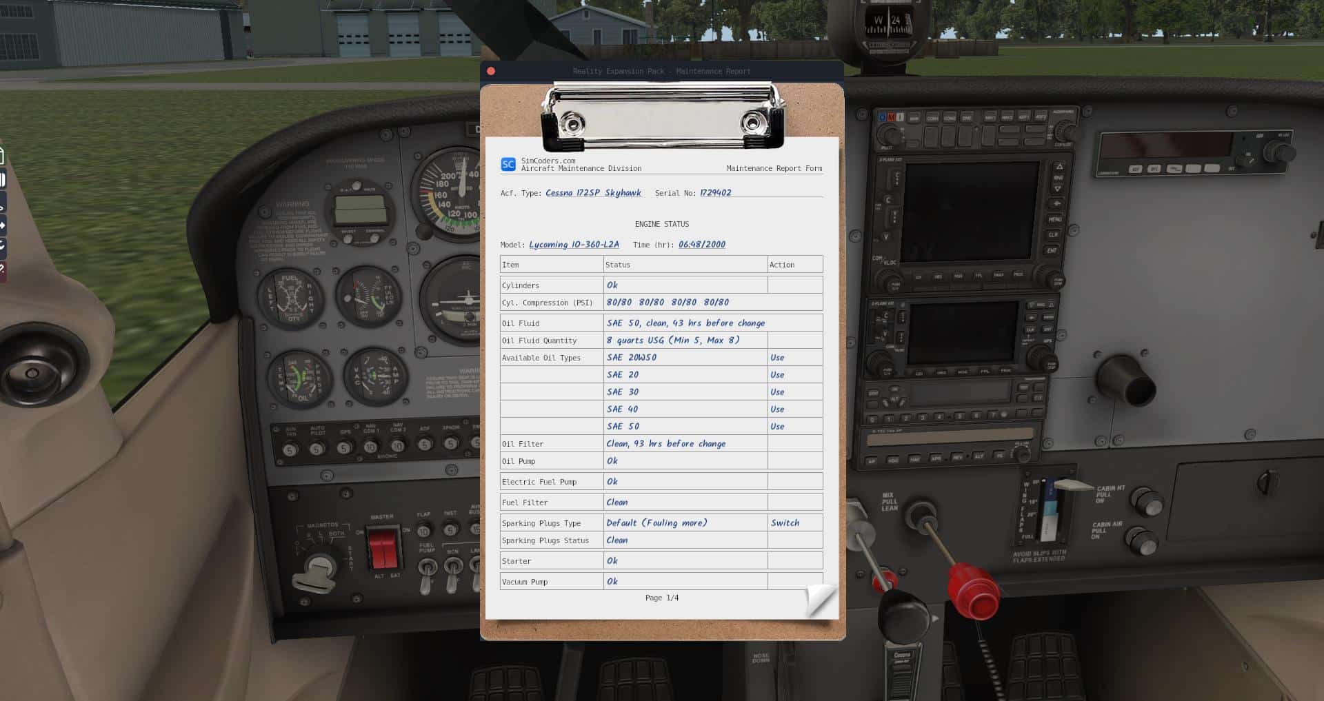 Aber genug der Moralpredigt, man darf ja auch einfach mal Dinge ausprobieren, dafür ist der Sim schließlich da. Also weiter im Text, was bringt das Reality Expansion Pack für die Laminar Research Cessna 172 Skyhawk sonst noch mit? Die Wahl aus verschiedenen Ölen beispielsweise. Je nach Klima möchte man unter Umständen in der Viskosität variieren. Ebenfalls hat man die Möglichkeit feinere, dafür empfindlichere Zündkerzen zu verbauen, was den Vorteil mit sich bringt, dass diese nicht so schnell verrußen. Das passiert gern beim Rollen am Boden, wenn zu geringe Drehzahlen bei zu fettem Gemisch gefahren werden.