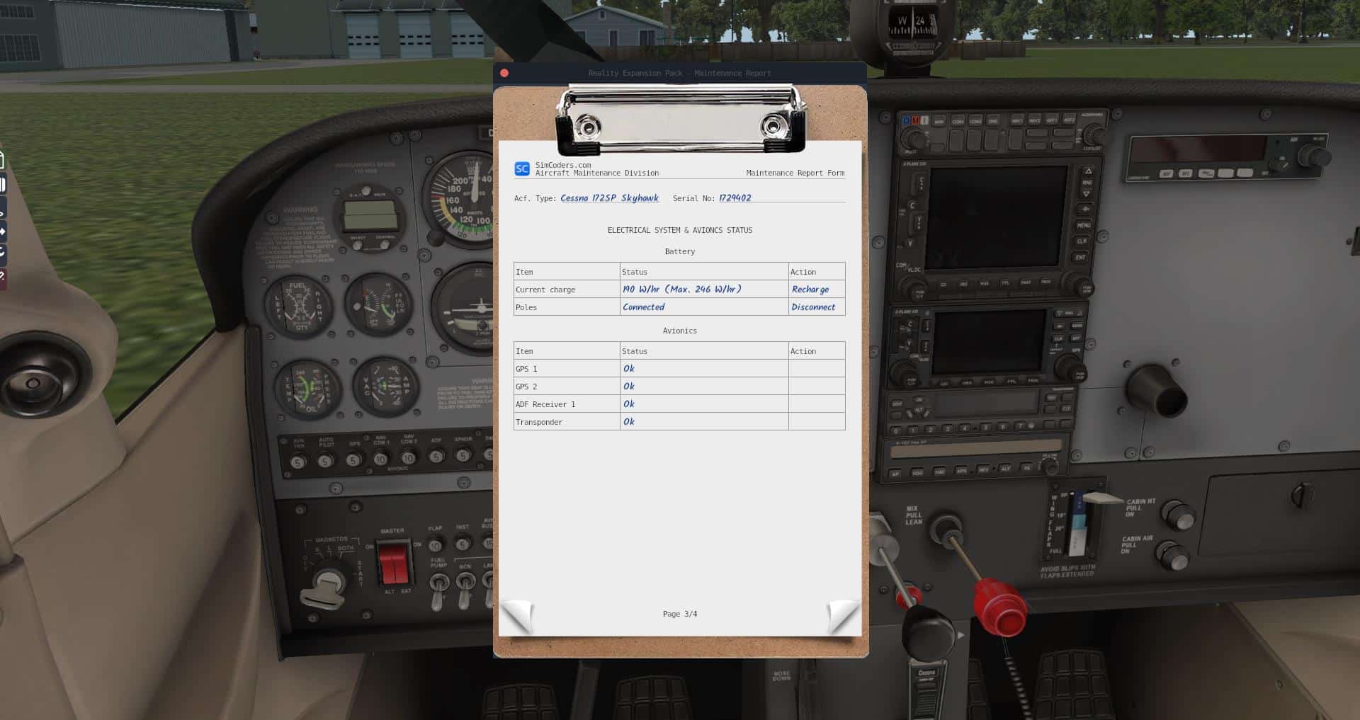 Wir sehen also – wer mit SimCoders Reality Expansion Packs bekannt ist, weiß das – was wir mit dem Flugzeug anstellen, hat einen direkten oder indirekten Einfluss auf das Flugzeug. Auch über Flüge hinweg. Das simpelste Beispiel – weil es gern mal passiert und man es recht einfach merkt – ist, wenn man den Batterieschalter aktiviert lässt und den Simulator schließt. Beim nächsten Laden des Flugzeugs errechnet das Plugin, wie viel Zeit vergangen ist und wie der Ladestand der Batterie zu sein hat. Wer seinen Simulator also erst in der nächsten Woche wieder startet wird das Flugzeug mit einem ebenso aktivierten Batterieschalter aber ohne Strom laden. Alles keine wilde Sache, das Maintenance-Menü zur linken des Bildschirms bietet ja die Möglichkeiten alle Schäden wieder zu richten, aber es ist trotzdem eine feine Sache, weil man so erzogen wird. Wenn man denn möchte. Die Schäden können selbstverständlich abgestellt werden, wobei das zumindest für mich keine Option wäre. Ich vermute, das ginge den meisten Kaufinteressenten so.