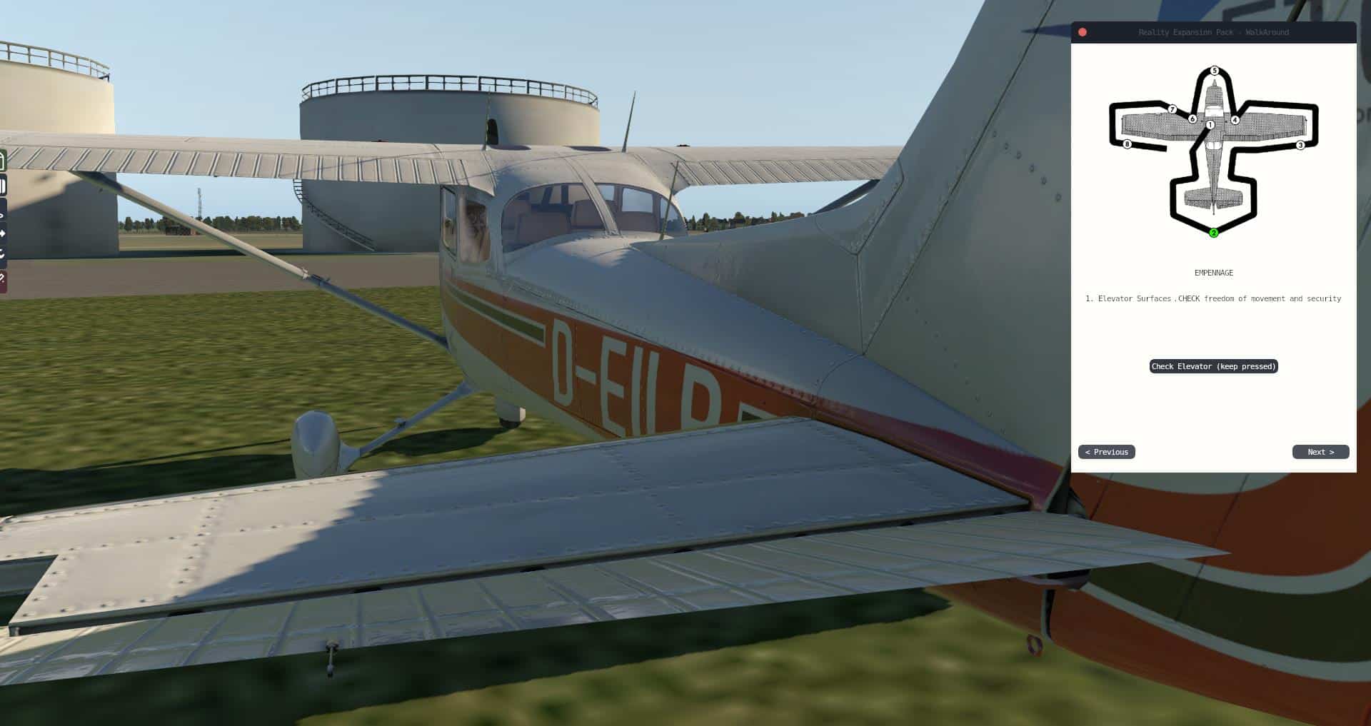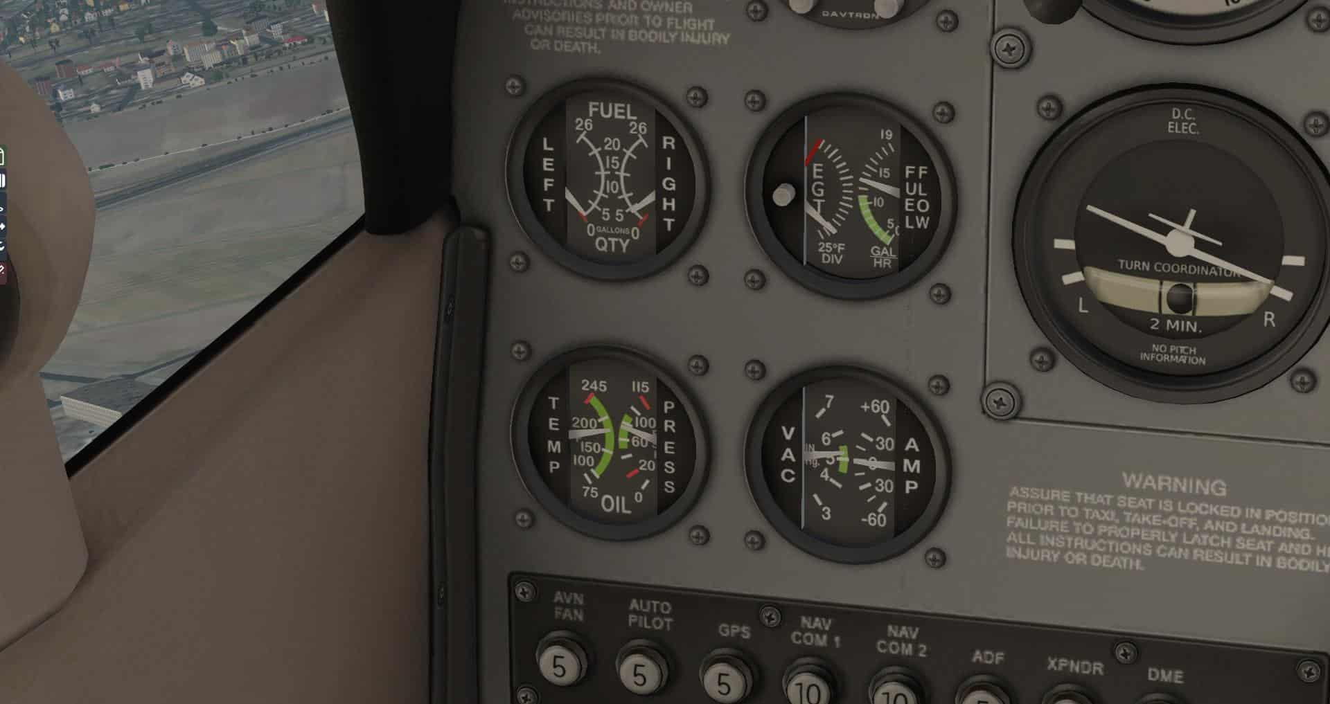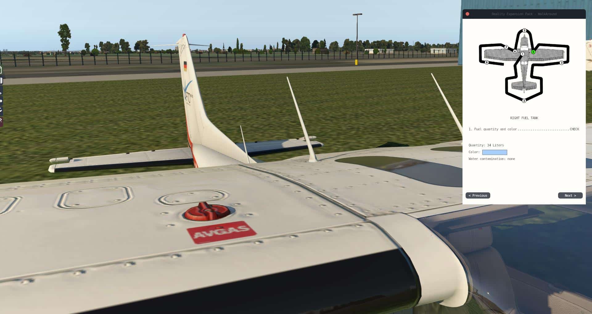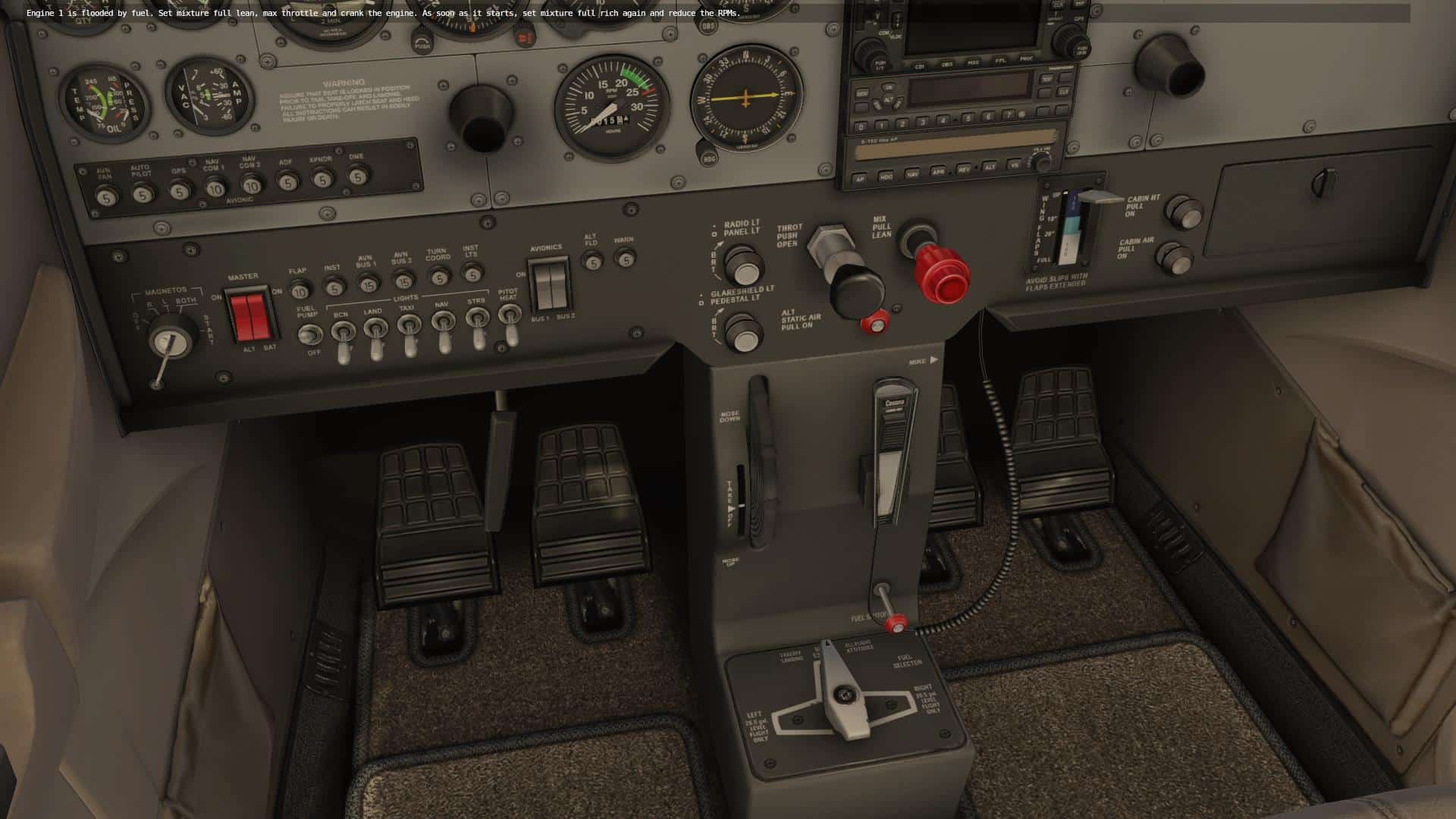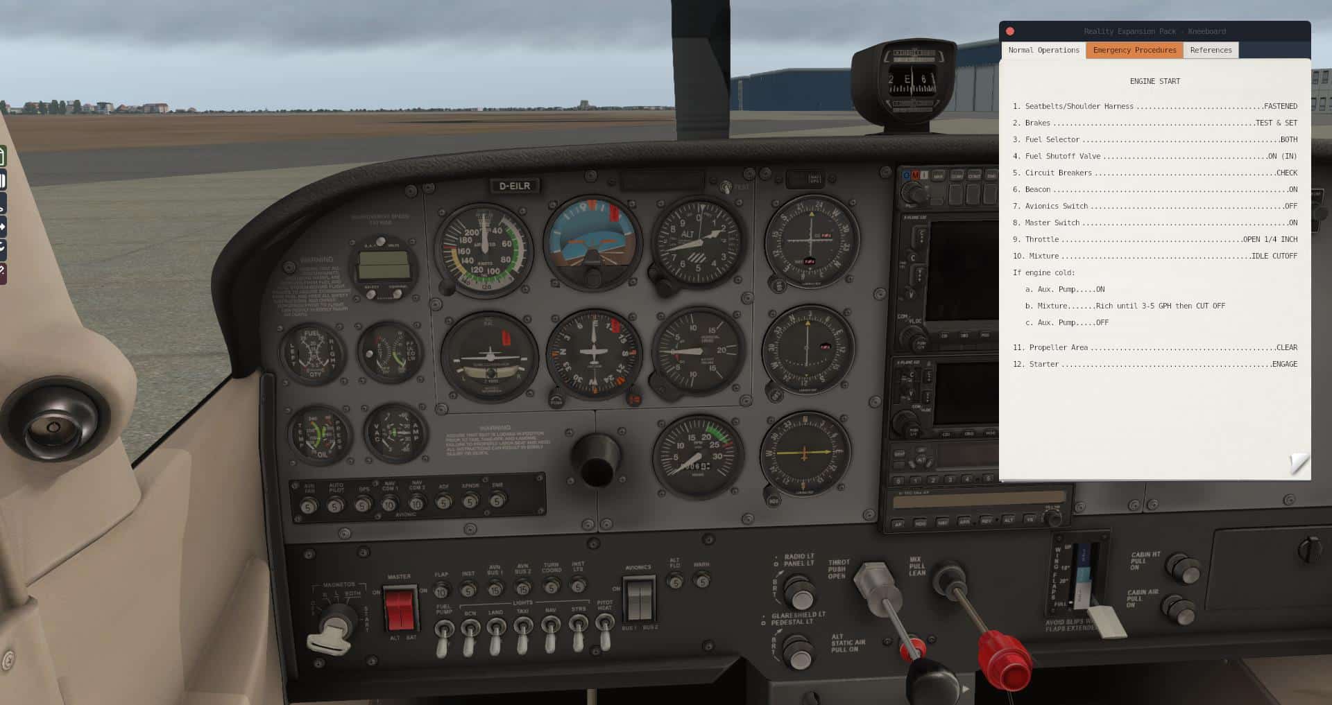 Nun also wieder zurück in die Kanzel, um den Motor zu starten. Jeder, der sich für das Reality Expansion Pack interessiert, der wird wissen, dass man gut daran tut, sich an die Checklisten und Reference Sheets zu halten, wenn man daran interessiert ist, nicht unbedingt bei jedem Flug irgendetwas reparieren oder in Ordnung bringen zu müssen. Was kann man zum Beispiel direkt beim Engine Start verkehrt machen? Beim Primen des Motors vor der Zündung ein wenig zu sehr motiviert zu sein und zuviel Avgas einzuspritzen, sodass die Zylinder geflutet werden und nicht gezündet werden kann. Die Lösung dieses Problems – wenn es denn mal soweit kommt – ist Nutzern der vorigen REP-Modelle geläufig. Der Gashebel wird voll hinein geschoben, das Gemisch maximal abgemagert und dann gezündet bis der Motor anläuft. Sobald dies passiert wird das Gemisch angereichert und Gas weggenommen. Die Avionics sollte man während des Startvorgangs ebenfalls tunlichst abgeschaltet lassen, da selbige ansonsten durch Spannungsspitzen beschädigt werden können. Aber mal wieder ein bisschen zurück an die Oberfläche.