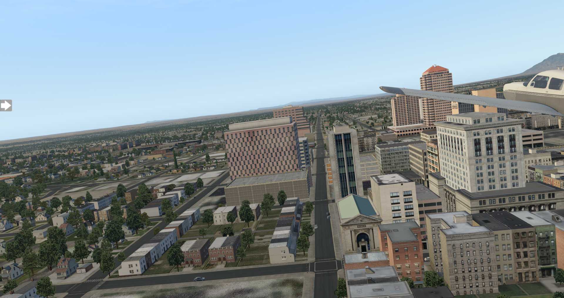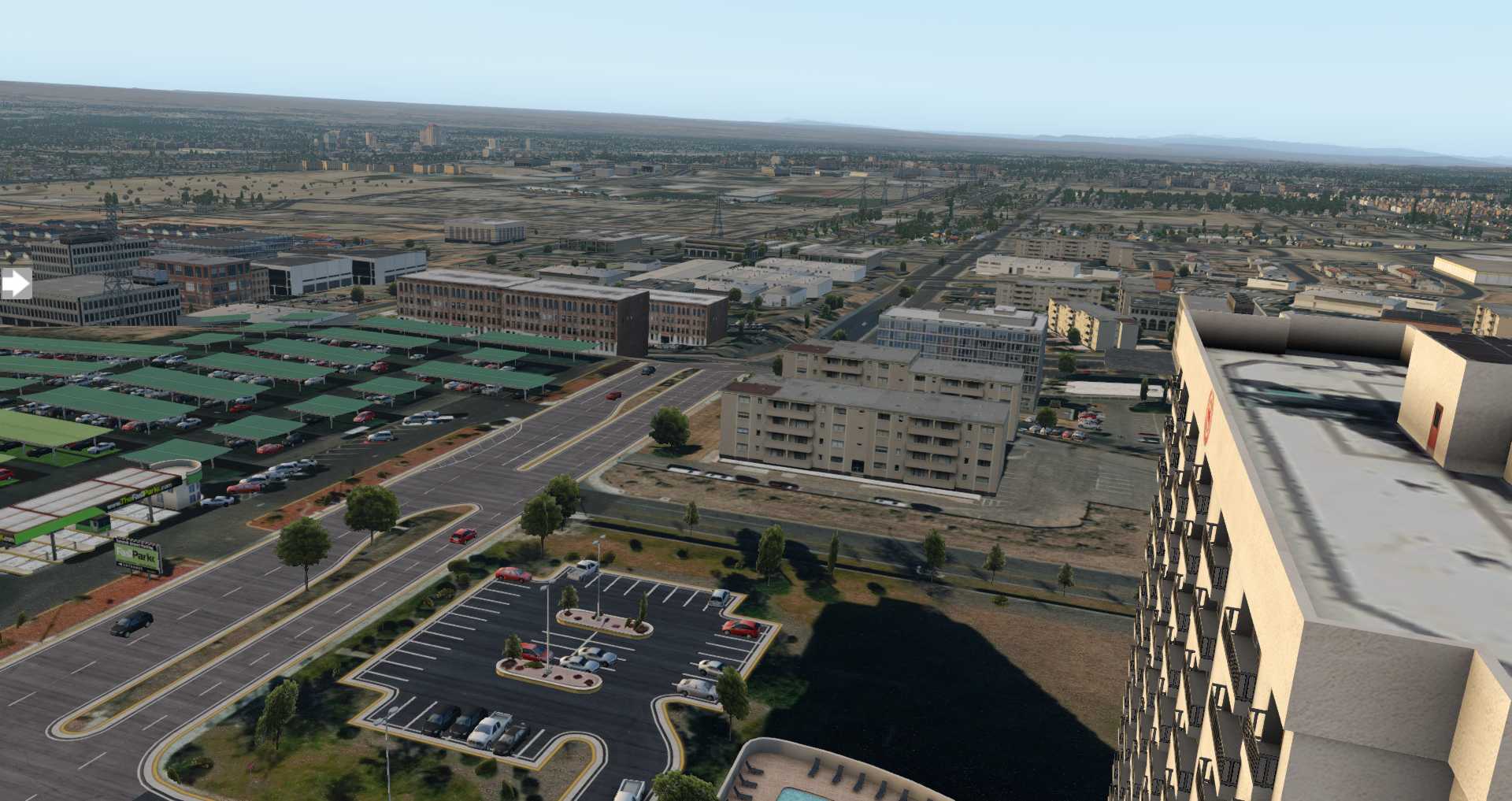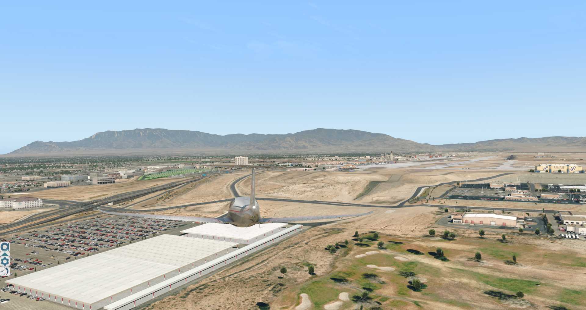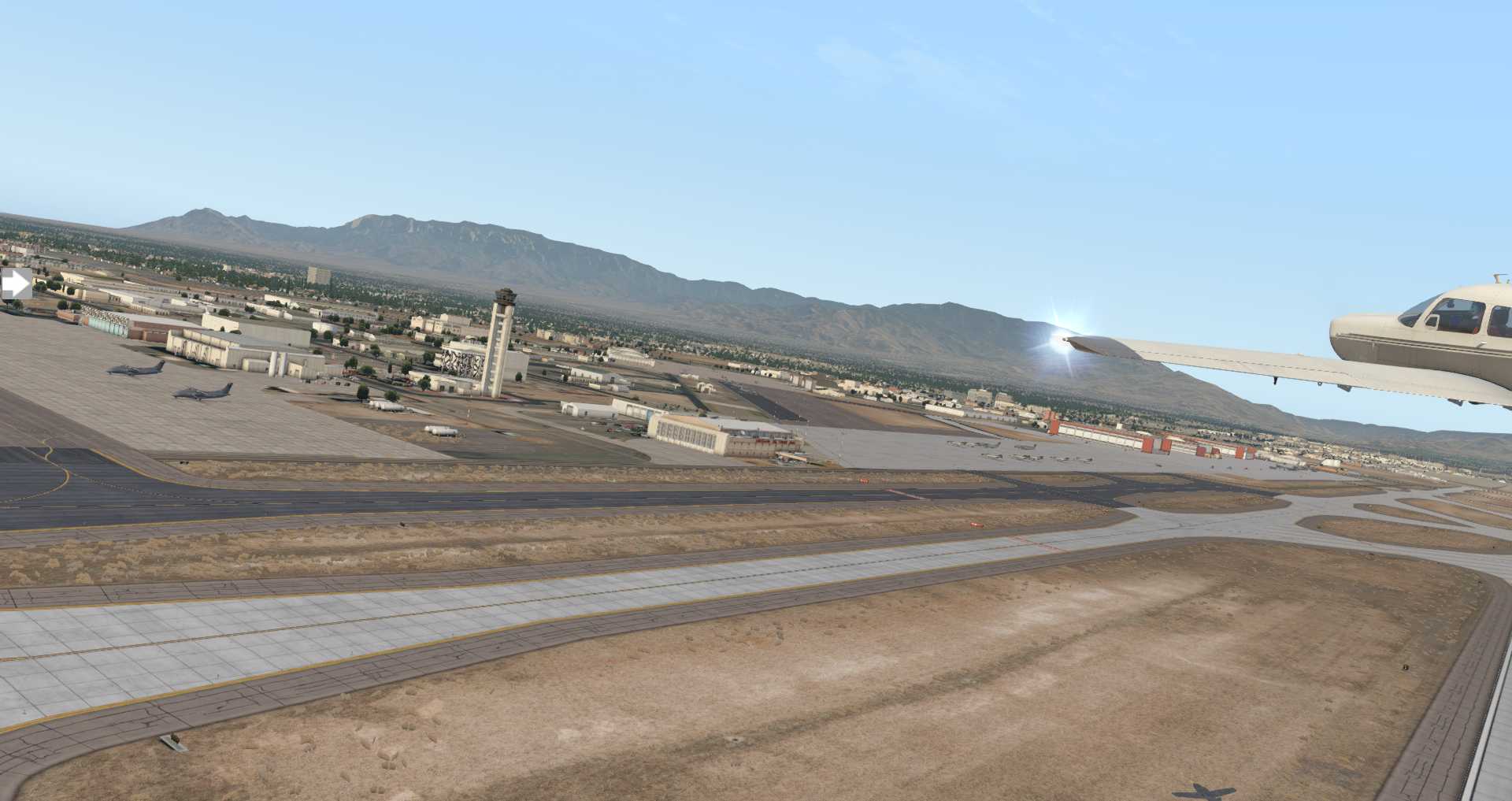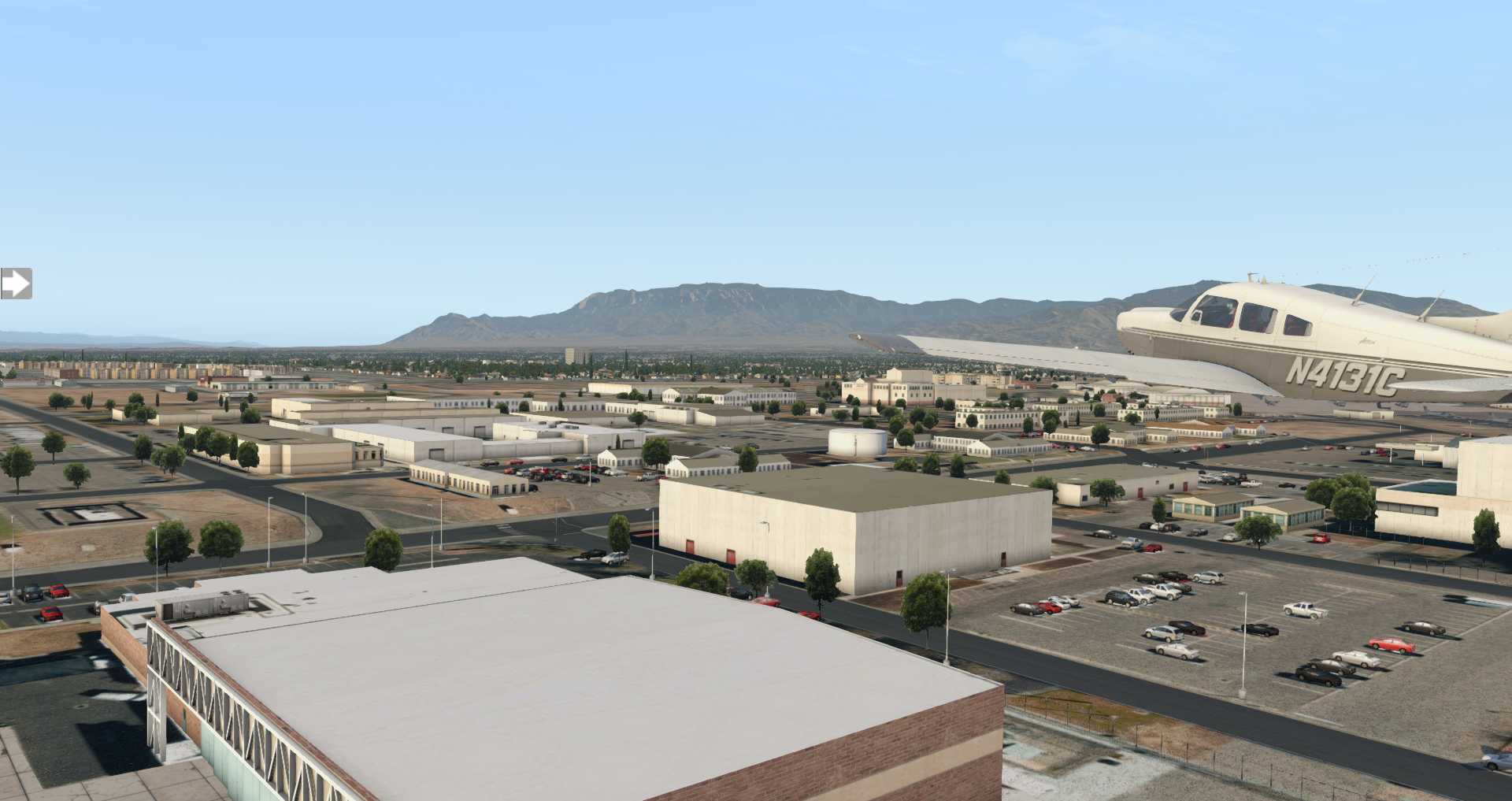 Die Szenerie sieht in weiten Bereichen ausgesprochen real aus. Erst nach dem Überfliegen des militärischen Bereich des Flughafens sehen wir, dass natürlich auch ein Meister tricksen muss. Erhebliche Teil der Stadt bestehen aus dem aktualisierten AutoGen von X-Plane 11.10. Erst wenn wir zurück zum Flughafen fliegen und das Sheraton Hotel passieren bemerken wir die komplexen Zufahrtsstraßen, die unseren Blick in die Ferne leiten. Von der Anhöhe herunter, auf welcher der Flughafen gebaut wurde. Hinunter ins Tal, nach Albuquerque selbst.