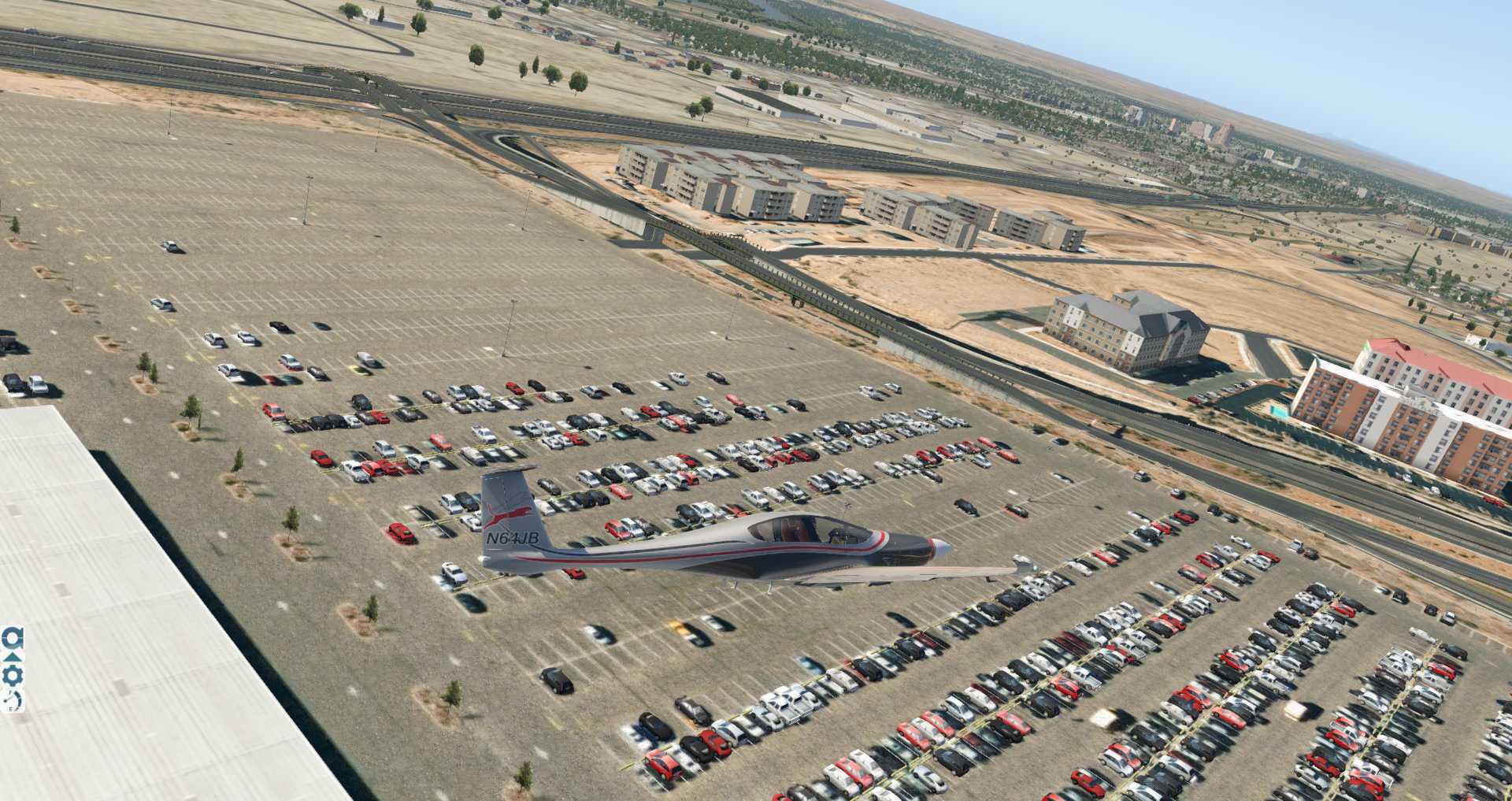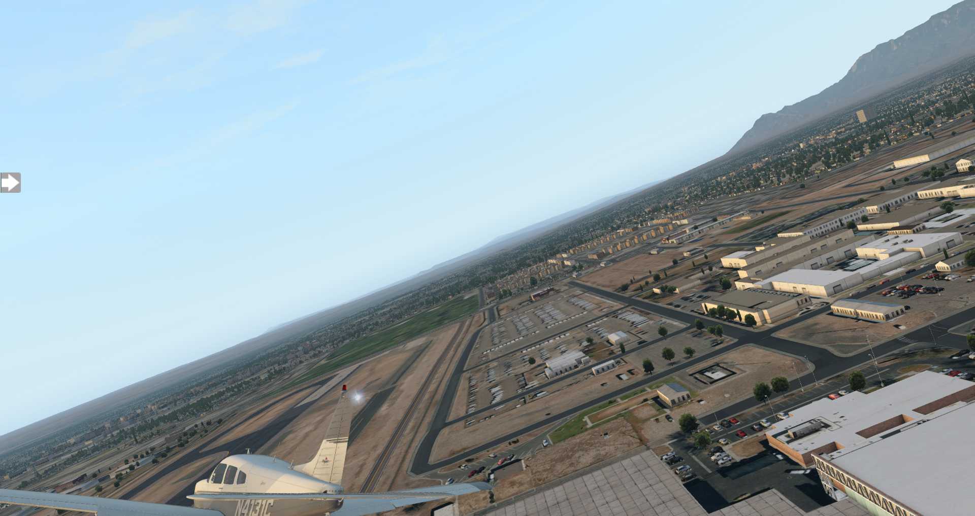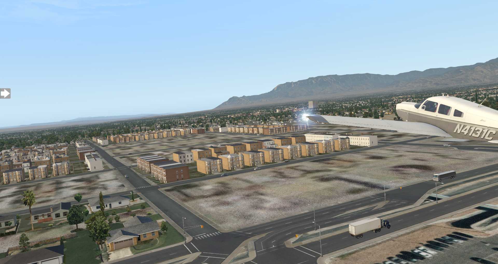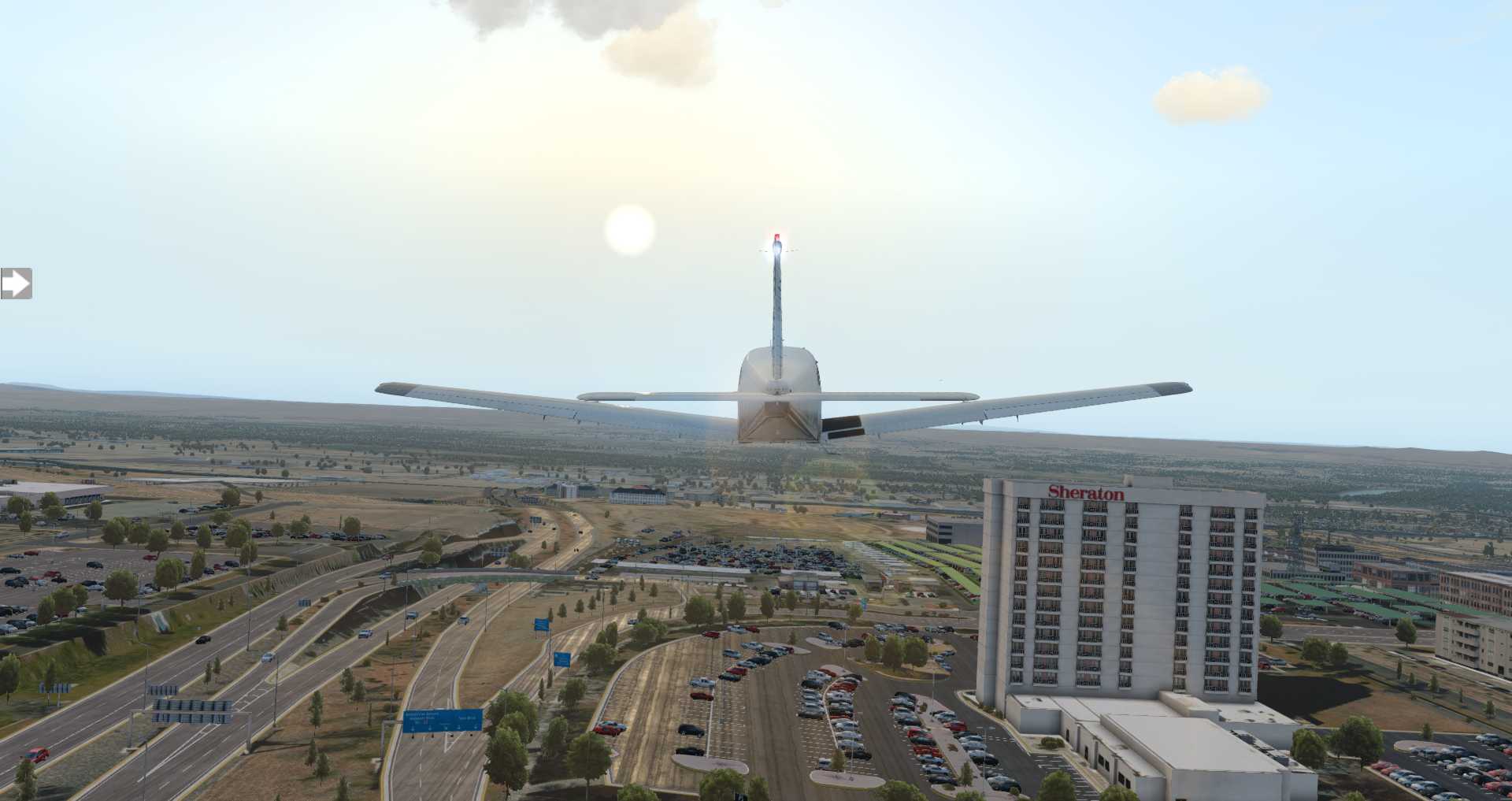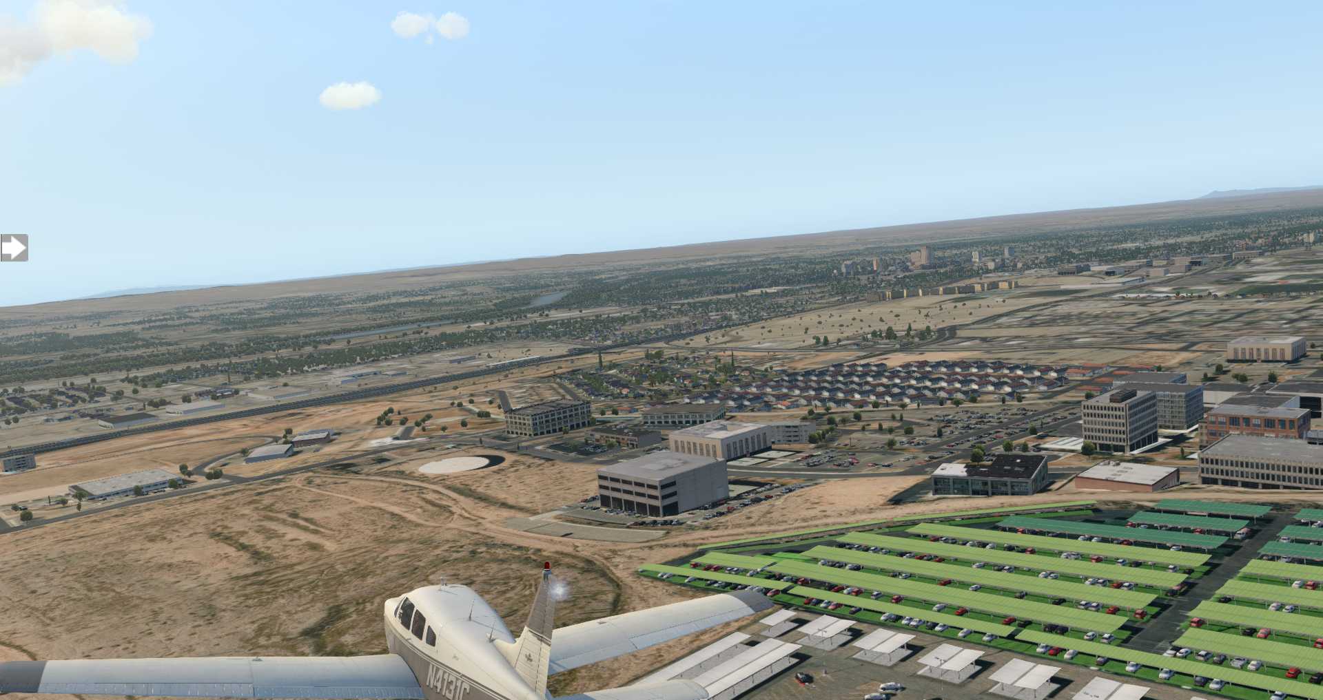 Die Szenerie sieht in weiten Bereichen ausgesprochen real aus. Erst nach dem Überfliegen des militärischen Bereich des Flughafens sehen wir, dass natürlich auch ein Meister tricksen muss. Erhebliche Teil der Stadt bestehen aus dem aktualisierten AutoGen von X-Plane 11.10. Erst wenn wir zurück zum Flughafen fliegen und das Sheraton Hotel passieren bemerken wir die komplexen Zufahrtsstraßen, die unseren Blick in die Ferne leiten. Von der Anhöhe herunter, auf welcher der Flughafen gebaut wurde. Hinunter ins Tal, nach Albuquerque selbst.