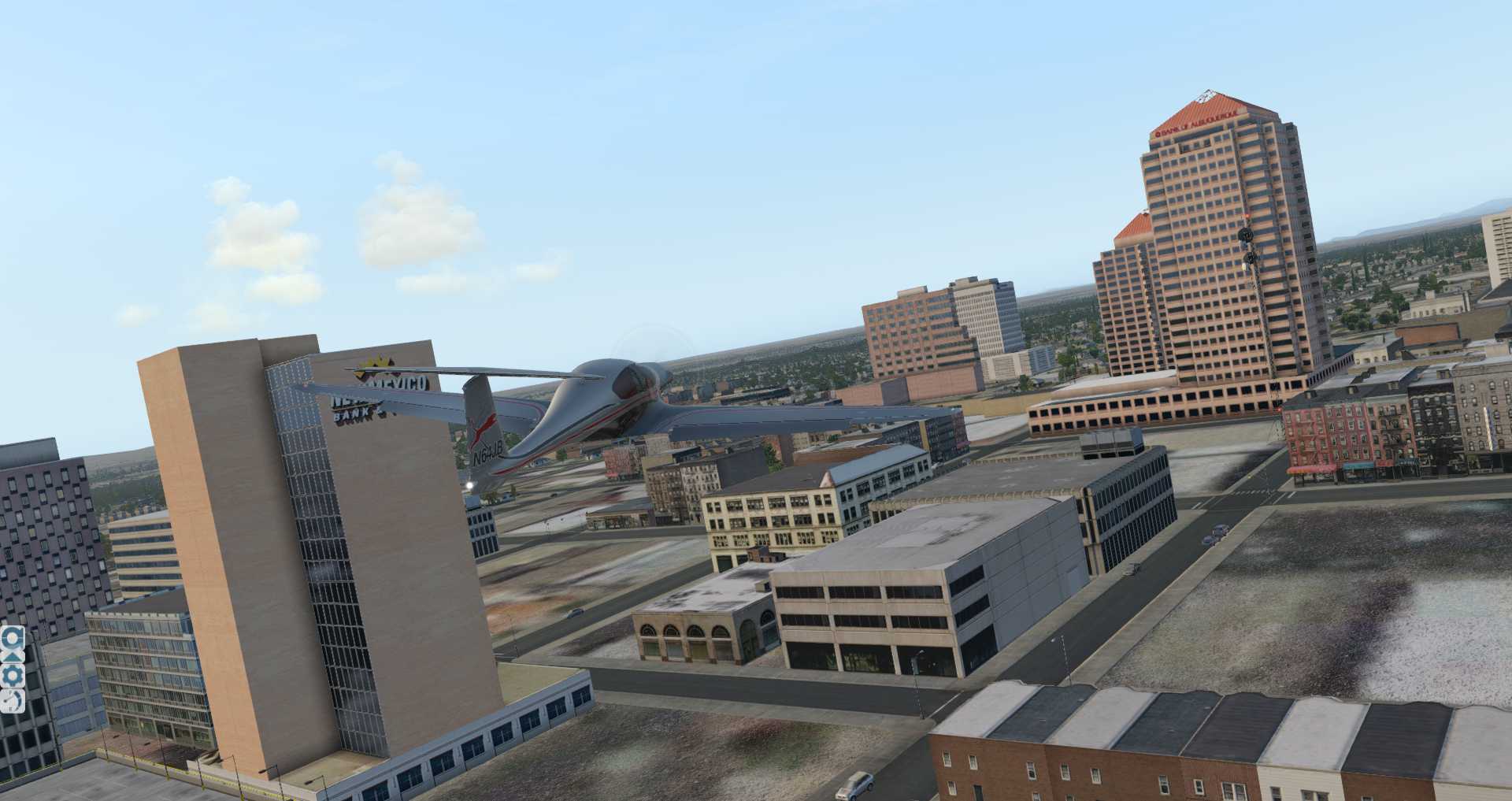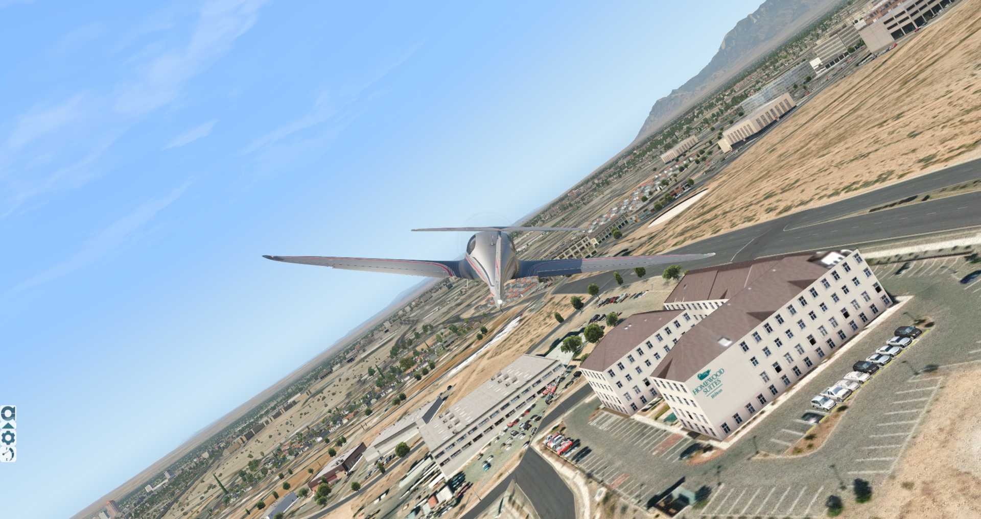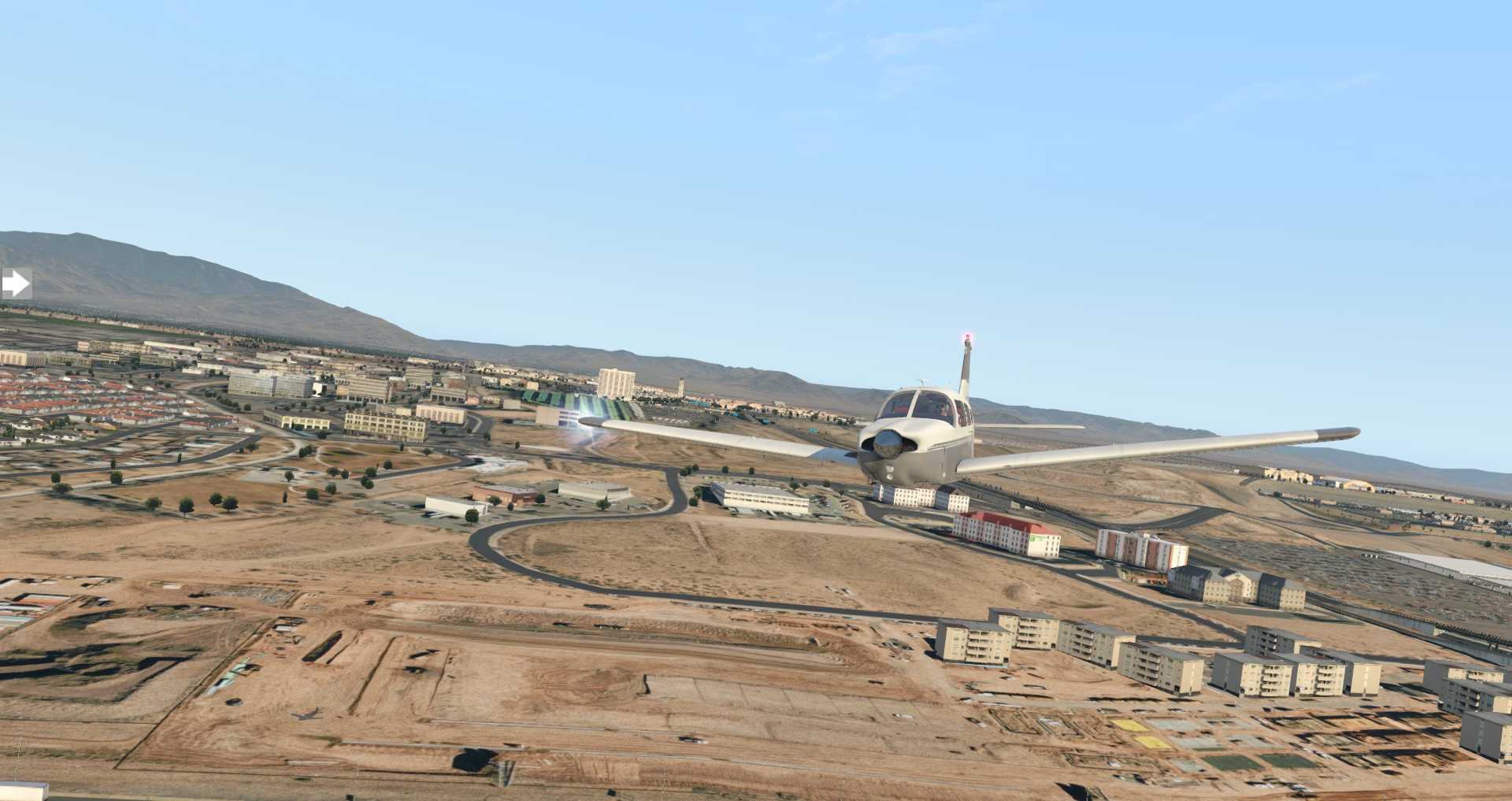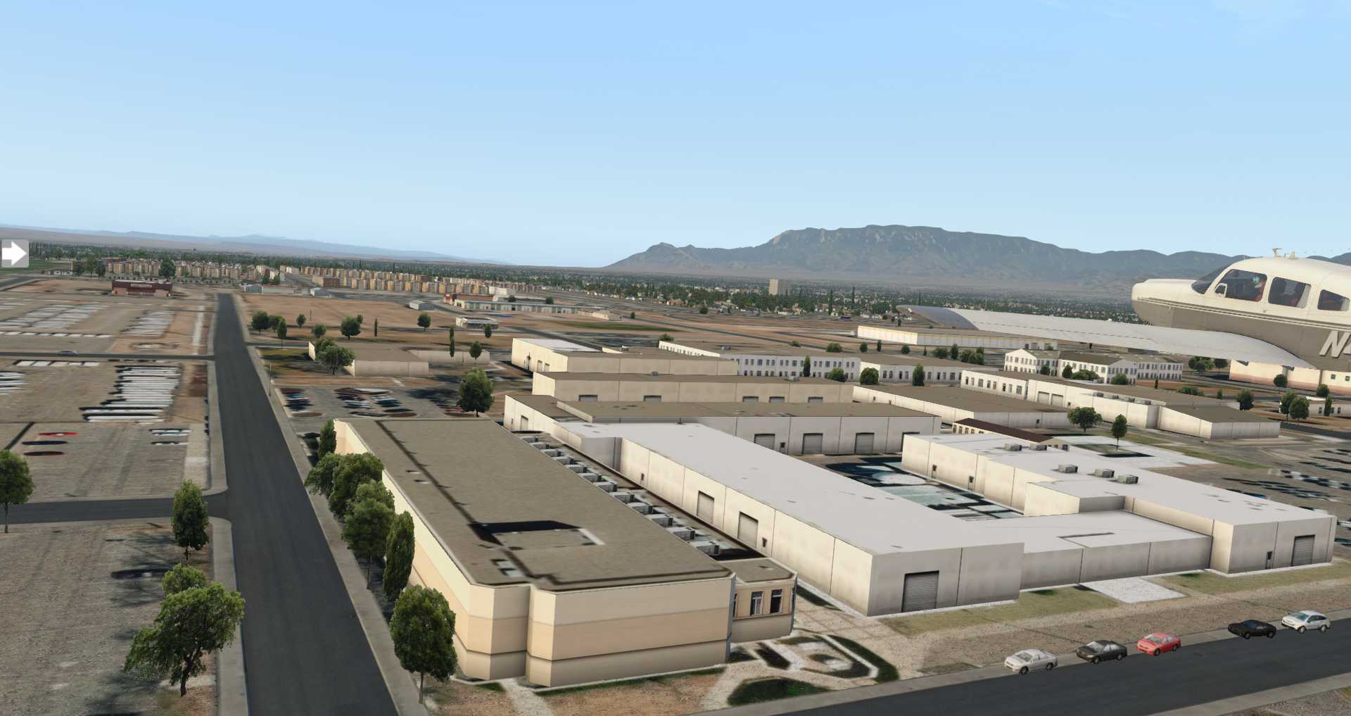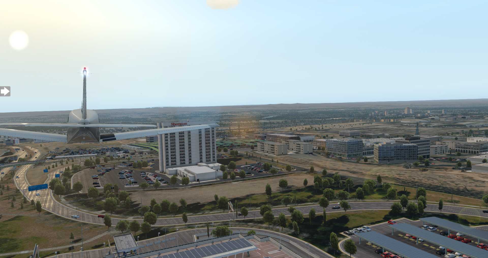 Die Szenerie sieht in weiten Bereichen ausgesprochen real aus. Erst nach dem Überfliegen des militärischen Bereich des Flughafens sehen wir, dass natürlich auch ein Meister tricksen muss. Erhebliche Teil der Stadt bestehen aus dem aktualisierten AutoGen von X-Plane 11.10. Erst wenn wir zurück zum Flughafen fliegen und das Sheraton Hotel passieren bemerken wir die komplexen Zufahrtsstraßen, die unseren Blick in die Ferne leiten. Von der Anhöhe herunter, auf welcher der Flughafen gebaut wurde. Hinunter ins Tal, nach Albuquerque selbst.