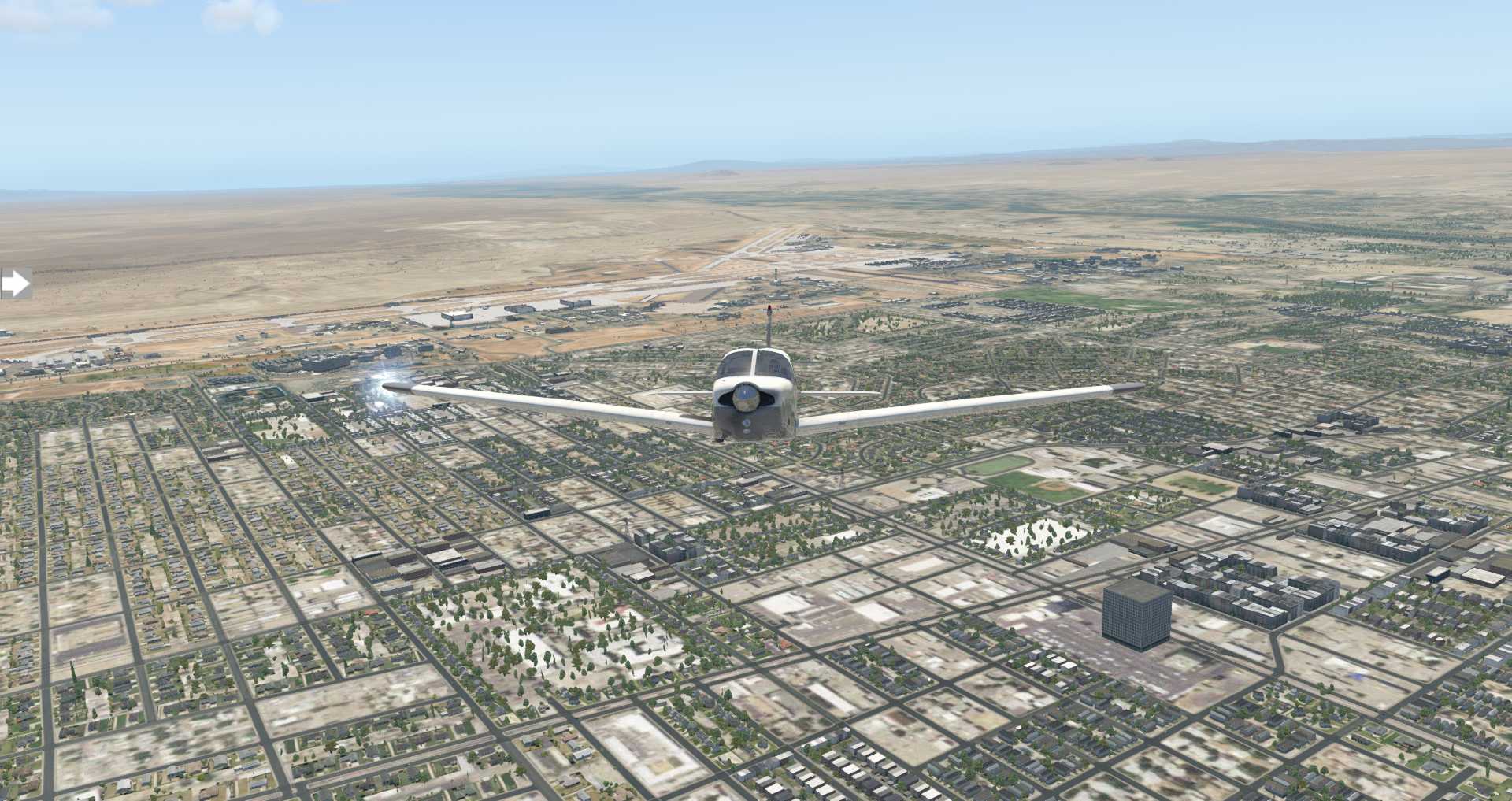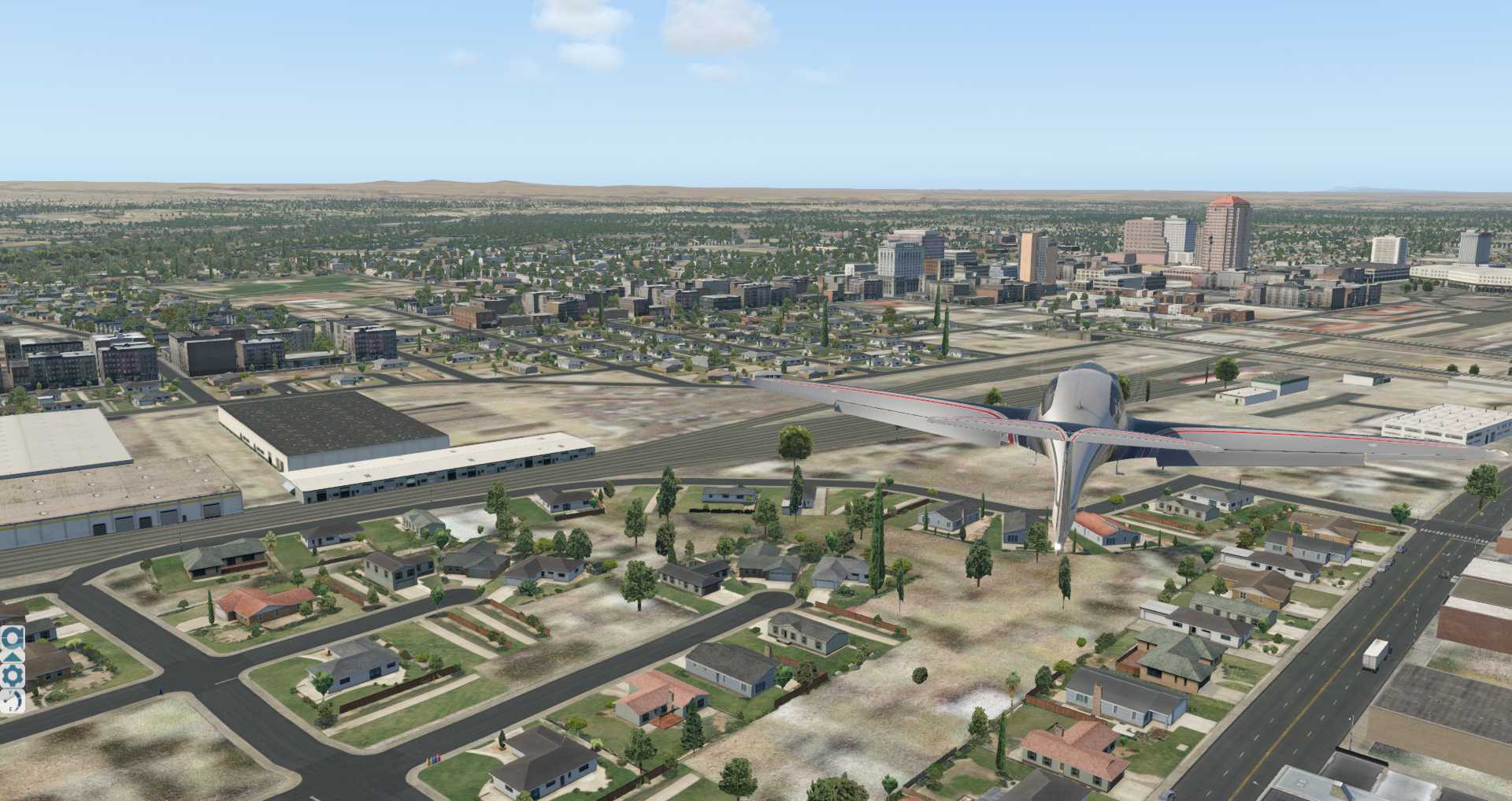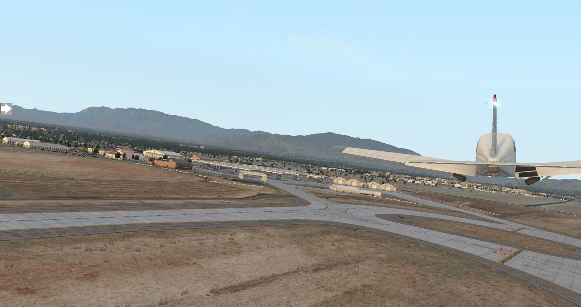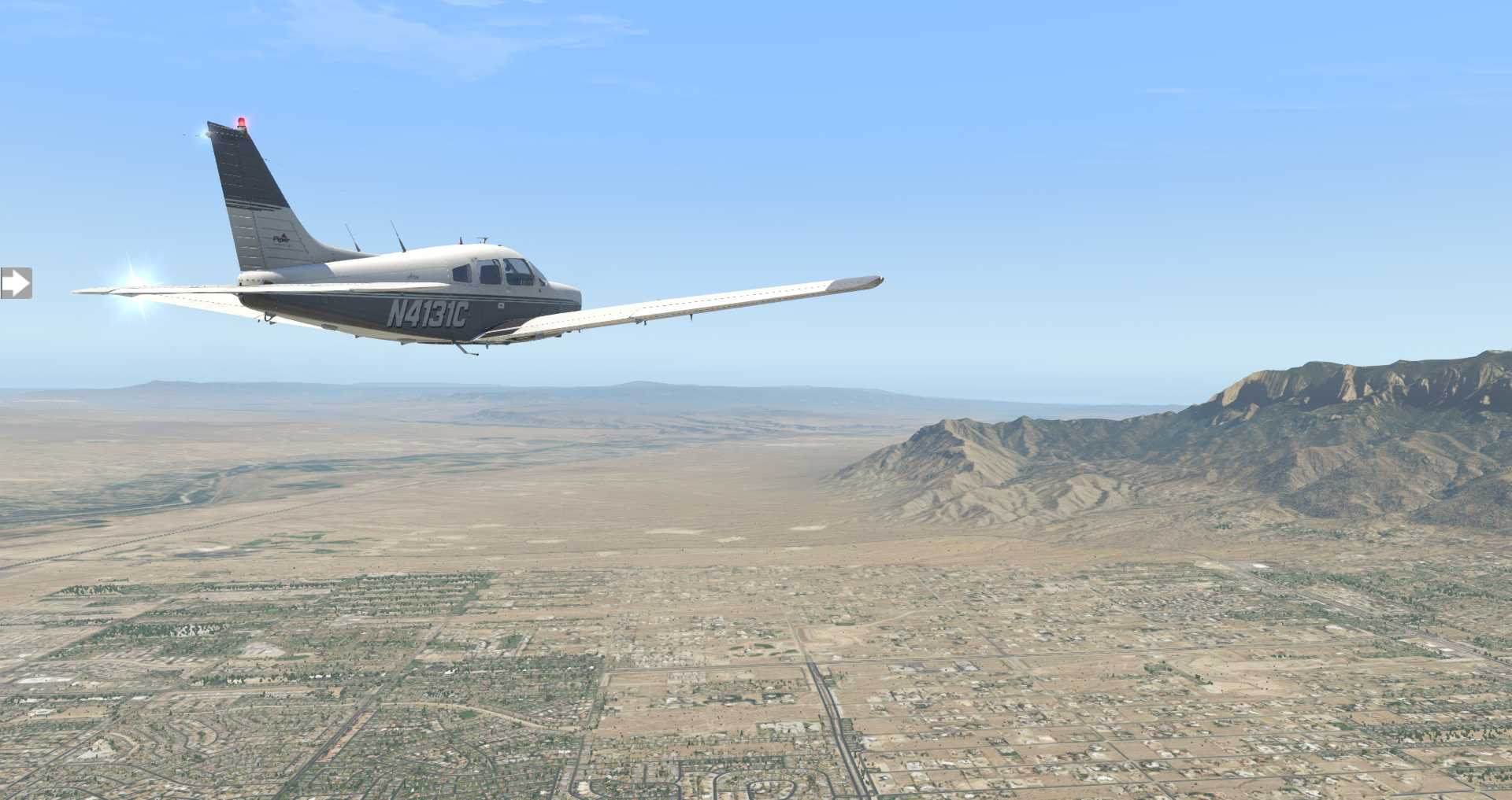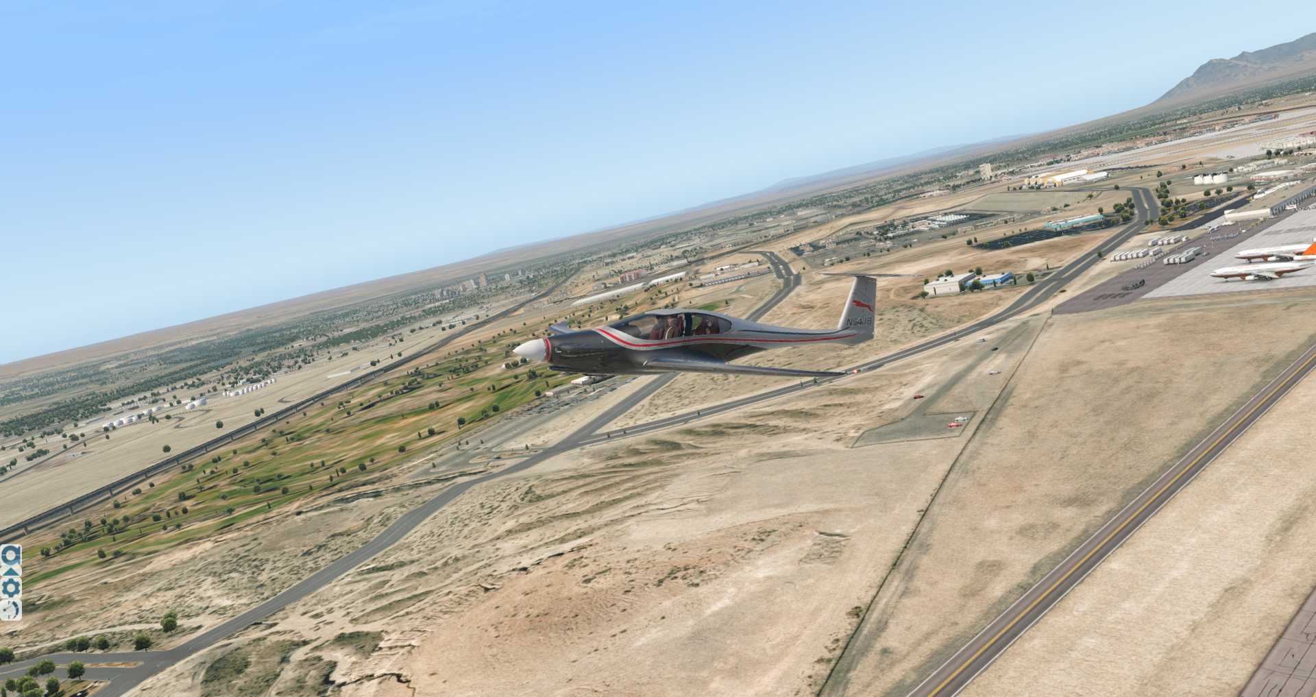 Die Szenerie sieht in weiten Bereichen ausgesprochen real aus. Erst nach dem Überfliegen des militärischen Bereich des Flughafens sehen wir, dass natürlich auch ein Meister tricksen muss. Erhebliche Teil der Stadt bestehen aus dem aktualisierten AutoGen von X-Plane 11.10. Erst wenn wir zurück zum Flughafen fliegen und das Sheraton Hotel passieren bemerken wir die komplexen Zufahrtsstraßen, die unseren Blick in die Ferne leiten. Von der Anhöhe herunter, auf welcher der Flughafen gebaut wurde. Hinunter ins Tal, nach Albuquerque selbst.