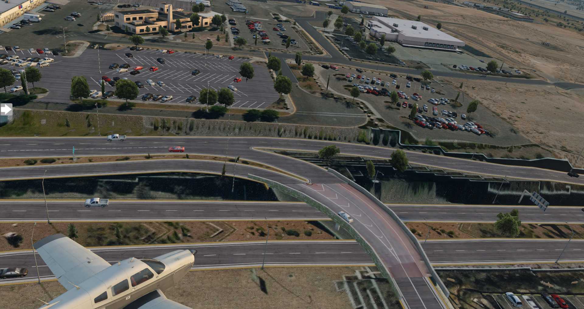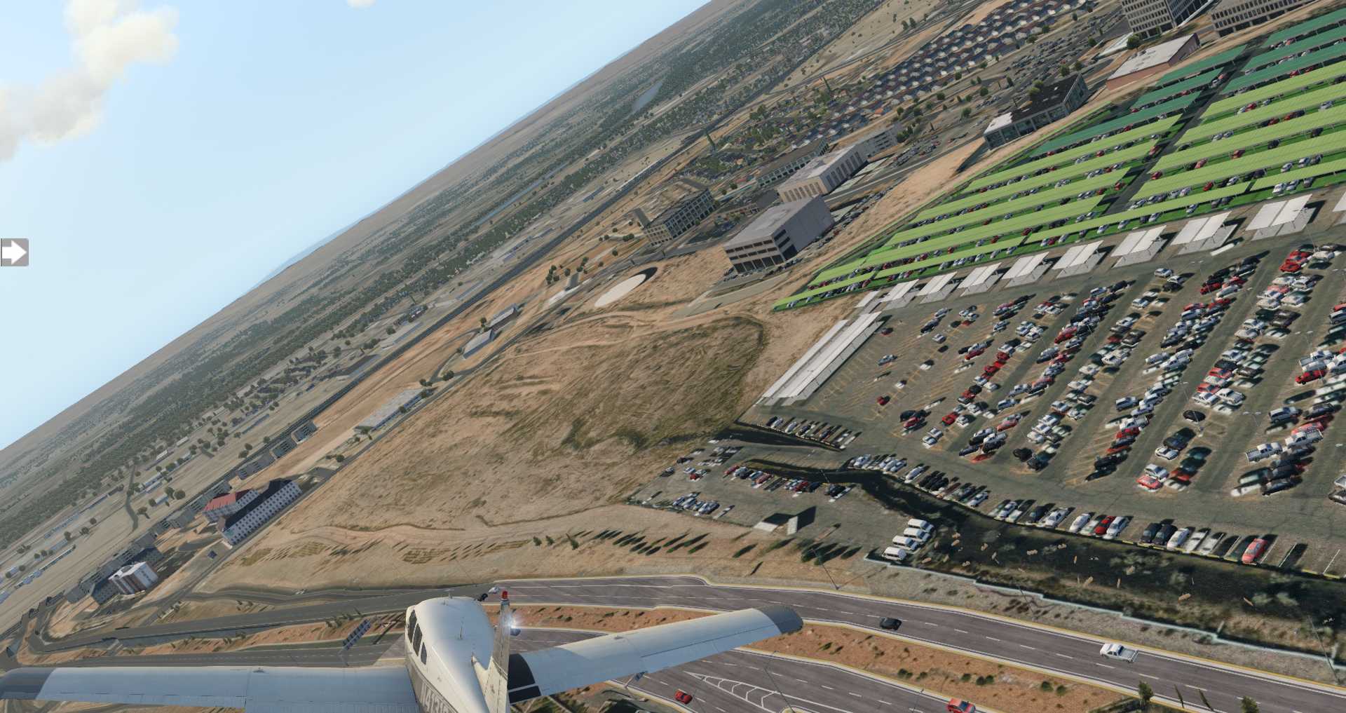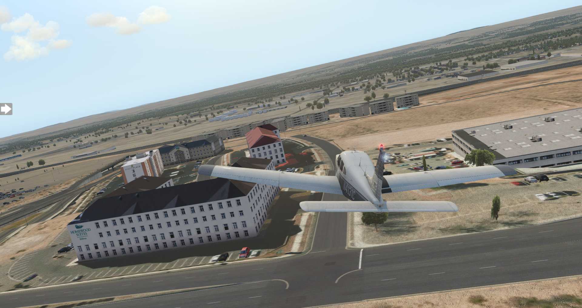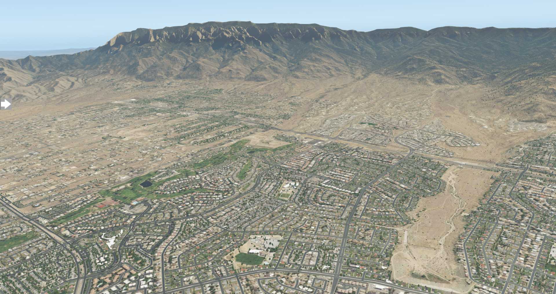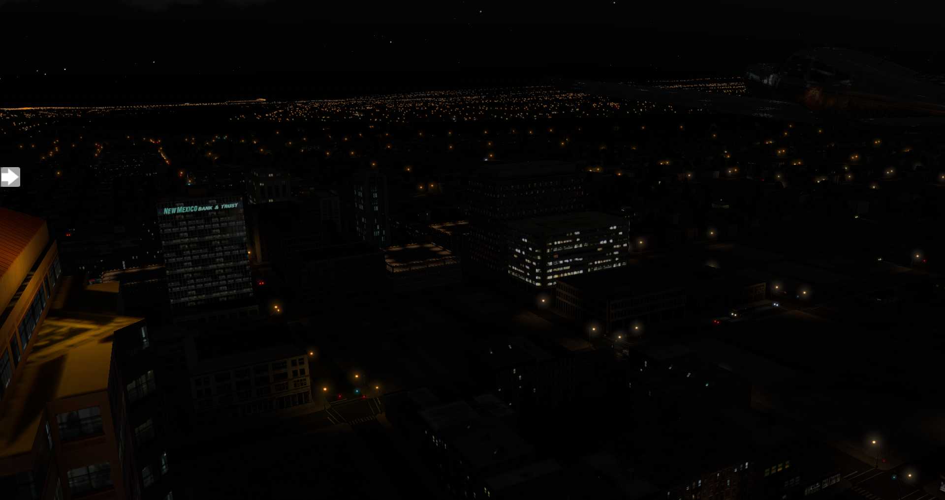 Die Szenerie sieht in weiten Bereichen ausgesprochen real aus. Erst nach dem Überfliegen des militärischen Bereich des Flughafens sehen wir, dass natürlich auch ein Meister tricksen muss. Erhebliche Teil der Stadt bestehen aus dem aktualisierten AutoGen von X-Plane 11.10. Erst wenn wir zurück zum Flughafen fliegen und das Sheraton Hotel passieren bemerken wir die komplexen Zufahrtsstraßen, die unseren Blick in die Ferne leiten. Von der Anhöhe herunter, auf welcher der Flughafen gebaut wurde. Hinunter ins Tal, nach Albuquerque selbst.