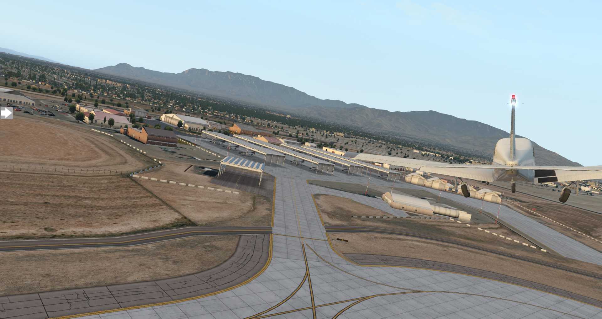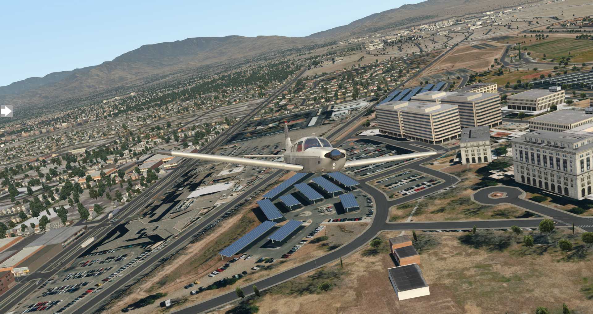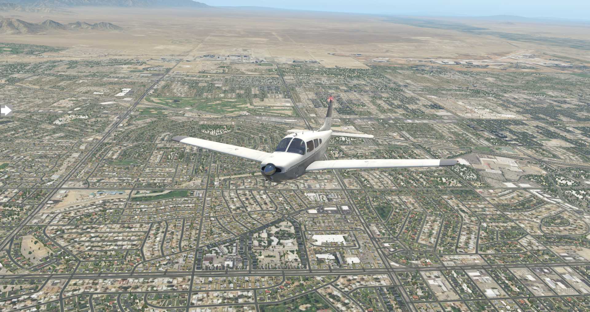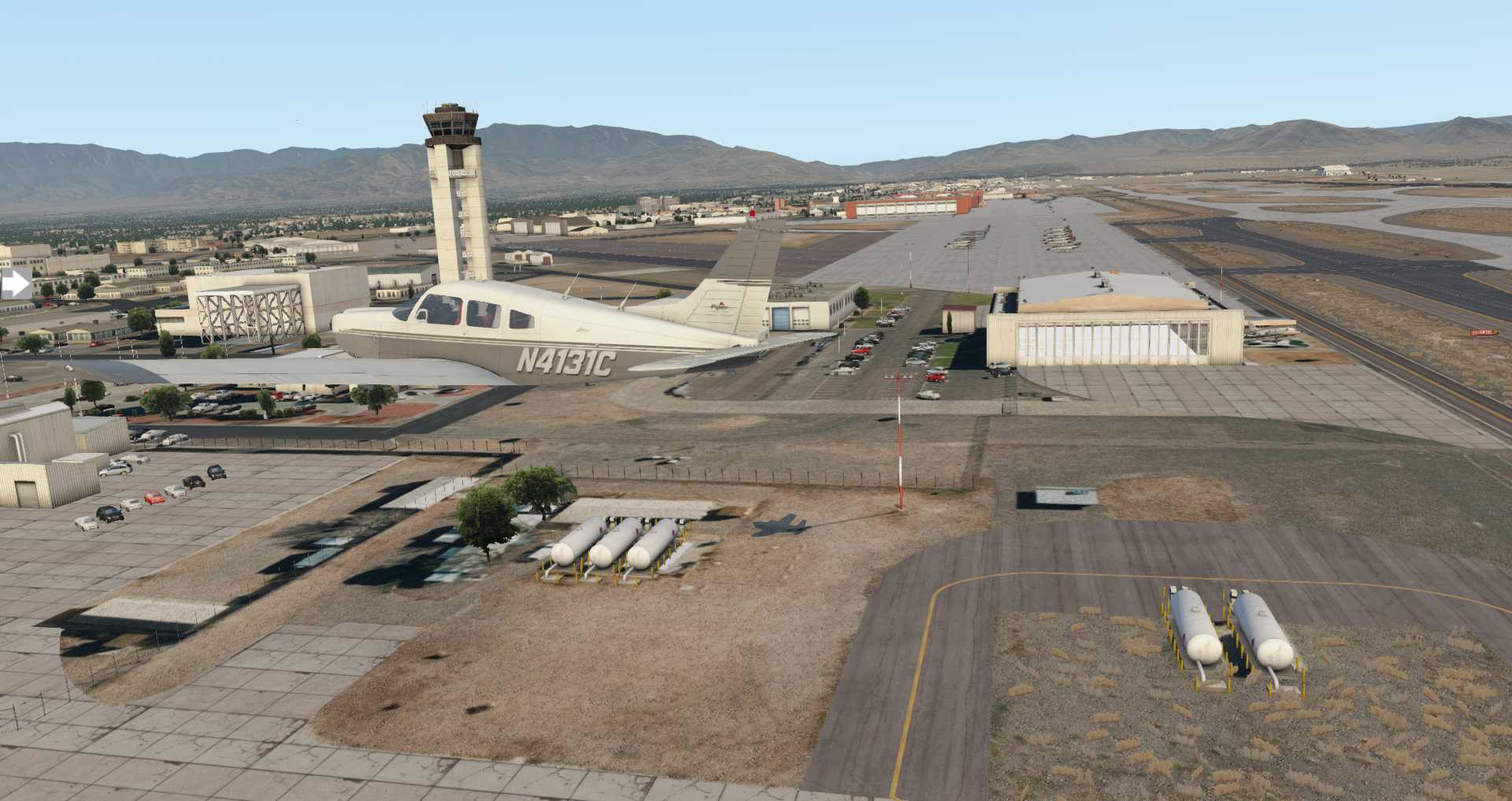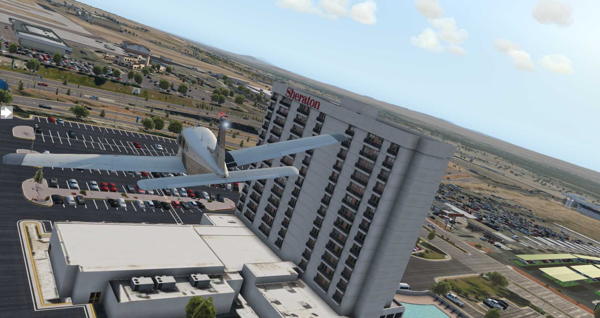 Die Szenerie sieht in weiten Bereichen ausgesprochen real aus. Erst nach dem Überfliegen des militärischen Bereich des Flughafens sehen wir, dass natürlich auch ein Meister tricksen muss. Erhebliche Teil der Stadt bestehen aus dem aktualisierten AutoGen von X-Plane 11.10. Erst wenn wir zurück zum Flughafen fliegen und das Sheraton Hotel passieren bemerken wir die komplexen Zufahrtsstraßen, die unseren Blick in die Ferne leiten. Von der Anhöhe herunter, auf welcher der Flughafen gebaut wurde. Hinunter ins Tal, nach Albuquerque selbst.