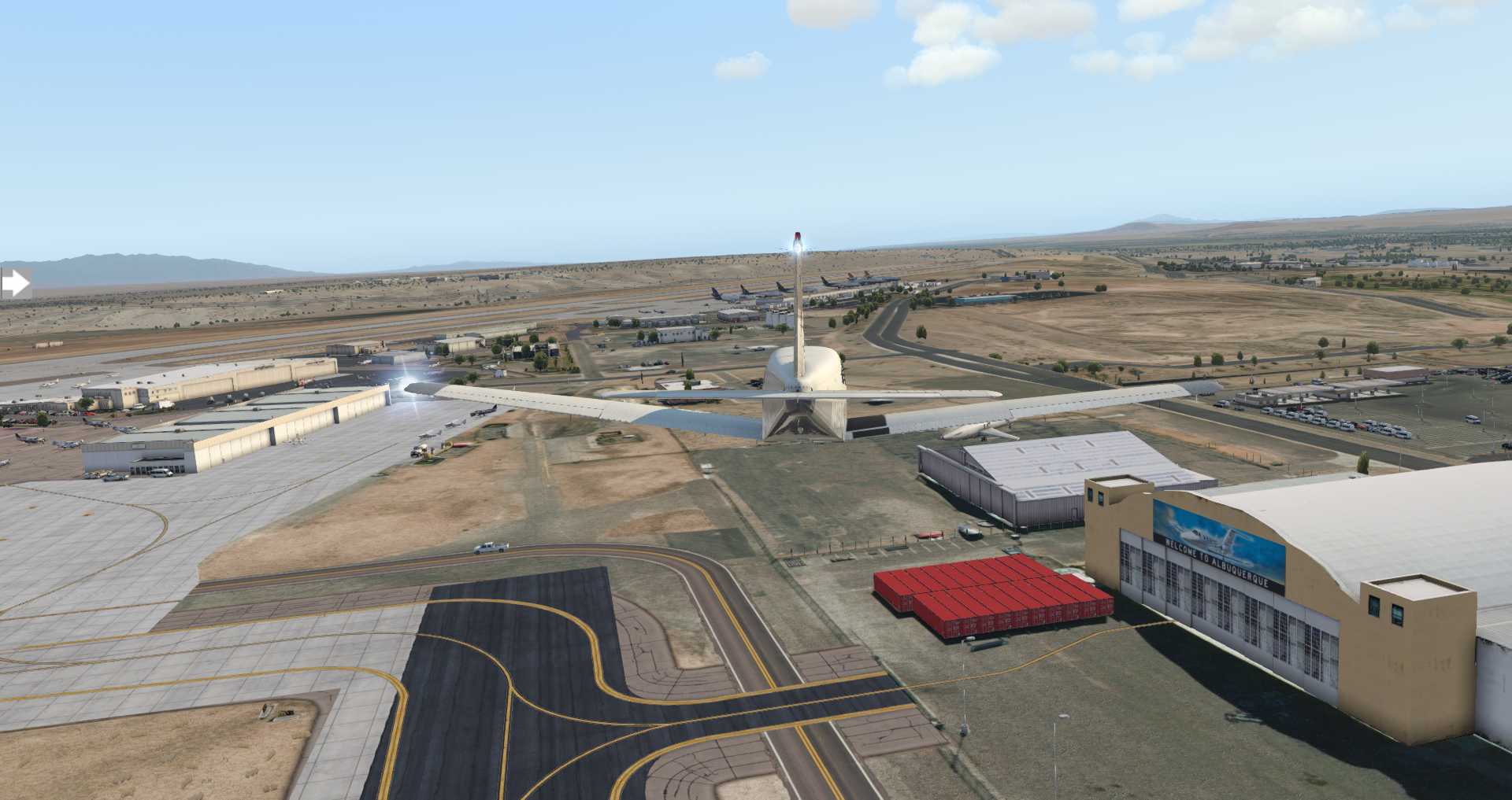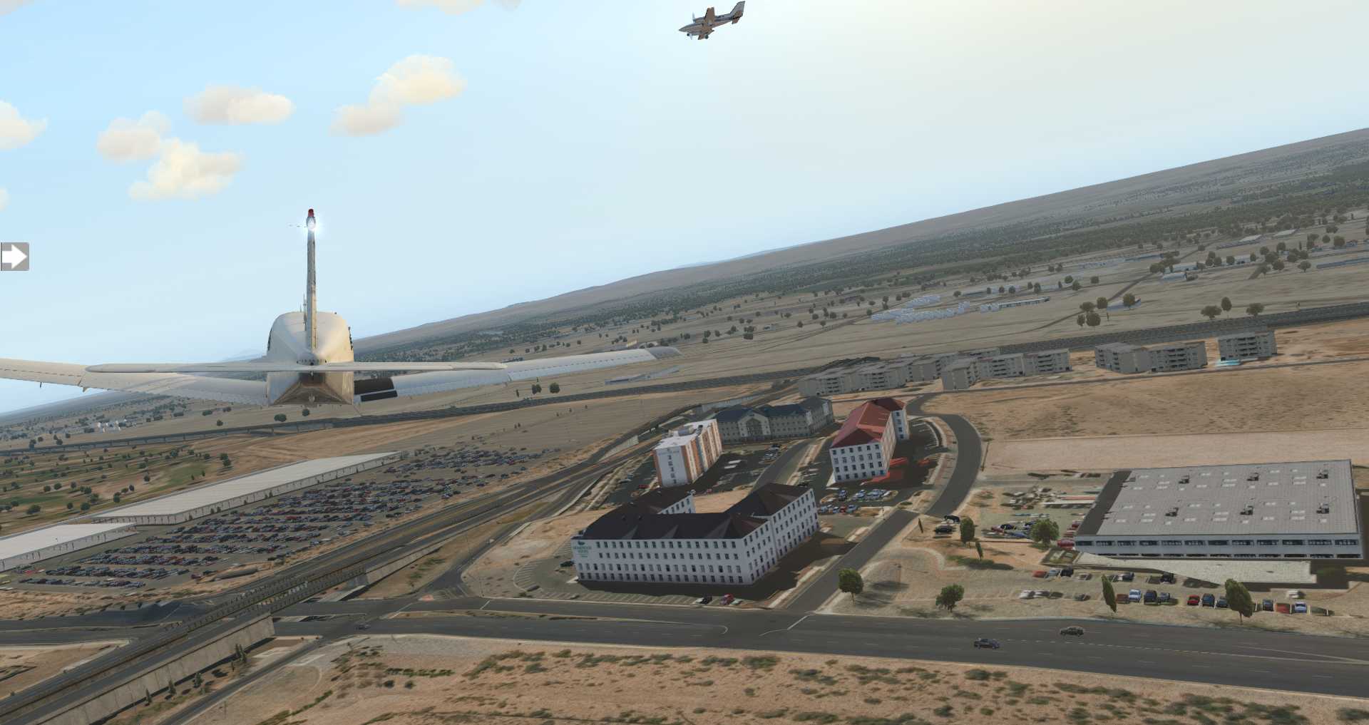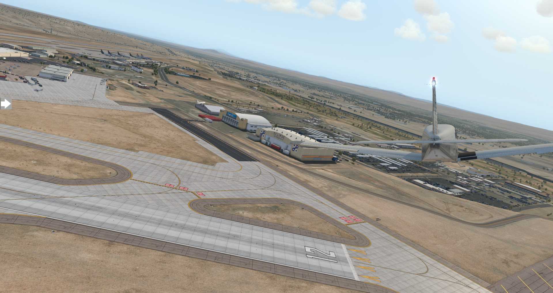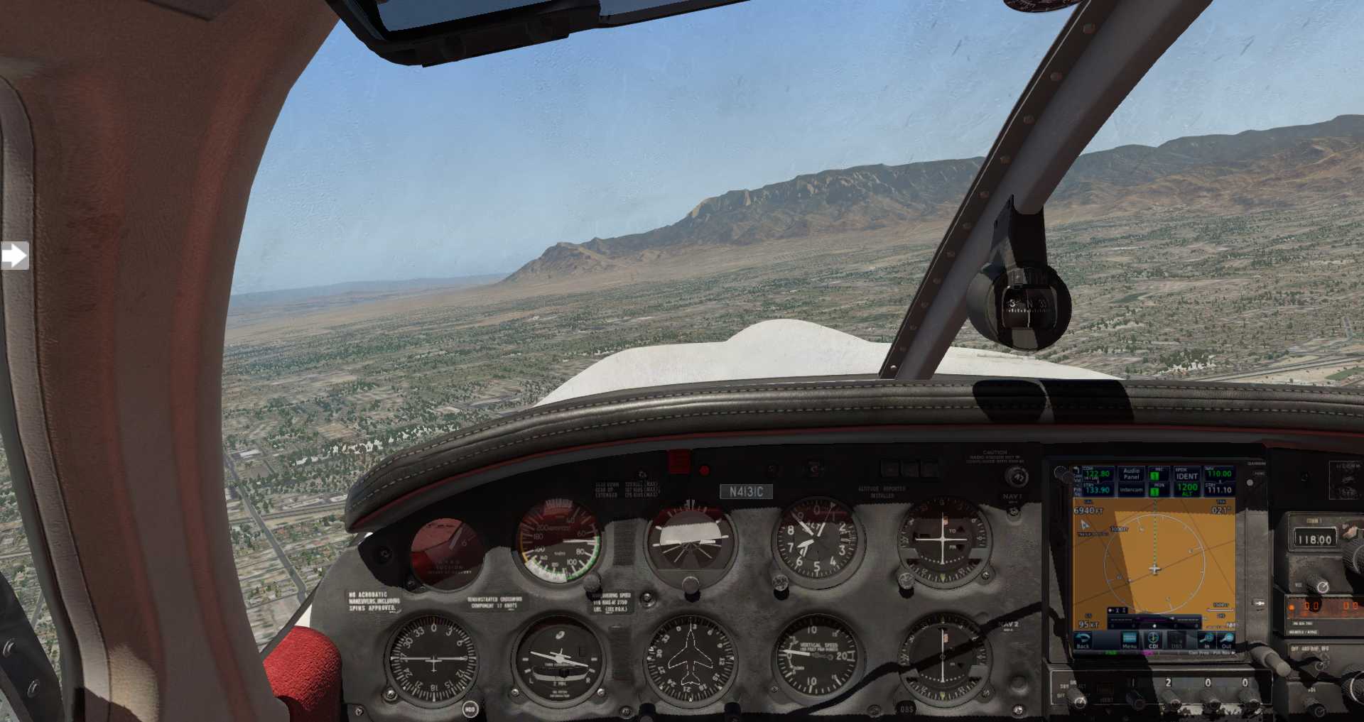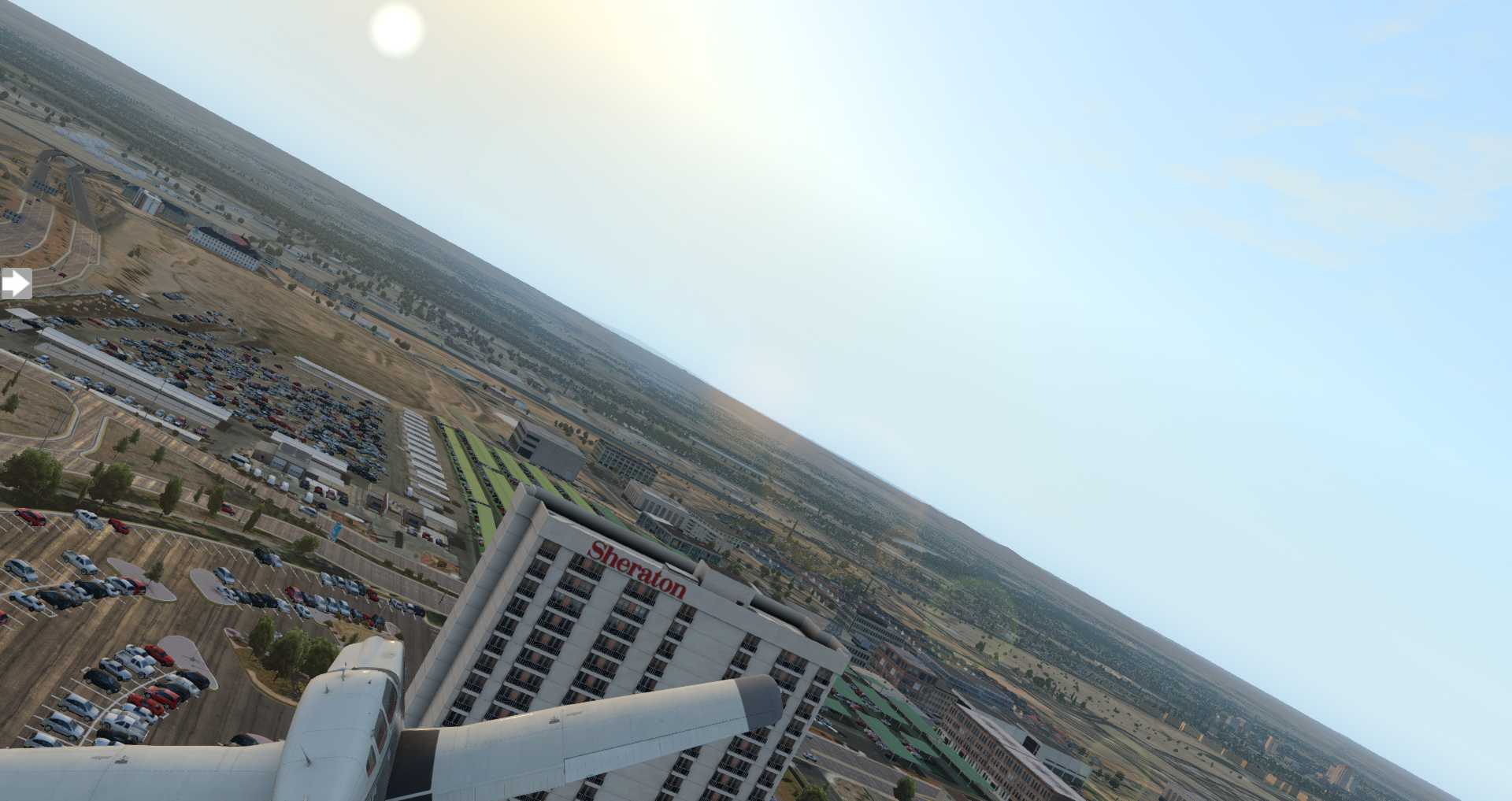 Die Szenerie sieht in weiten Bereichen ausgesprochen real aus. Erst nach dem Überfliegen des militärischen Bereich des Flughafens sehen wir, dass natürlich auch ein Meister tricksen muss. Erhebliche Teil der Stadt bestehen aus dem aktualisierten AutoGen von X-Plane 11.10. Erst wenn wir zurück zum Flughafen fliegen und das Sheraton Hotel passieren bemerken wir die komplexen Zufahrtsstraßen, die unseren Blick in die Ferne leiten. Von der Anhöhe herunter, auf welcher der Flughafen gebaut wurde. Hinunter ins Tal, nach Albuquerque selbst.