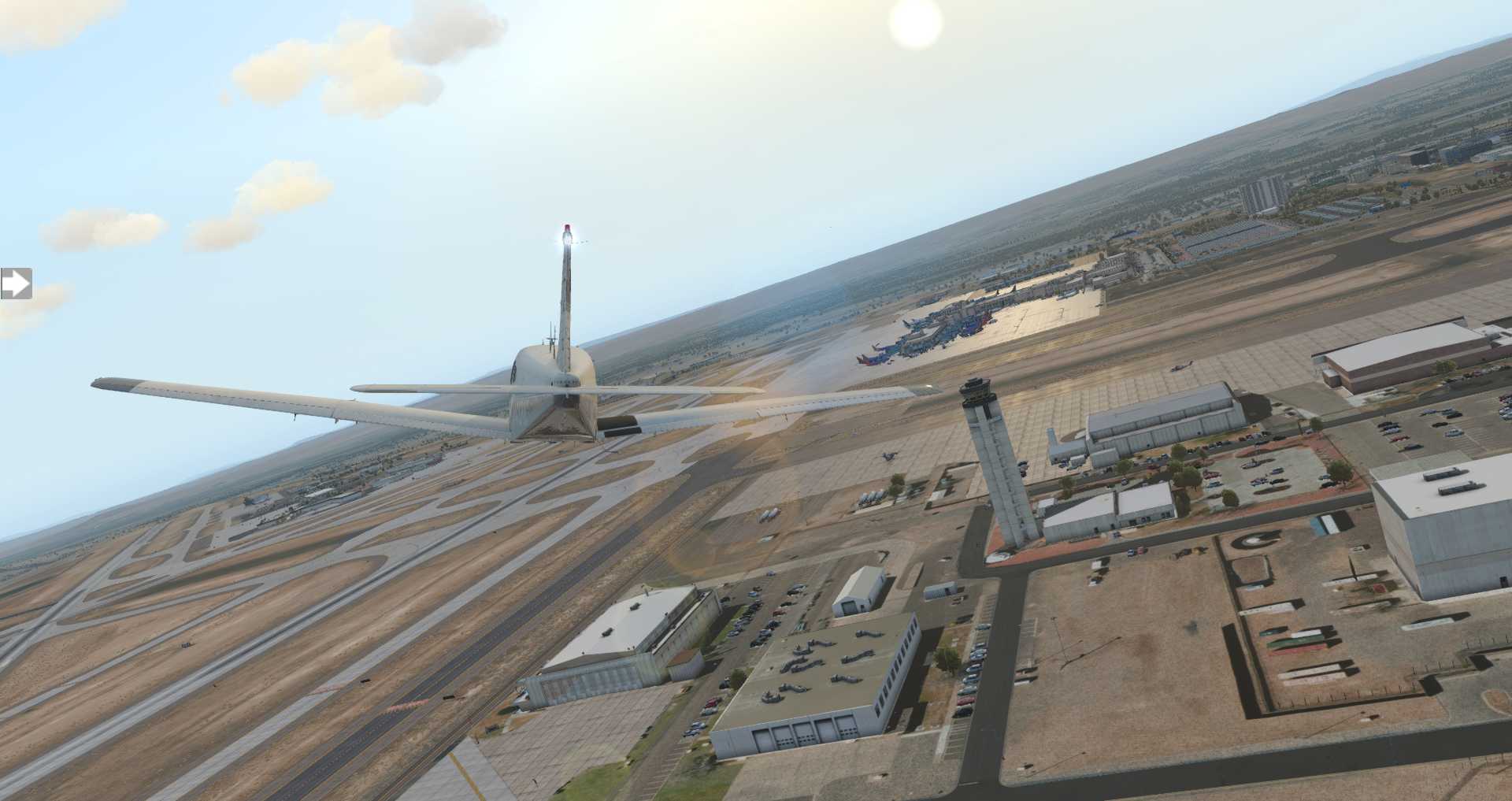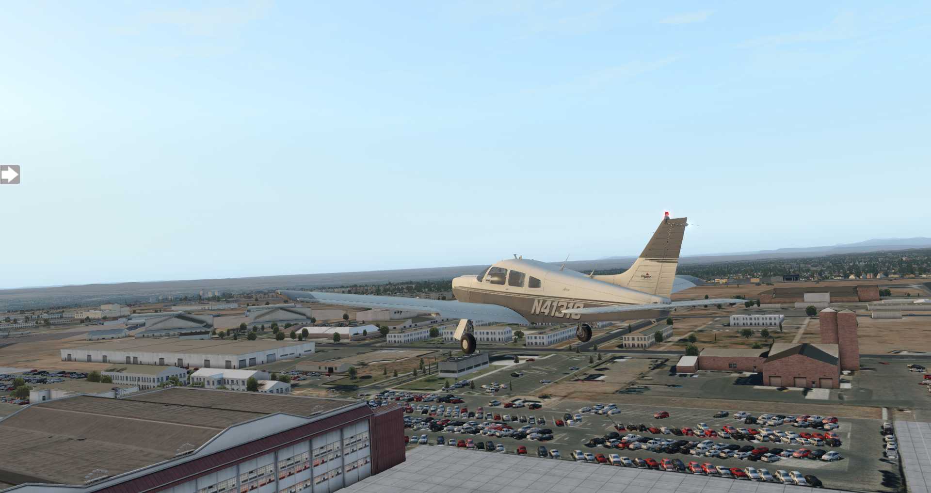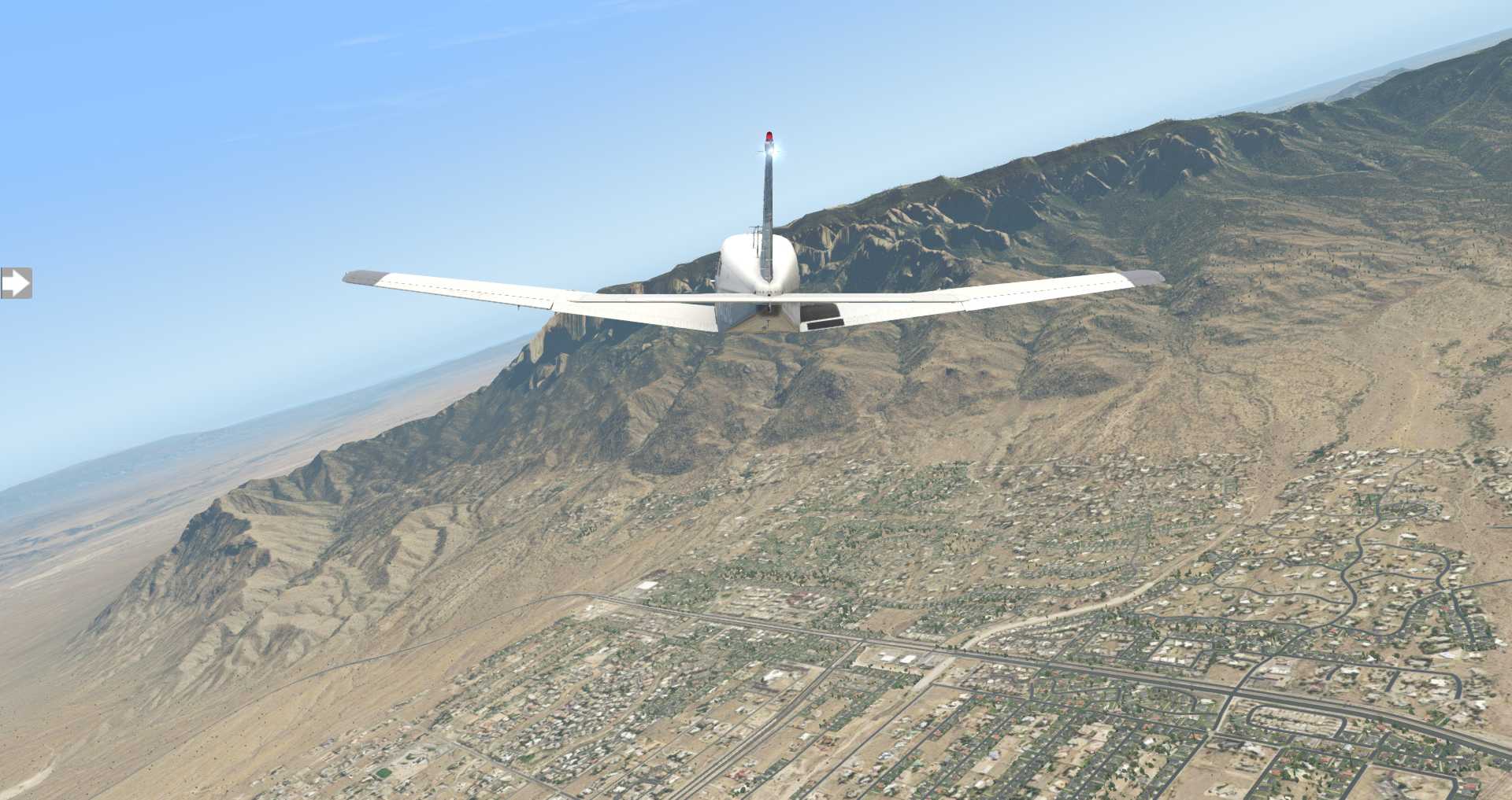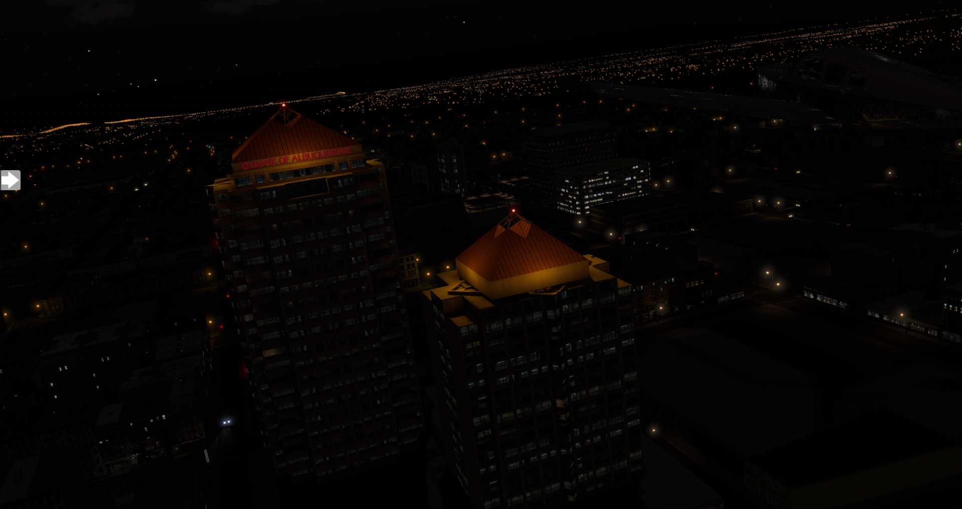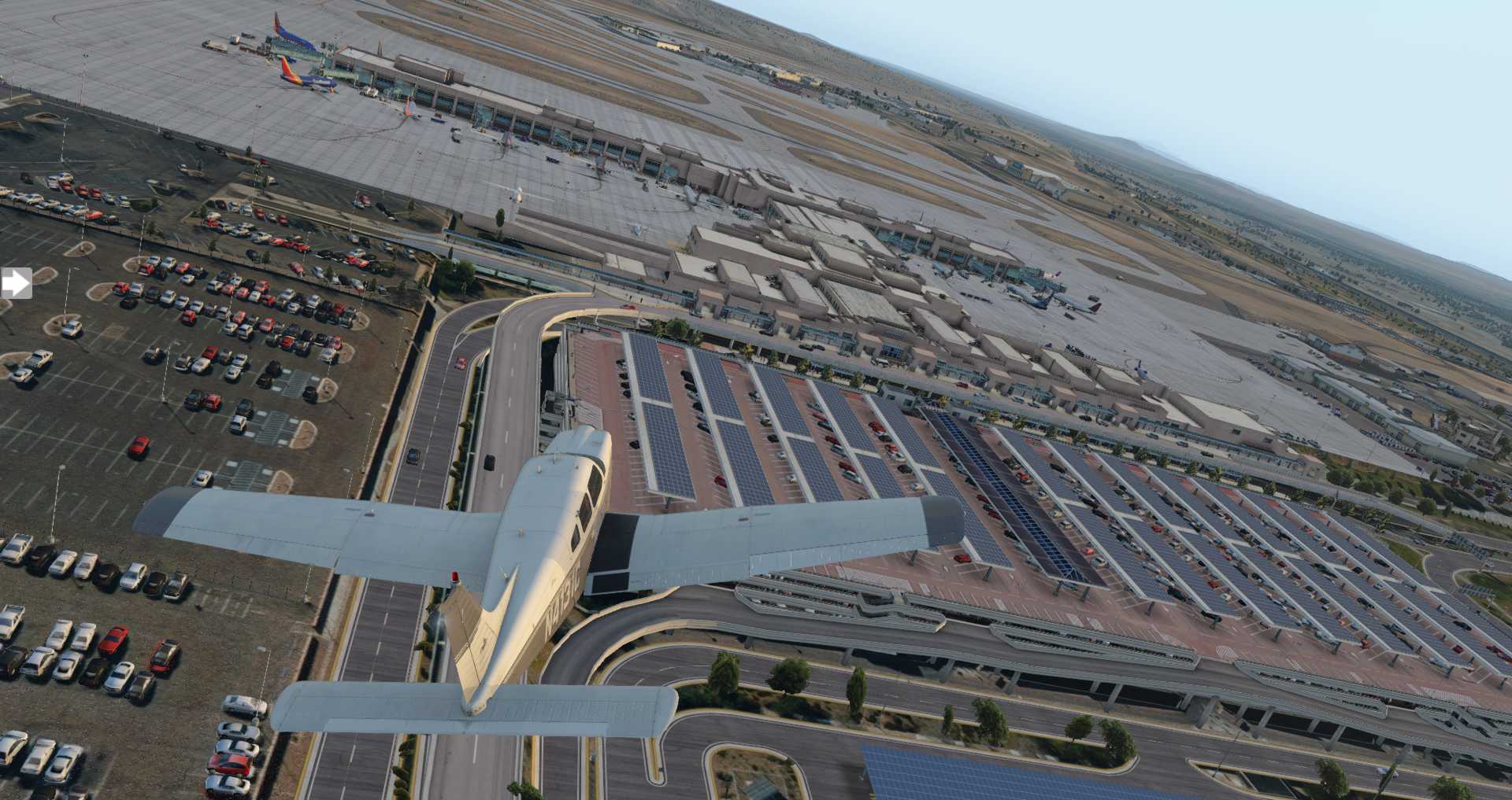 Die Szenerie sieht in weiten Bereichen ausgesprochen real aus. Erst nach dem Überfliegen des militärischen Bereich des Flughafens sehen wir, dass natürlich auch ein Meister tricksen muss. Erhebliche Teil der Stadt bestehen aus dem aktualisierten AutoGen von X-Plane 11.10. Erst wenn wir zurück zum Flughafen fliegen und das Sheraton Hotel passieren bemerken wir die komplexen Zufahrtsstraßen, die unseren Blick in die Ferne leiten. Von der Anhöhe herunter, auf welcher der Flughafen gebaut wurde. Hinunter ins Tal, nach Albuquerque selbst.