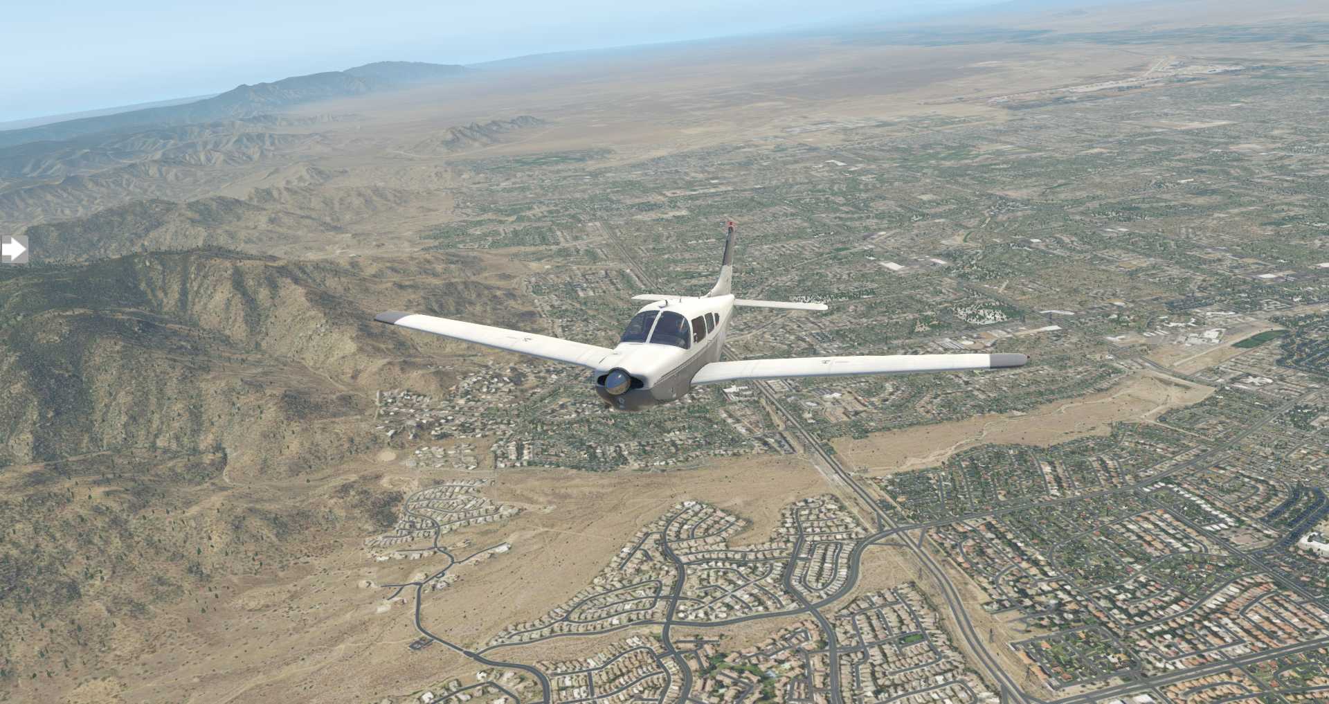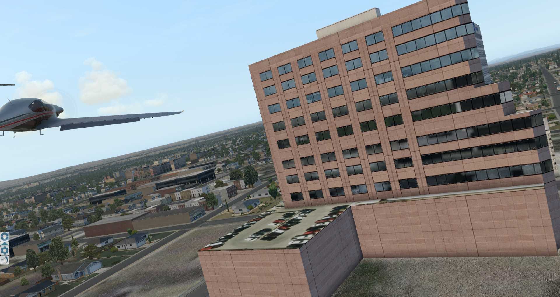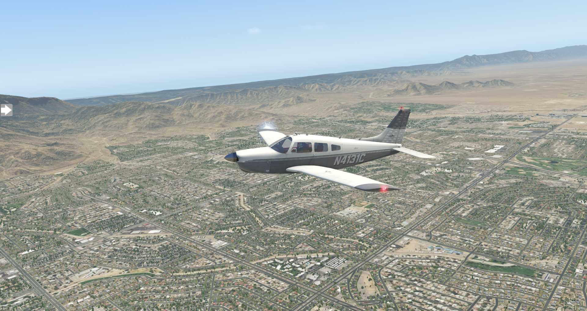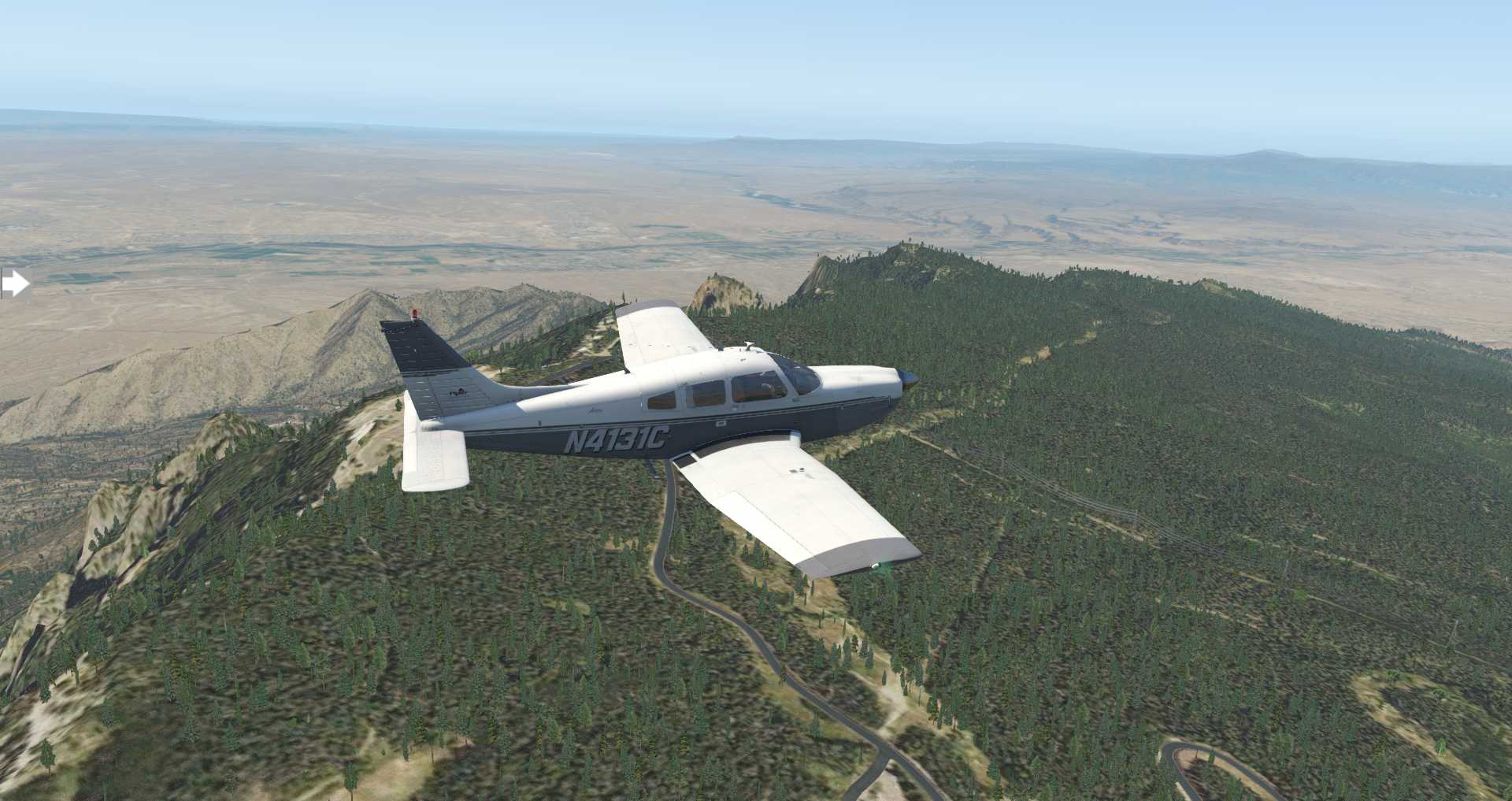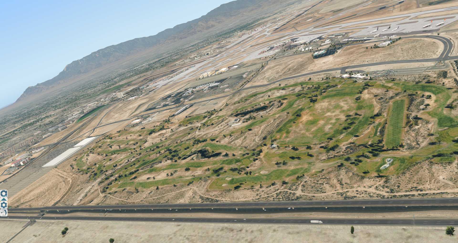 Die Szenerie sieht in weiten Bereichen ausgesprochen real aus. Erst nach dem Überfliegen des militärischen Bereich des Flughafens sehen wir, dass natürlich auch ein Meister tricksen muss. Erhebliche Teil der Stadt bestehen aus dem aktualisierten AutoGen von X-Plane 11.10. Erst wenn wir zurück zum Flughafen fliegen und das Sheraton Hotel passieren bemerken wir die komplexen Zufahrtsstraßen, die unseren Blick in die Ferne leiten. Von der Anhöhe herunter, auf welcher der Flughafen gebaut wurde. Hinunter ins Tal, nach Albuquerque selbst.