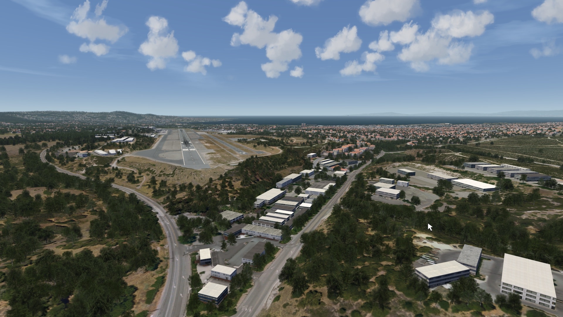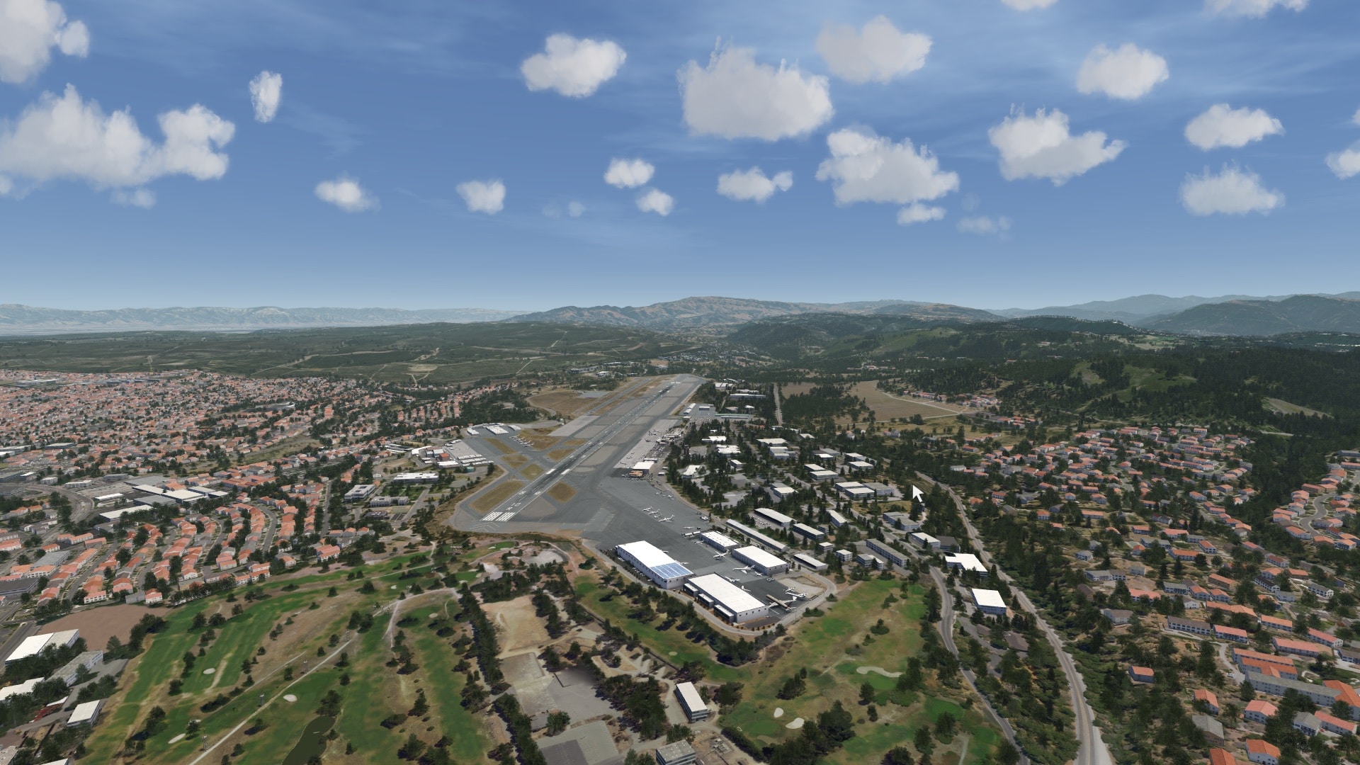 Ein paar Übersichtsbilder des Flugplatzes. Am Flugplatz selbst lassen sich keine großen Unterschiede identifizieren, aber im Hintergrund deutlich zu sehen sind die vielen roten Dächer der Stadt bei Aerofly FS2.