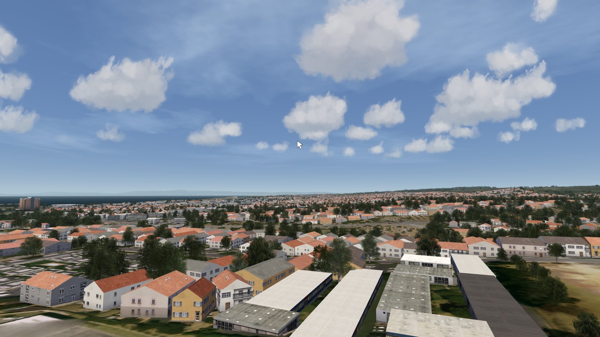 Hier zum Vergleich eine Runde in Prepar3d V4. Die Performance ist wie erwartet nicht ganz so gut (die Einstellungen waren auch etwas zu hoch für Stereo), aber für mein Empfinden sind die Autogen-Gebäude deutlich realistischer. Das zeigt auch G**gle Earth, das ich hier aus Lizenzgründen nicht abbilden kann. Unplausibel sehen beide Fassungen aber nicht aus.