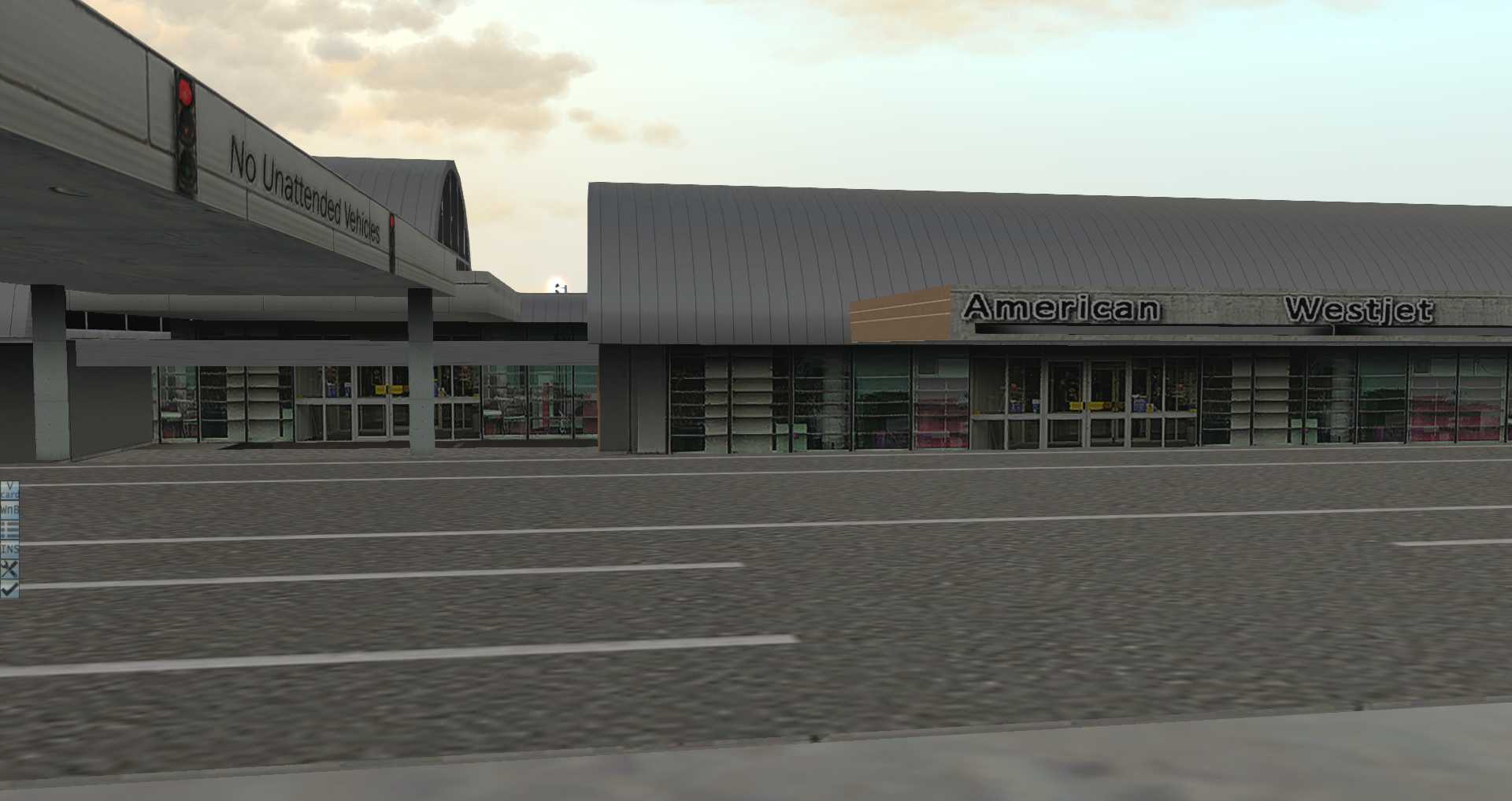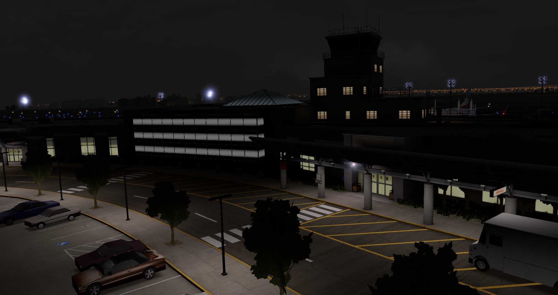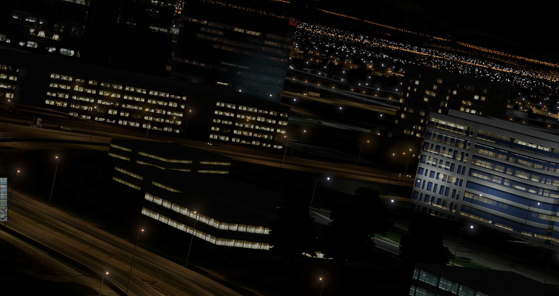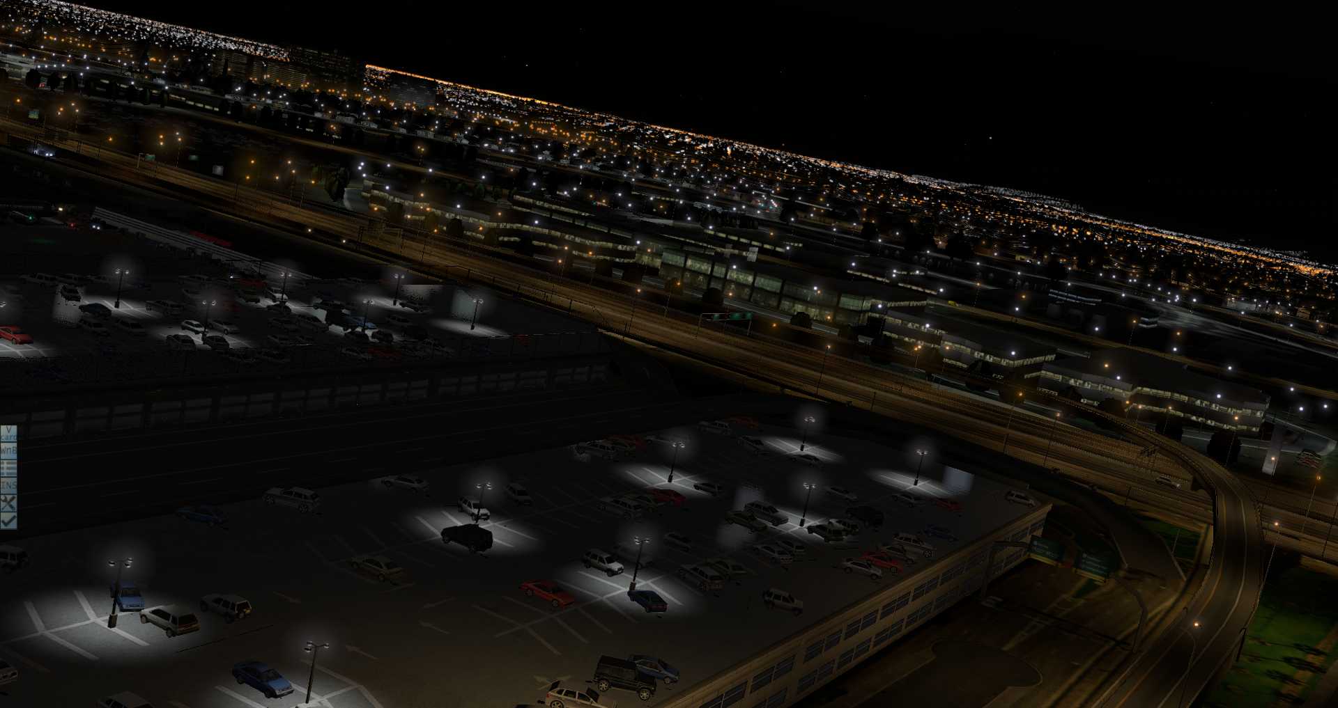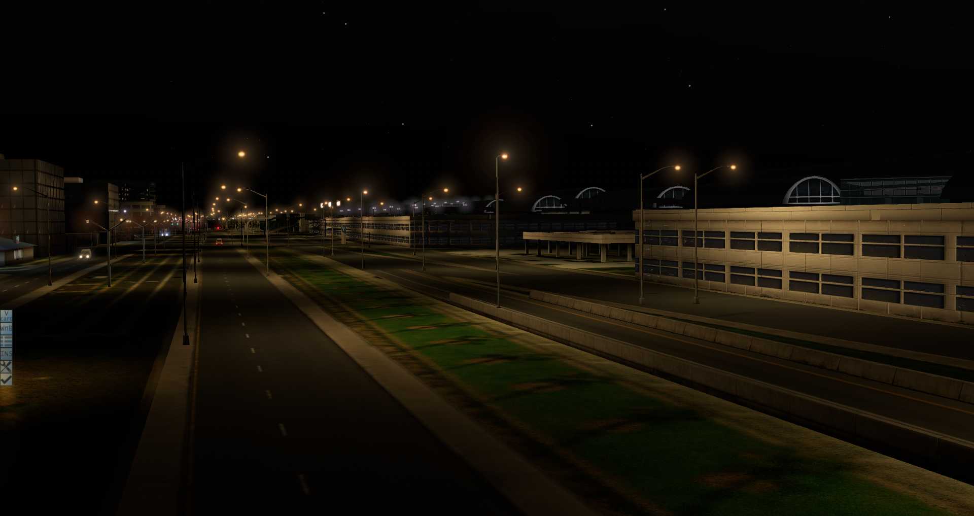 Auch vor dem Eingang wurde sorgfältig gearbeitet. Schilder sind an ihren Platz, Auffahrten sitzen richtig, Die Nachttexturen der Bürohäuser bilden zusammen wieder einmal ein Eindrucksvolles Szenario, wie auch im Innenbereich. Für Skyline ist es außerdem eine Ehrensache selbst kleine Radarantennen, wie auf dem Tower rotieren zu lassen. Solche Dinge wie AutoGate sind hier auch selbstverständlich.